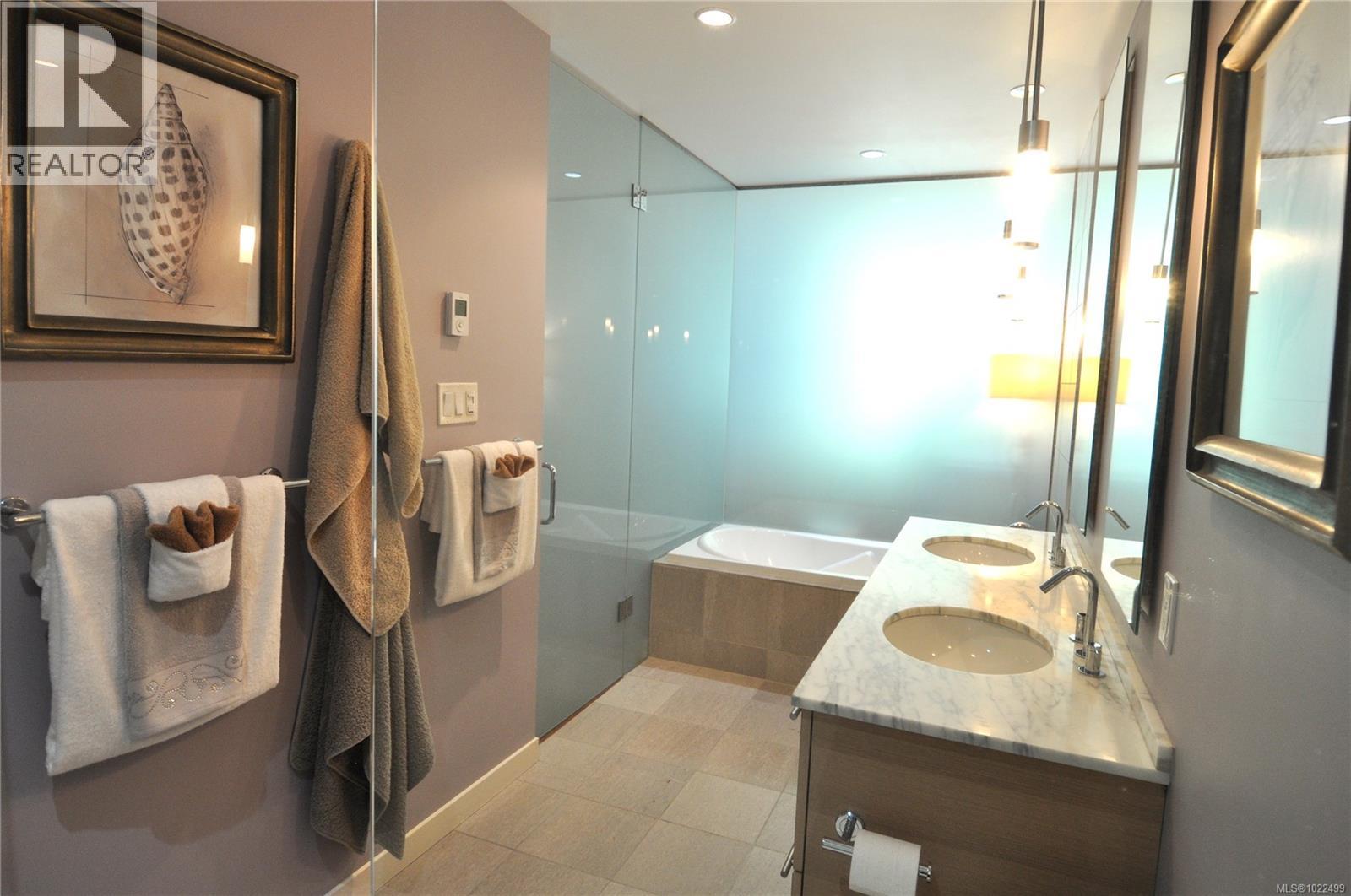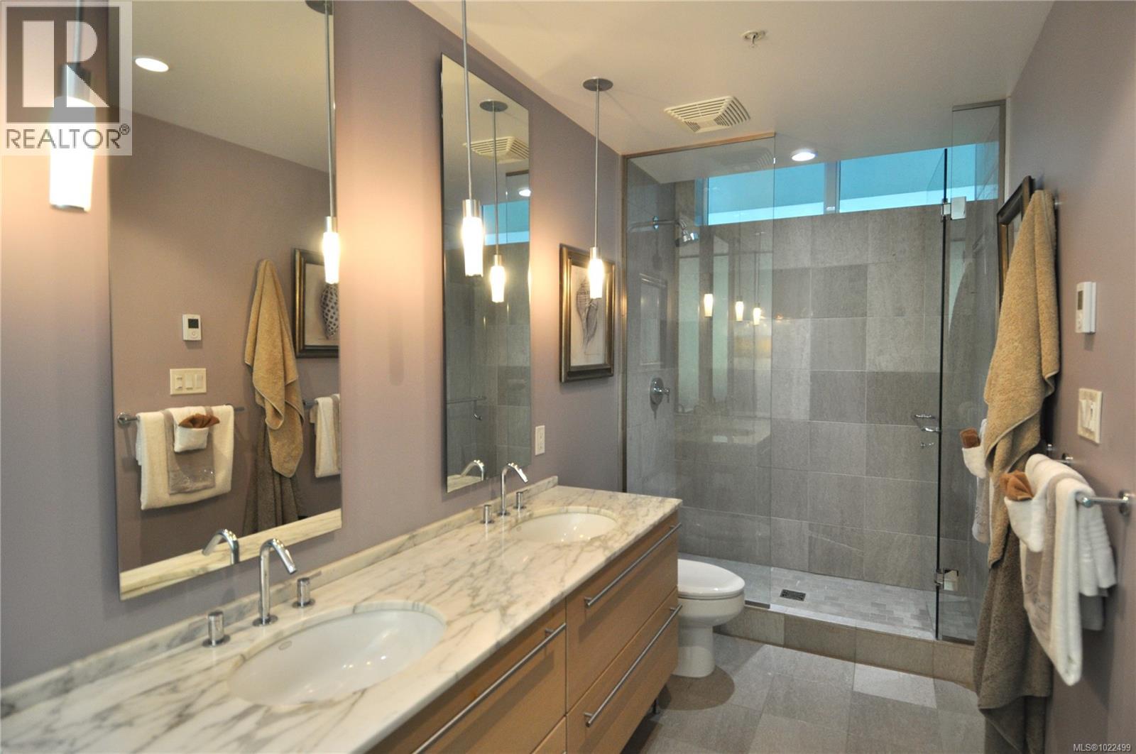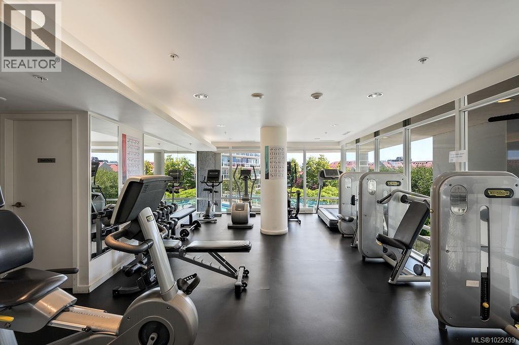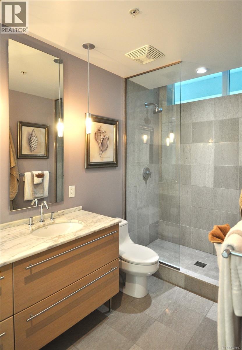 $773 MonthlyBEST of the SONGHEES - Discover Shutters Residences - A prestigious address in Victoria's Inner-Harbour. Premier 3-acre architecturally unique property enhanced by tranquil water gardens and resort-styled amenities: Heated outdoor seasonal lap pool, 2 hot tubs, steam room, sauna & fitness centre available year-round. This exquisite 3rd floor 2 bedroom suite with seasonal Middle-Harbour views comes with striking contemporary interior, 2 full bathrooms-both with transom windows for natural lights, 3 sets of sliding glass doors presenting floor to ceiling windows in living room & both bedrooms, bonus 3 sets of disappearing retractable phantom screens provide energy efficient crossed ventilation to improve air quality and thermal comfort as needed, engineered wood-floors thru-out living/dining, hallway and bedrooms including W-I closet, heated marble floor in spa-liked ensuite, high quality S.S. appliances with granite tops kitchen and 215 S/F entertainment sized balcony with serene views over water garden comes with power and natural gas hose bib for the BBQ and/or Fire Pit to add to the ambience. Come enjoy the beauty of Victoria's vibrant waterfront surrounded by sea-walks, just minutes stroll to downtown yet removed from hustle/bustle of the core. Cycle, kayak, walk - everything is moments from your door. Suite has been used very lightly past number of years - Shows BEAUTIFULLY and priced sensibly well under 2026 BCAA Assessment of $917,000 and available for quick possession! (id:44393)