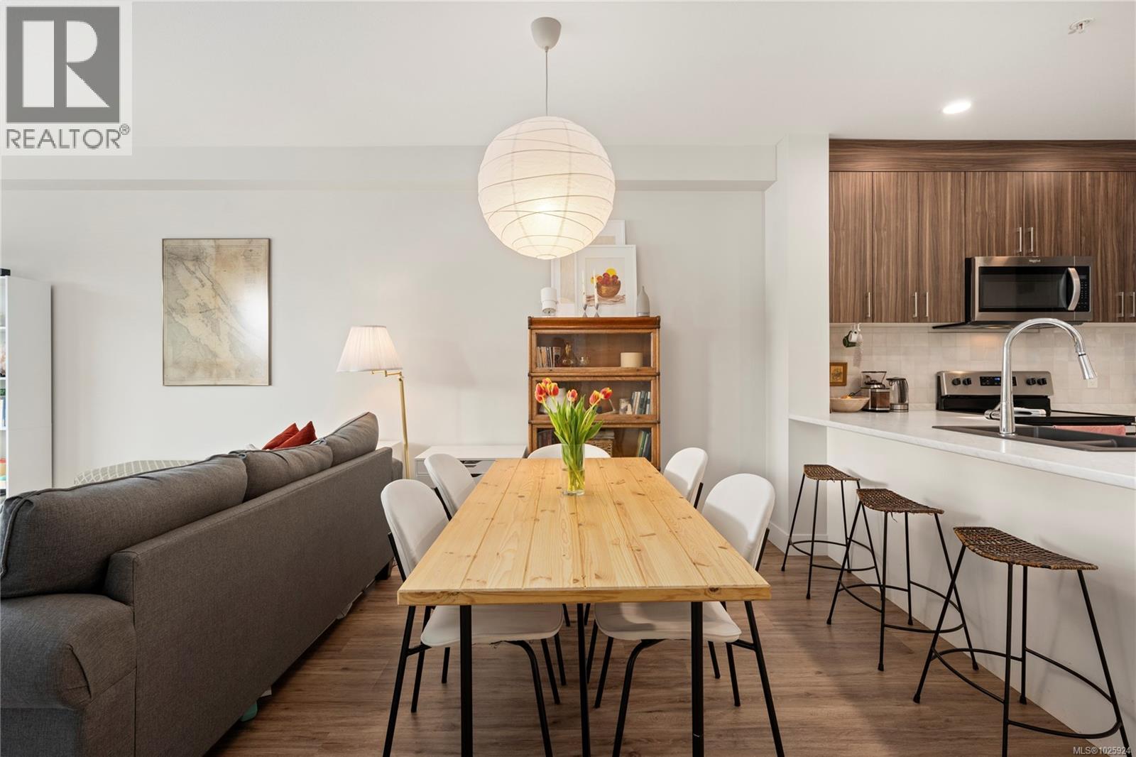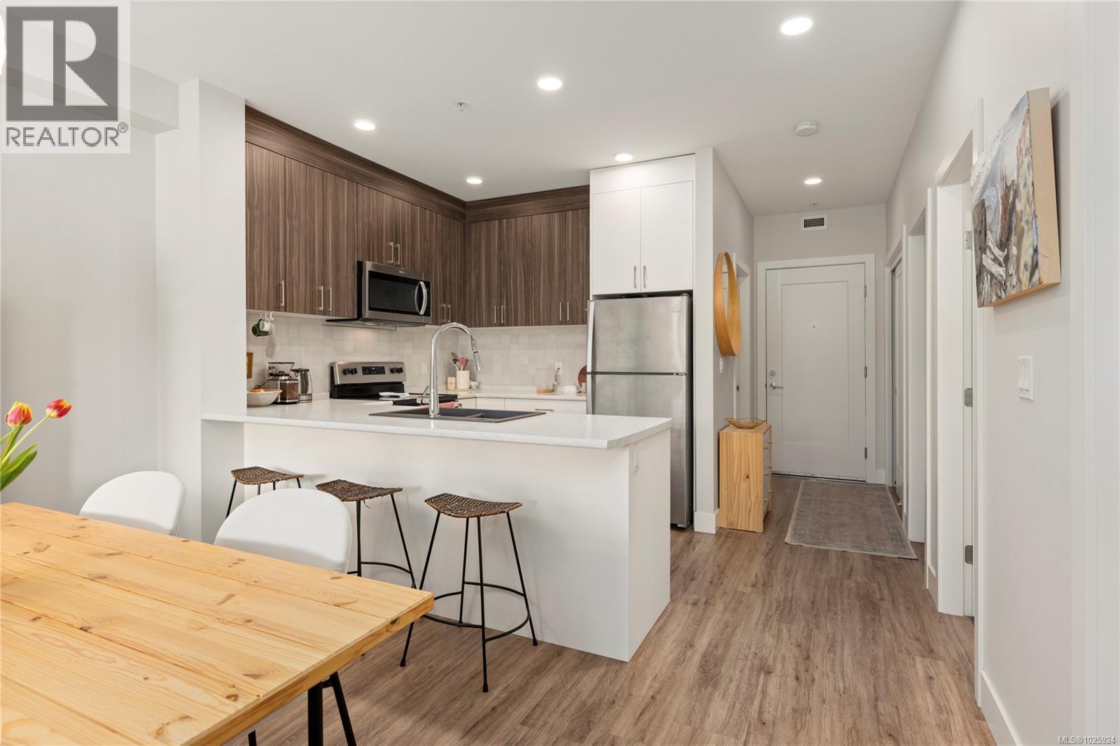 $275 MonthlyWelcome to The Met—where modern design meets unbeatable convenience. This bright 1-bedroom plus den home offers 9-foot ceilings, a thoughtfully designed open floor plan, and beautiful finishes throughout. The south-facing layout fills the space with natural light, while the kitchen features stylish two-toned cabinetry, stainless steel appliances, and sleek details perfect for everyday living and entertaining. Located in a well-run building with low strata fees, this home is just blocks from Woodgrove Mall, Costco, Superstore, and more. Enjoy being only 10 minutes from scenic parks, trails, and outdoor escapes. A stylish, functional home in the heart of it all—perfect for first-time buyers, down sizers, or investors. All measurements are approximate; please verify if deemed important. (id:44393)