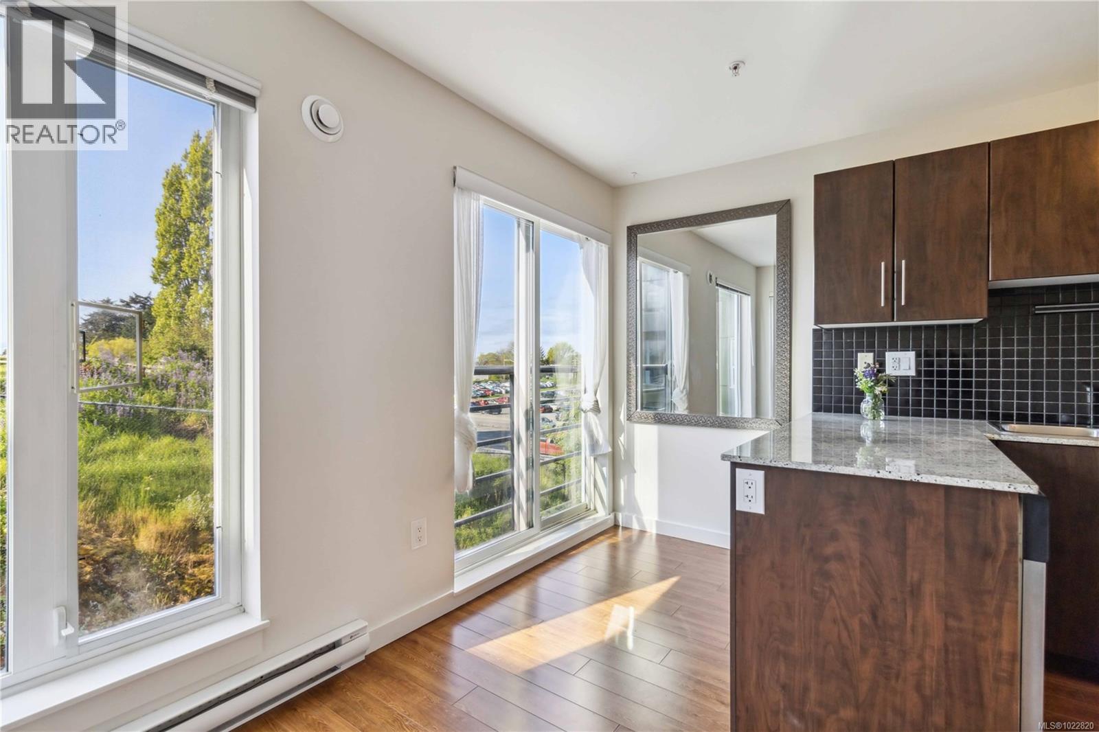 $227 Monthly2010 boutique Saxe Point condo with the best views in the building. Close to the ocean and a corner unit. Calm, serene look out over Ken Hill Park with fabulous sunrises in your south facing home. Beautiful, sunny and bright with the park providing a peaceful and green backdrop replete with wildlife sightings from eagles and deer to many types of local birds. Very quiet part of the building so you can enjoy glimpses of the Olympic mountains. Freshly painted in a warm and neutral colour for an expansive feel. Stainless Steel appliances, in-suite laundry and granite counters. 1 parking spot included. Locked bike storage & large storage unit. Common roof top deck with complete panoramic views. For convenience: bus outside to UVic and downtown. Cats and dogs allowed (no weight limits, 2 pets) in this great location: parks, off leash areas, groceries, rec centre, library & great coffee all within walking distance. Also close to Saxe Point with the dog beach, swimming and stunning views. (id:44393)