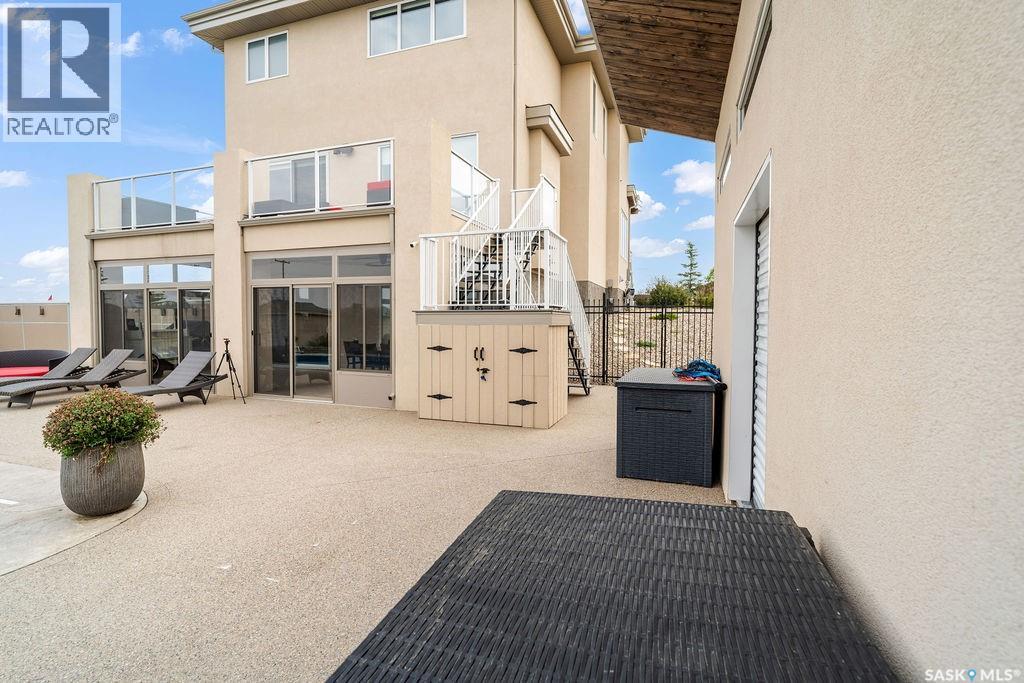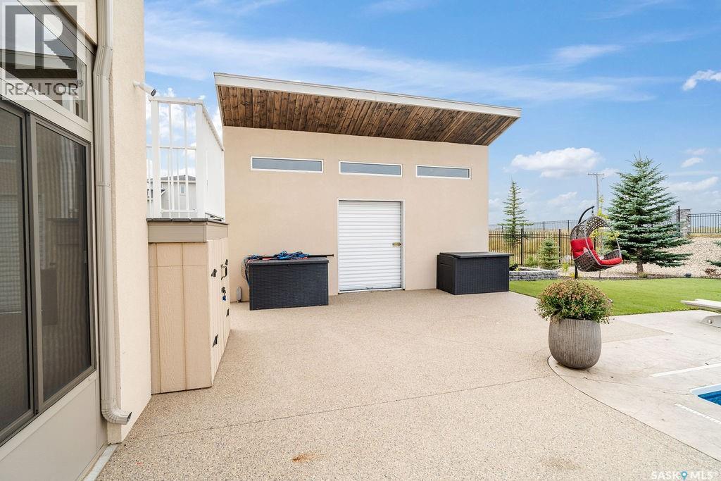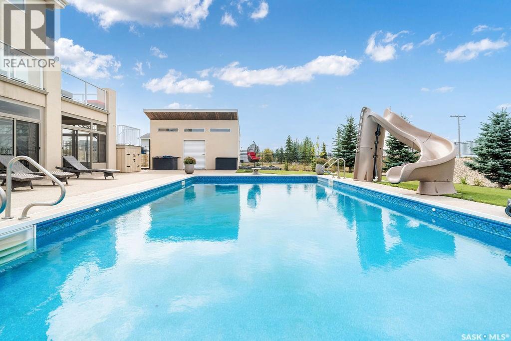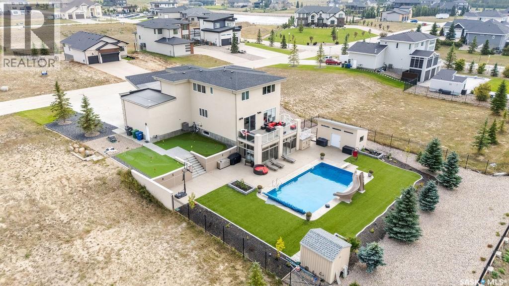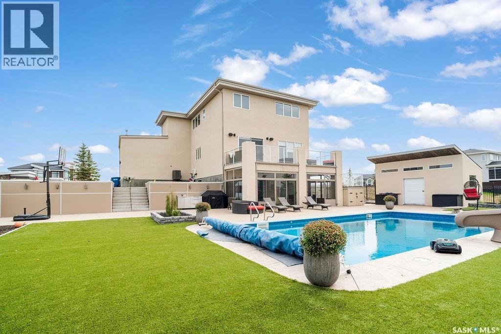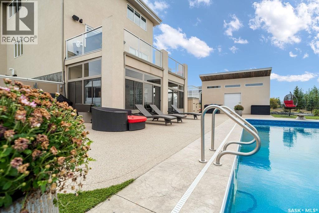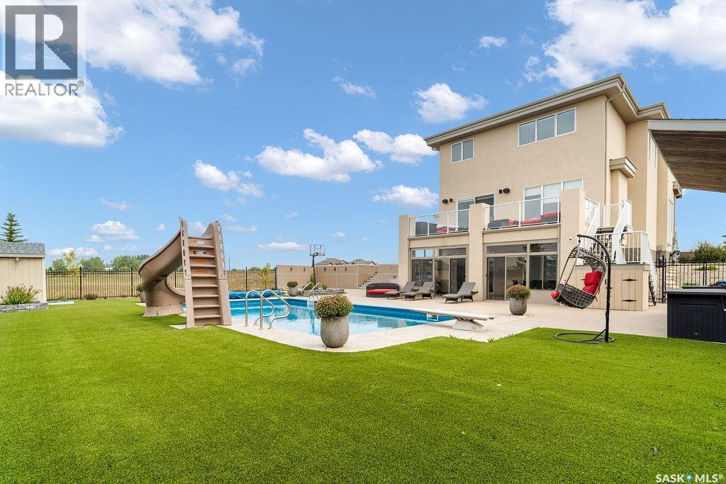 Luxury Living in Spruce Creek Estates – Pool, Walkout, Triple Garage This exquisite two-storey 2018 Stars Lottery Home, is located in the prestigious community just minutes east of Regina. From the moment you arrive, the curb appeal captivates with modern architecture, cedar and stone accents, and beautifully manicured landscaping. Inside, the open-concept design strikes the perfect balance between luxury and comfort. The chef’s kitchen makes a bold statement with crisp white lower cabinets, sleek black glass uppers, quartz countertops, and a huge island, providing both function and style. The living room, anchored by a gas fireplace, flows seamlessly into the dining room, which opens onto the deck where you can enjoy breathtaking Saskatchewan sunsets. Upstairs, the home continues to impress with 3 bedrooms and a bonus room enhanced with a custom JMS mural wall. The Primary suite has been beautifully updated, it is spacious, has a walk in closet and 5 piece ensuite. With chic tiled floors, updated cabinetry, a custom-tiled shower, a stand-alone soaker tub, and double sinks, this retreat feels like a luxury spa within your own home. The 2nd floor also features a full bathroom and laundry room. The fully developed walkout basement is perfect for entertaining or family time, with a gas fireplace in the family room, wet bar, 4th bedroom, bathroom, and spacious sunroom making it an ideal extension of your living space. Stepping outside, you’ll find a private backyard oasis designed for both relaxation and fun. A raised deck and patio overlook lush green space, putting green, and in-ground pool. Everything you need to enjoy hot Saskatchewan summers. The triple attached garage has 12-foot ceilings, epoxy-coated floors, and is heated. With in-floor heating in the basement, newer flooring, cabinetry, paint, & lighting throughout, as well as a home audio system and a fully fenced and landscaped 1/2 lot, this home delivers executive style with everyday comfort. (id:44393)