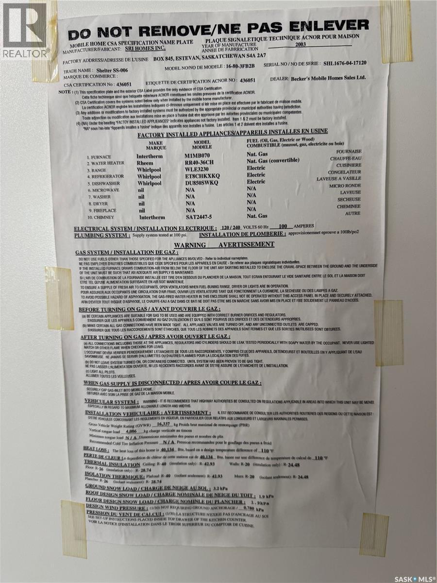 Move in ready, at an amazing price! This 2003 single wide mobile home will make you feel at ease from the moment you walk into it's 1216 sqft! With a large and spacious master suite with everything that you could desire, including walk-in closet and en-suite with jet tub. The kitchen has plenty of work space and a large panty easy at hand. This property also has a beautiful single garage and a good size fenced in yard, ready for pets or children! The location on Christie Street is fantastic for families, steps from the Jim Cook Rec Plex and the stunning Van Ray Outdoor Pool, your family has easy access to fun all year round, not too mention a daycare and two schools within walking distence! Call your agent today to check out this turn key property! (id:44393)