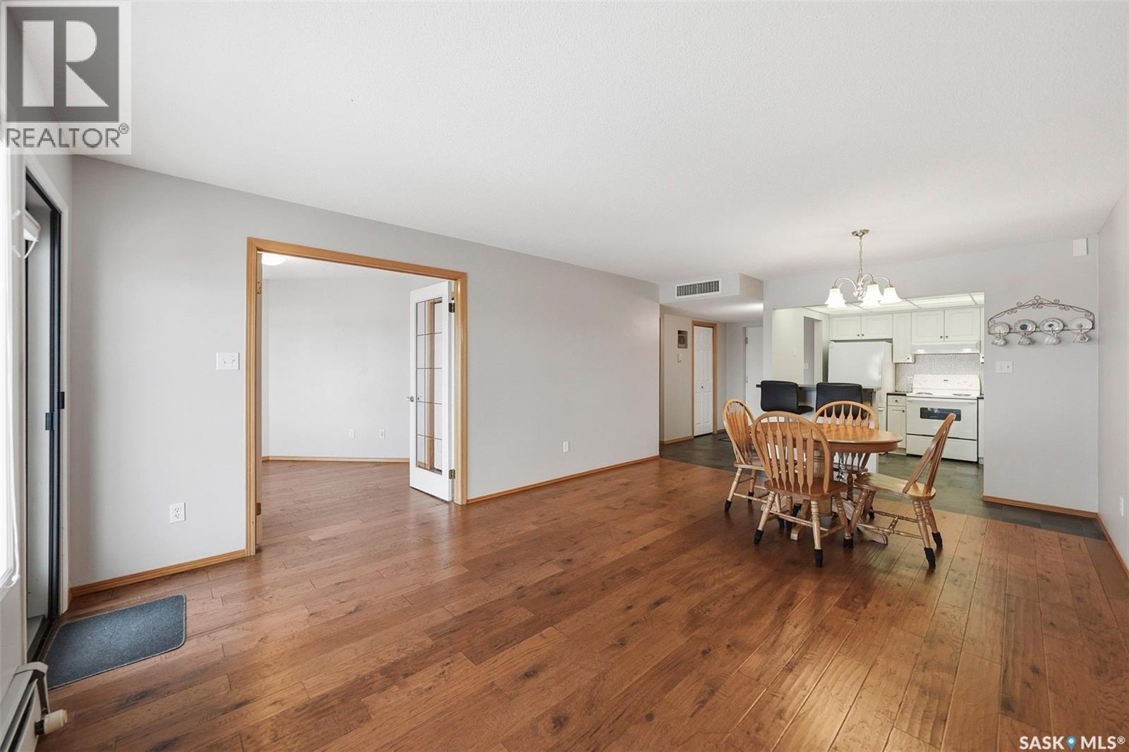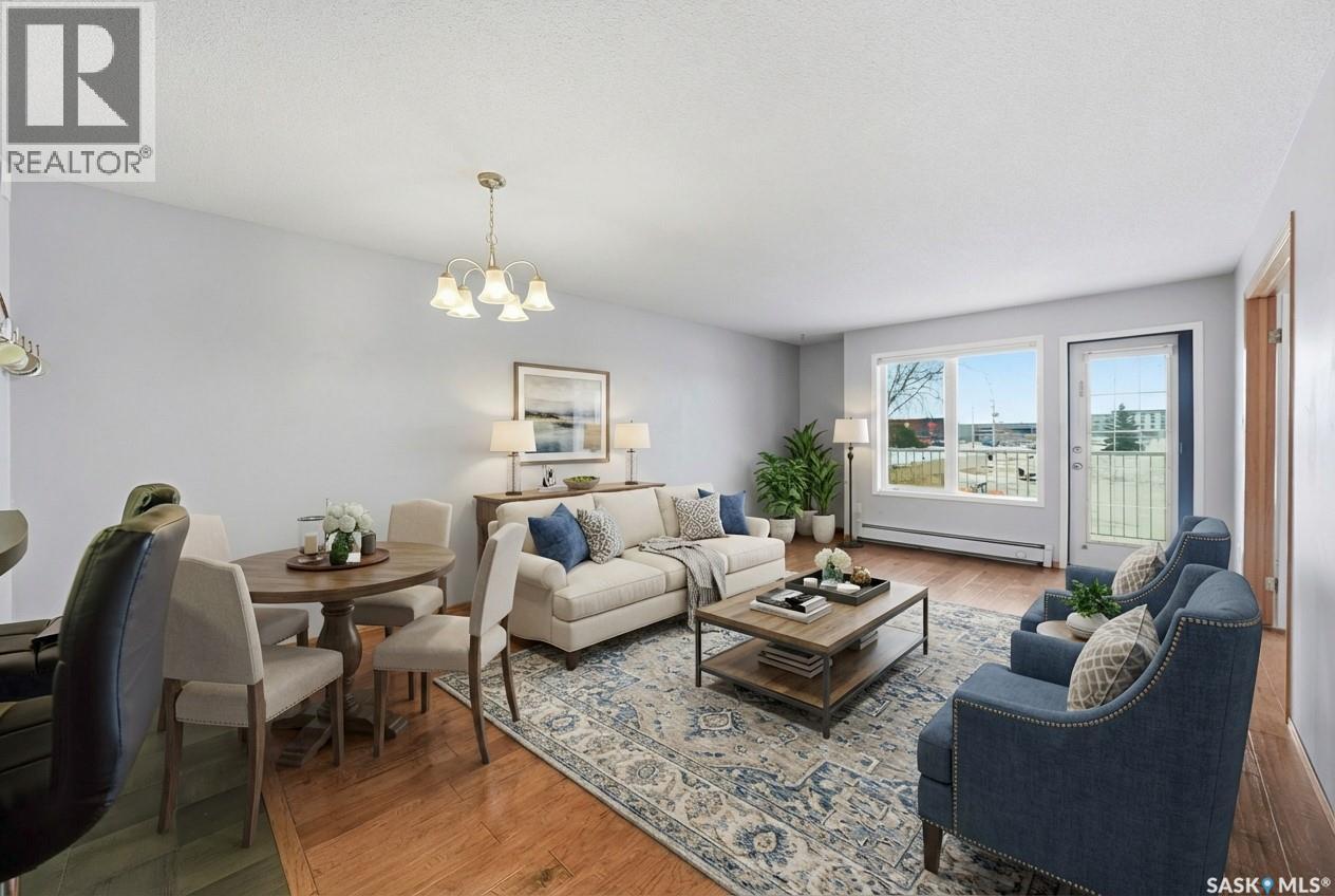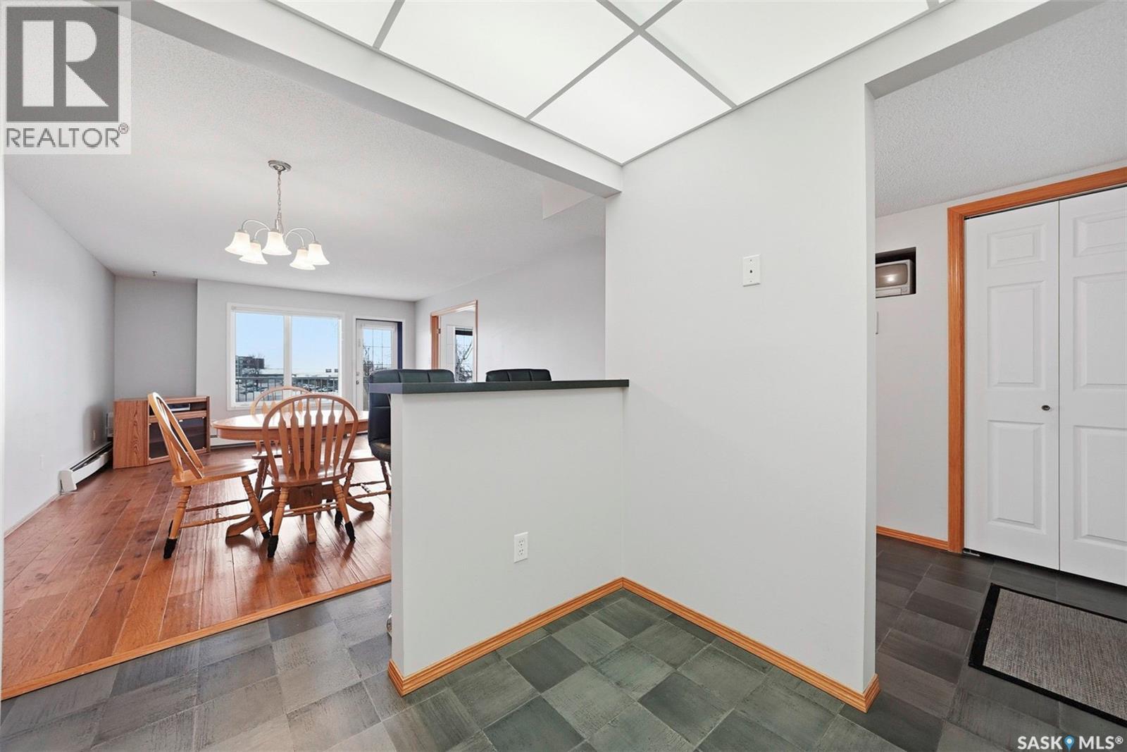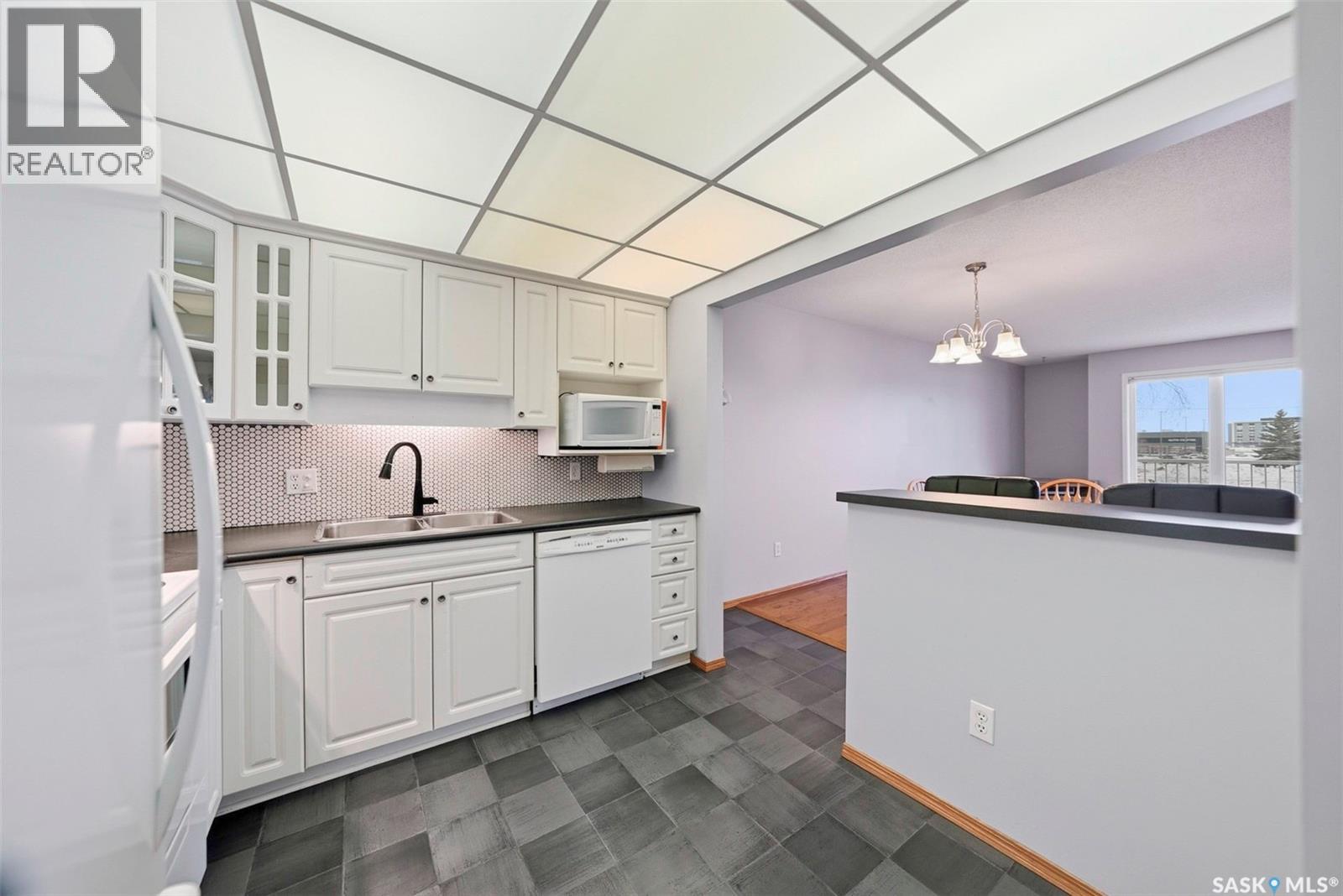 $416.70 MonthlyThis top-floor, south-facing condo in The Mackenzie is one of Prince Albert’s best-kept secrets. Quietly tucked away in South Hill yet within walking distance of everyday amenities, this location offers both privacy and convenience. The 950 sq ft unit features two bedrooms and two bathrooms, including a flexible second bedroom with French doors that also works beautifully as a home office or den. The primary bedroom includes a 2-piece ensuite, while the open-concept living space is designed for easy everyday living and entertaining. The kitchen is bright and inviting, finished in white cabinetry, a bar-height counter for two stools, and a distinctive light-panel ceiling that provides even, natural-style light. South-facing windows flood the living and dining areas with sunshine - a space where plants will absolutely thrive! Additional highlights include in-suite laundry with newer appliances, engineered hardwood flooring, stylish black linoleum in the kitchen and main bathroom, central air conditioning, and tasteful modern touches such as a penny tile backsplash and black hardware accents. The unit comes with one open parking stall and storage in a common storage room on the main level. The building offers a well-equipped amenities room with a pool table, library, treadmill, tables and chairs, and a kitchenette - ideal for gatherings. An elevator also adds everyday convenience. With a quiet atmosphere and a tucked-away South Hill location, this condo is a fantastic option for professionals, healthcare workers, or anyone seeking low-maintenance living in a well-managed building - with immediate or fast possession available. Book your showing today, you'll be glad you did! (id:44393)