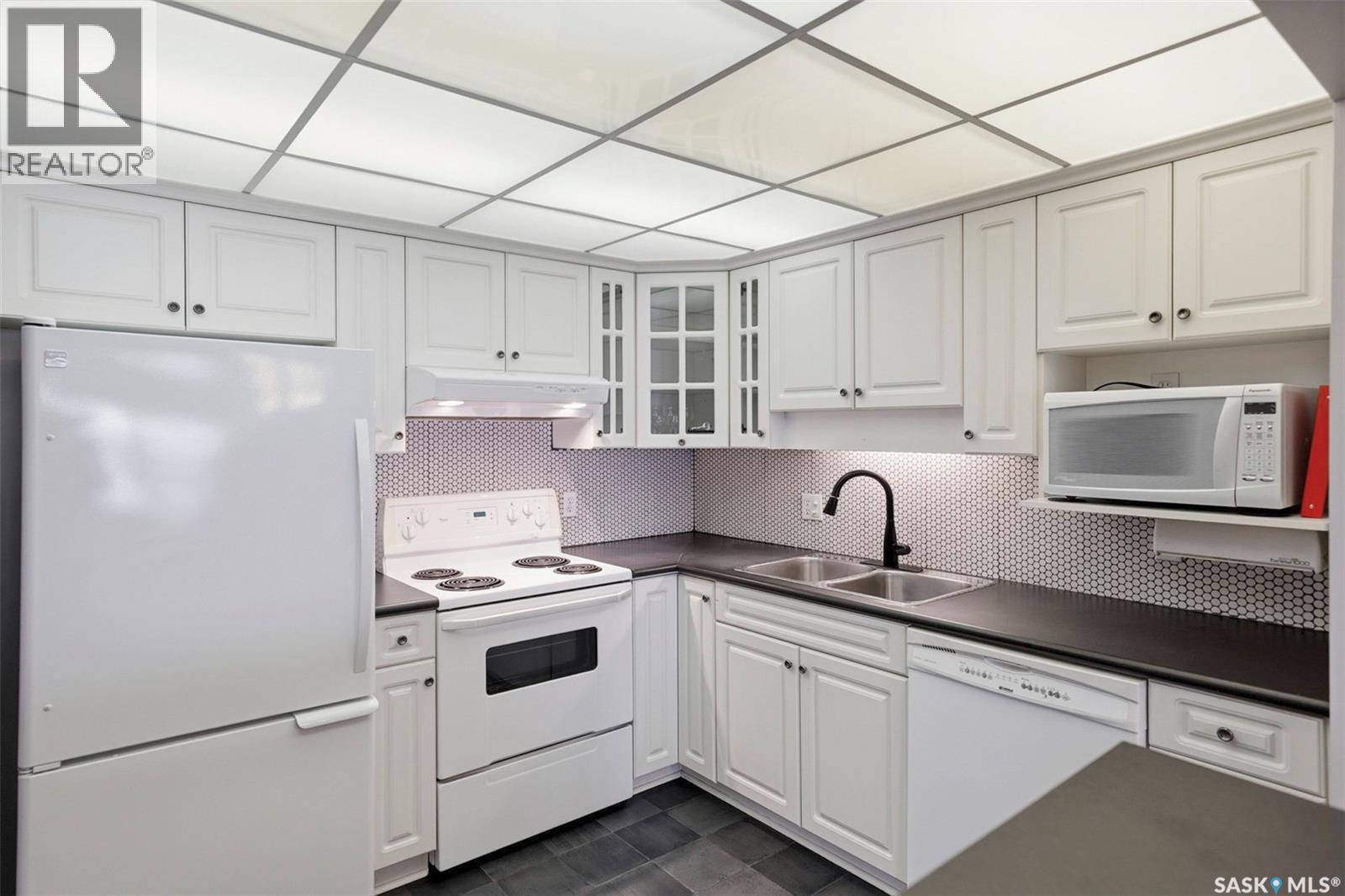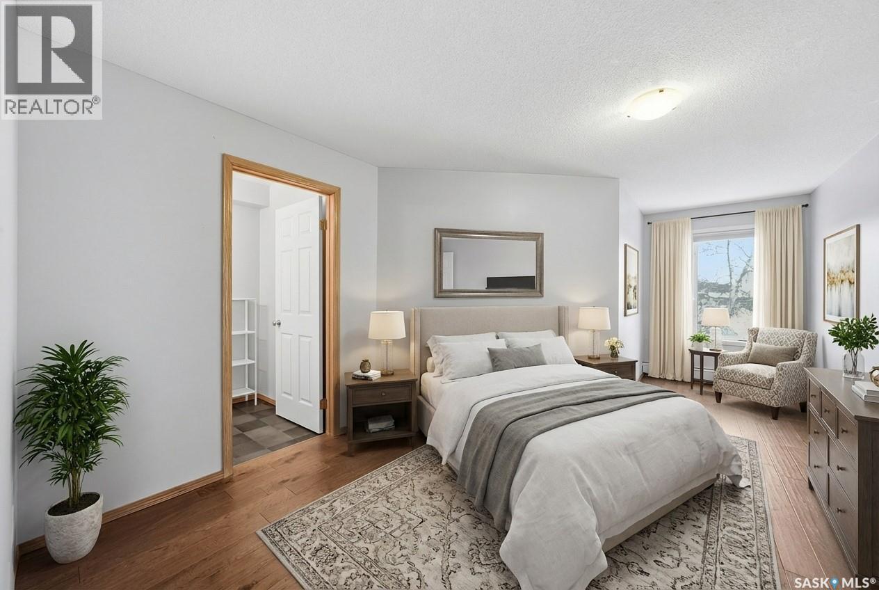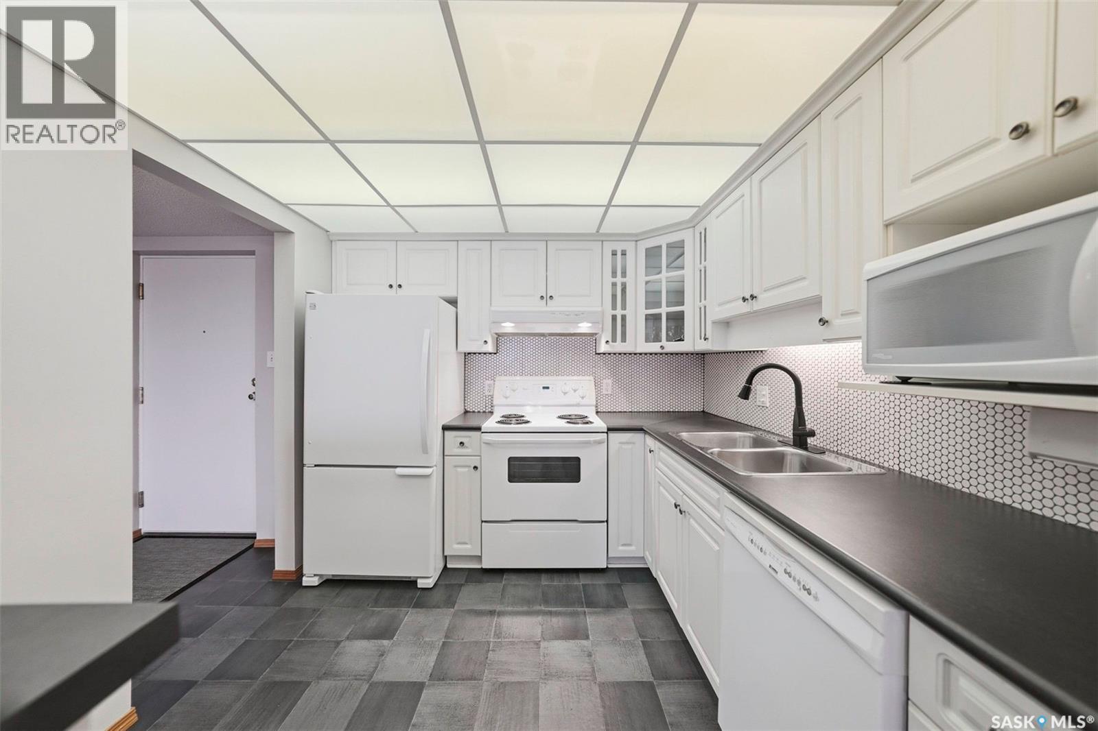 $416.70 MonthlyThis top-floor, south-facing condo in The Mackenzie is one of Prince Albert’s best-kept secrets. Quietly tucked away in South Hill yet within walking distance of everyday amenities, this location offers both privacy and convenience. The 950 sq ft unit features two bedrooms and two bathrooms, including a flexible second bedroom with French doors that also works beautifully as a home office or den. The primary bedroom includes a 2-piece ensuite, while the open-concept living space is designed for easy everyday living and entertaining. The kitchen is bright and inviting, finished in white cabinetry, a bar-height counter for two stools, and a distinctive light-panel ceiling that provides even, natural-style light. South-facing windows flood the living and dining areas with sunshine - a space where plants will absolutely thrive! Additional highlights include in-suite laundry with newer appliances, engineered hardwood flooring, stylish black linoleum in the kitchen and main bathroom, central air conditioning, and tasteful modern touches such as a penny tile backsplash and black hardware accents. The unit comes with one open parking stall and storage in a common storage room on the main level. The building offers a well-equipped amenities room with a pool table, library, treadmill, tables and chairs, and a kitchenette - ideal for gatherings. An elevator also adds everyday convenience. With a quiet atmosphere and a tucked-away South Hill location, this condo is a fantastic option for professionals, healthcare workers, or anyone seeking low-maintenance living in a well-managed building - with immediate or fast possession available. Book your showing today, you'll be glad you did! (id:44393)
