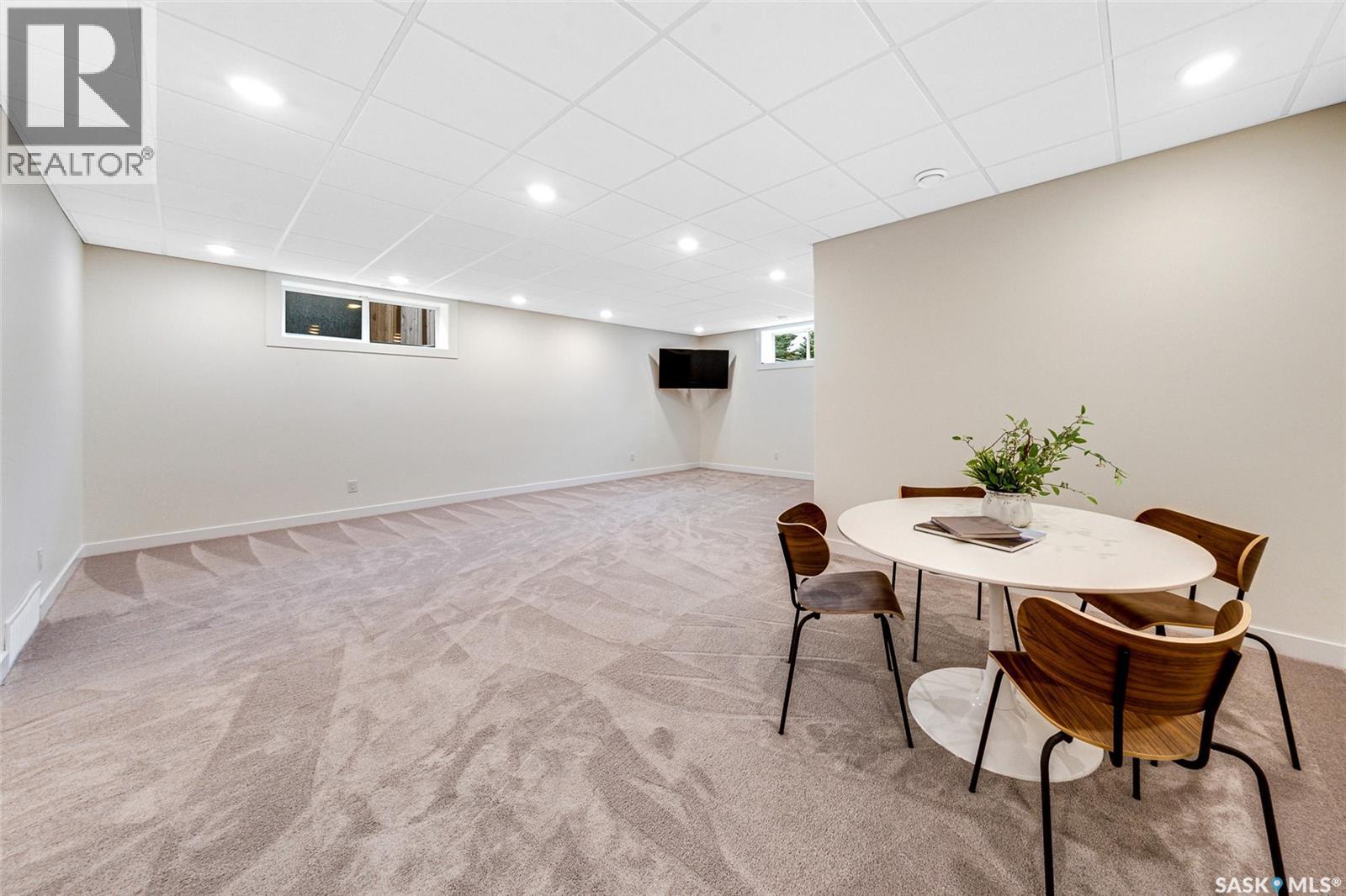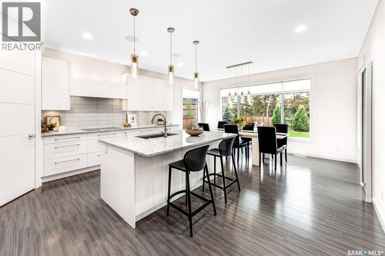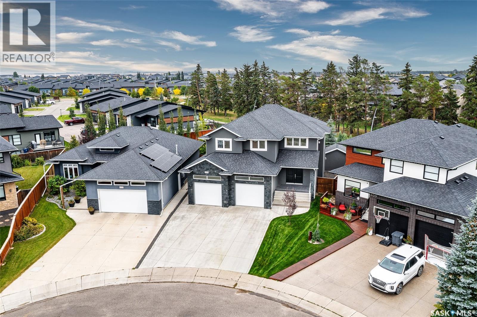 Tucked away on one of Evergreen’s most desirable crescents, this exceptional two-storey home blends luxury, function, and timeless elegance on a massive pie-shaped lot backing the walking trails lined with mature Scots pine trees. From the striking curb appeal to the timeless finishes and extensive list of custom upgrades, every detail has been thoughtfully designed. Inside, a grand foyer leads into a living room with soaring ceilings and expansive windows that fill the space with natural light. At the heart of the home, the gourmet kitchen showcases Redl custom cabinetry, built-in Miele dual ovens with induction cooktop, quartz countertops, tile backsplash, and a large island with additional seating, seamlessly connected to the dining area overlooking the private backyard. The main floor also offers a dedicated office, a 2-piece bath, and a mudroom with direct access to the oversized heated staggered bay garage ( 28’ x 22’/26’) with 220v plug and hot/cold water taps. Upstairs, four spacious bedrooms await, including a luxurious primary suite with a custom walk-in closet and a spa-inspired ensuite featuring a jetted tub and steam shower—the perfect retreat after a long day. A full bathroom and convenient second-floor laundry complete this level. The fully developed basement adds versatility with a large family room and games area, a fifth bedroom, 4-piece bath, storage, mechanical room, and a future wet bar nook. Notable extras include central AC, HRV, HEPA air filter, “hide-a-hose” central vac, Control4 audio with built-in speakers throughout, and more. Outside, the expansive backyard offers endless potential for entertaining, a future pool, or simply enjoying the serenity of your private outdoor escape. Ideally situated near the Forestry Farm and zoo, an array of amenities, school bus pick up, elementary and high schools, this rare property offers the perfect balance of comfort and lifestyle in one of Saskatoon’s most coveted neighbourhoods. (id:44393)
