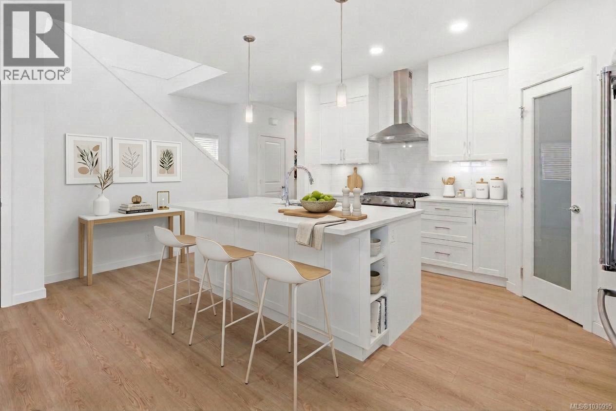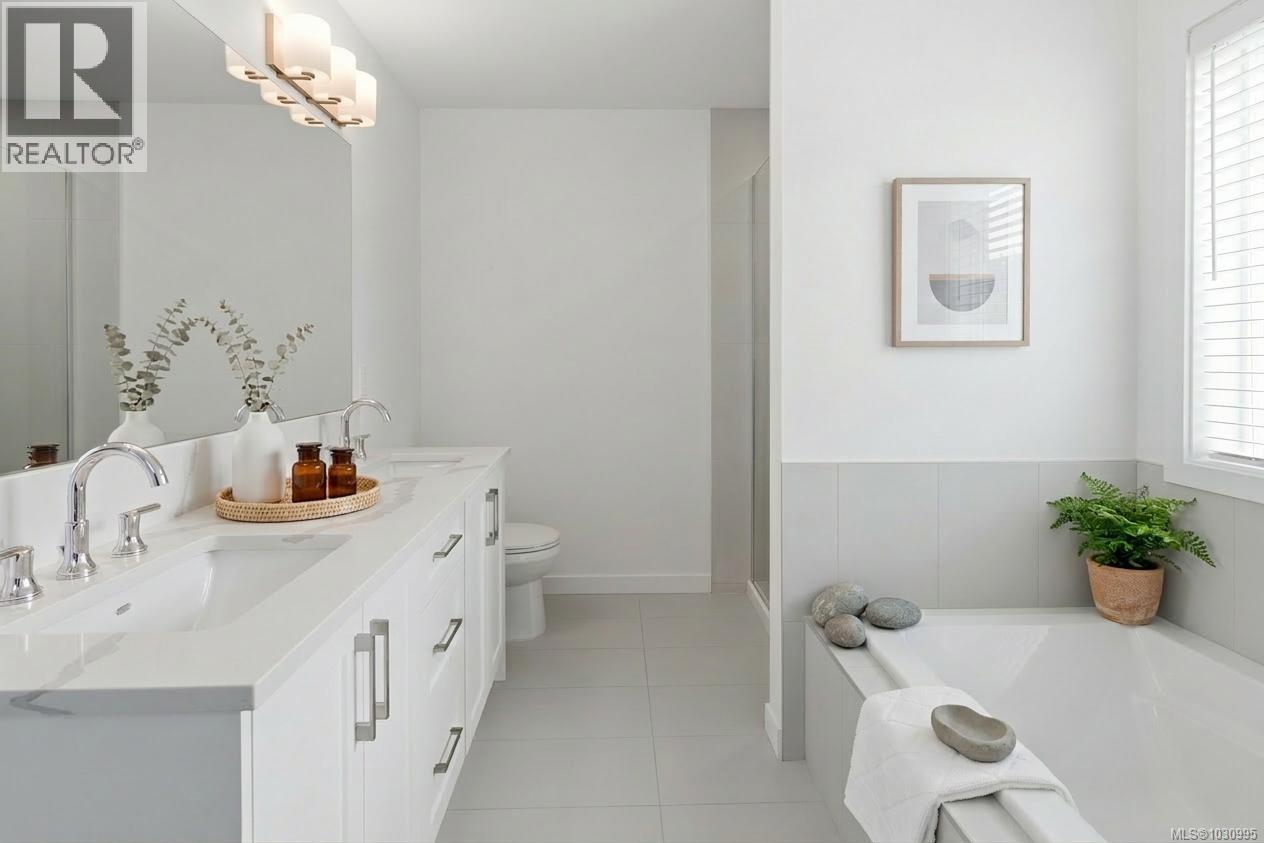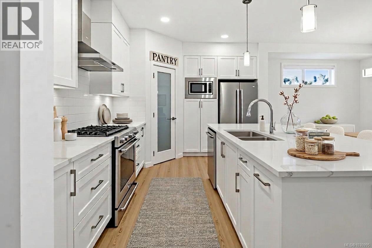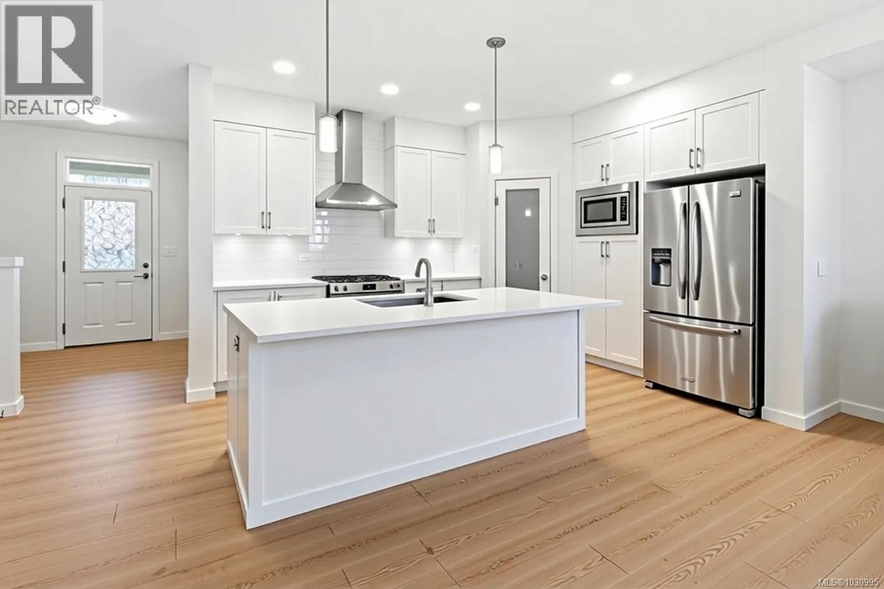 Welcome to this beautifully upgraded Westwick home in the heart of Royal Bay, offering over 3,100 sq/ft of thoughtfully designed living space. You will be impressed with the bright, open-concept main level filled with natural light from the abundance of windows, featuring a chef-inspired kitchen with quartz countertops, full-height cabinetry, under-cabinet lighting, a spacious island, and a walk-in pantry—perfect for everyday living and entertaining. The adjoining dining area flows seamlessly into the inviting living room anchored by a modern gas fireplace and opening onto the rear private deck, while a dedicated office, powder room, and mudroom add everyday functionality. Upstairs, the spacious primary suite is a true retreat with a luxurious ensuite, plus two additional bedrooms, a full bathroom, and a flexible family room. Versatile walkout lower level boasts large rec room (bonus kitchen roughed in for legal suite), large bedroom, full bathroom, laundry hookups and separate entrance - ideal for extended family or future suite potential. Set on a sunny lot with a premium vinyl deck, easy access yard, hot water on demand, HRV and detached double car garage. Steps to playgrounds, expansive green space, scenic walking trails, top-rated schools & 1.3km of pristine oceanfront—all within a vibrant, family-friendly seaside community. (id:44393)