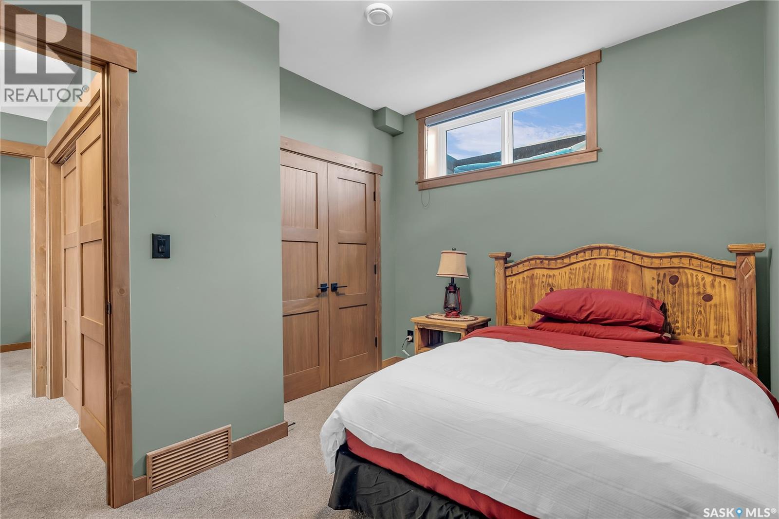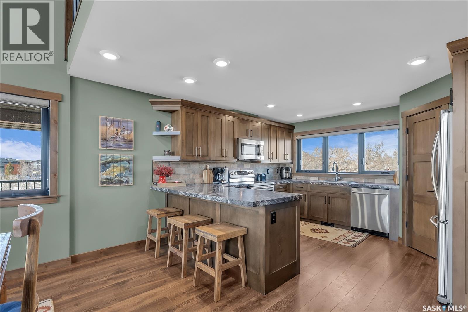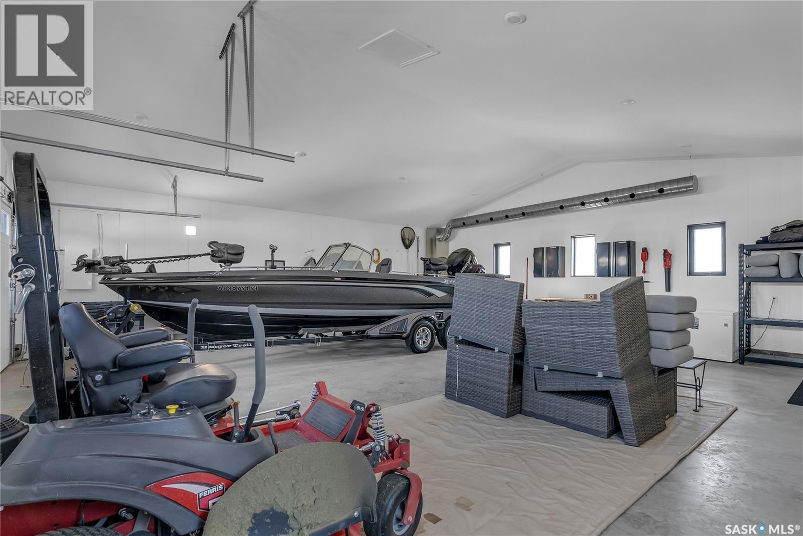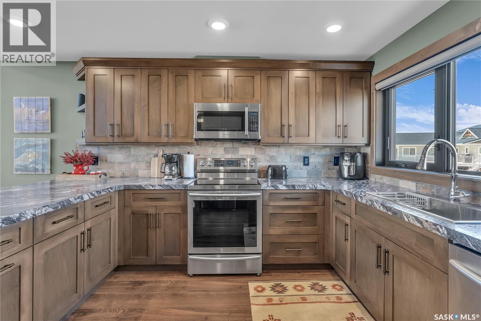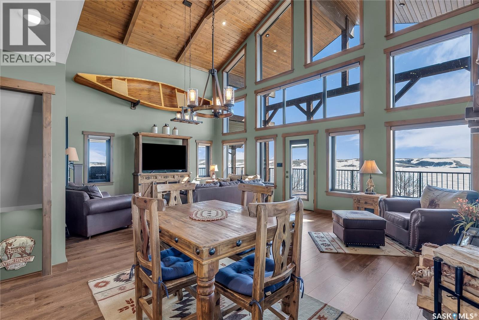 Welcome to 35 Grace Bay. Luxury home built on 2 titled and parcel tied lakefront lots at Sandy Shores Resort on Lake Diefenbaker. 1 hour away from Saskatoon via the recently upgraded Highway 219, this stunning custom-built walkout home is situated on over 0.5 acres with south-facing views of Coteau Bay and over 238 feet of lake frontage. Loft-style floorplan with cathedral ceilings, oversized windows to maximize the southern exposure and lake views, & a grand open-concept living space to offer the finest in lakeside luxury. Rustic finishes including exposed rafters, tongue-&-groove ceilings, wood-burning fireplace with stone hearth, & more. The kitchen offers beautiful cabinetry, stainless steel appliances, & a functional layout with an eating bar & large pantry. Wake up to stunning sunrises over the lake in the spacious loft-style master bedroom, complete with a large walk-in closet & 3-piece ensuite with sit-down shower. The lower level walkout offers a beautiful lake view & opens to the lower patio, complete with 2 bedrooms & a full bathroom. Potential for adding a wet bar or kitchenette in the lower level if desired. The equally amazing outdoor area offers a massive wraparound veranda, unbeatable setup for outdoor entertainment. Massive driveway to ensure there's plenty of parking for your guests of this special home, & an oversized 34'x34' heated attached garage with plenty of room to park a boat trailer & all the toys you'd want to have at the lake. A true 4-season retreat with conveniences like treated community water, year-round maintained roads, sport court, playground, marina, boat launch, community association and more. Lake Diefenbaker offers clear recreational waters, with sandy beaches & world-class fishing opportunities. Property features 2 power feeds to support increased power usage, there is also a shoreline allocation for 2 docks plus a spot in the private mini marina for boat parking. Also extra space for parking or to build more if desired. (id:44393)