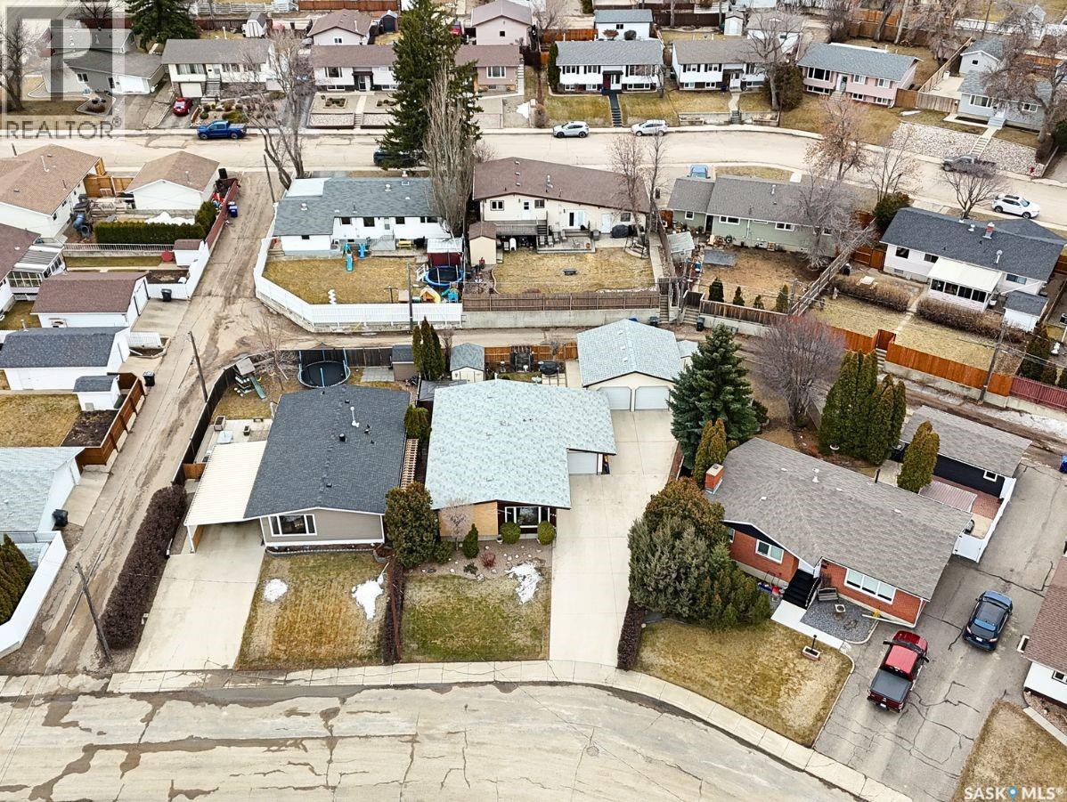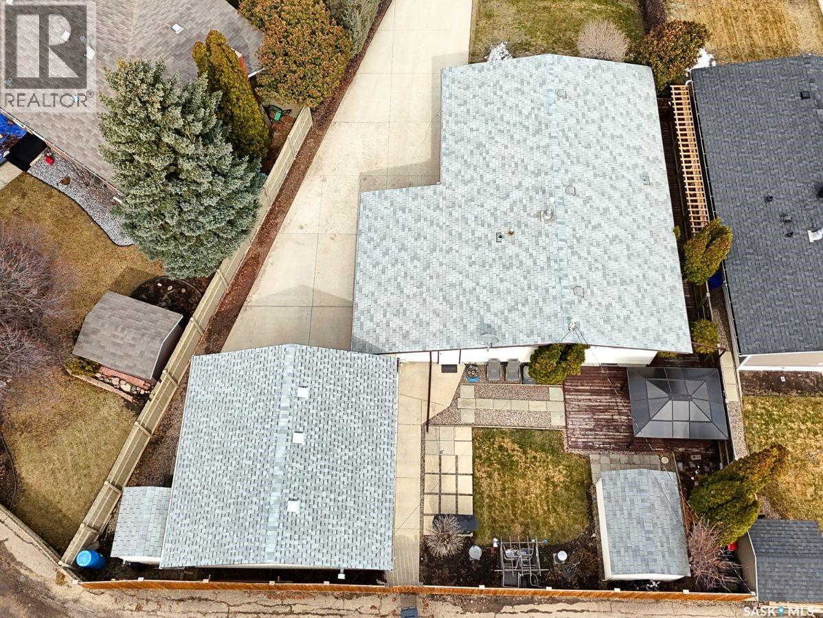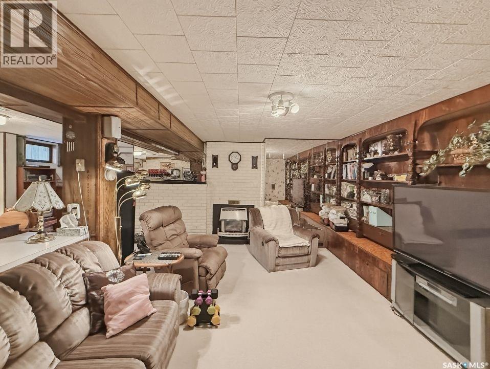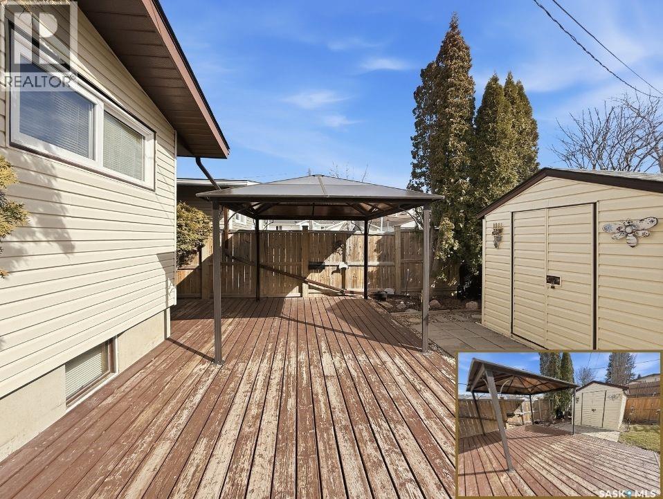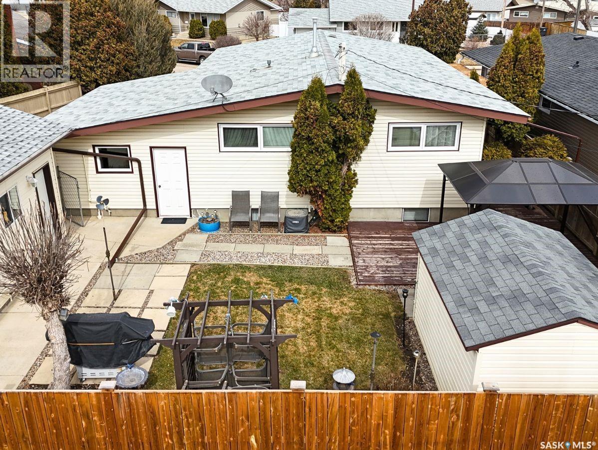 Tucked away on a quiet cul-de-sac in Swift Current’s sought-after southeast, just blocks from the Chinook Pathway and golf course, and within walking distance to Pioneer Co-op (grocery, gas bar, and liquor), this spacious bungalow checks all the boxes for location and lifestyle. Offering 3+2 bedrooms, the layout is both functional and inviting. The main floor features a bright L-shaped living and dining area with oversized north-facing windows that flood the space with natural light. A patio door off the dining room leads to a sun-soaked, private deck spanning the length of the home—perfect for morning coffee or easy entertaining. The kitchen is well-appointed with an abundance of white cabinetry and an east-facing window. Three bedrooms are located on the main, including a primary suite with a 2-piece ensuite and south-facing window. The main 4-piece bath has been updated with a Bath Fitter tub and modern vanity. Downstairs offers excellent additional living space with a cozy family room featuring built-in bookshelves and a gas fireplace, two more bedrooms, a 4-piece bath, laundry, and a dedicated storage room. An energy-efficient furnace adds comfort and efficiency. Outside, the property continues to impress with a single attached garage plus a double detached heated garage with workbench—ideal for projects, storage, or the enthusiast. The private backyard is designed for entertaining, complete with a second deck, included gazebo, and two natural gas hookups for BBQ or outdoor heating. Shingles are approximately 10 years old and main floor windows are PVC. A well-rounded home in a prime location—move in and enjoy. (id:44393)