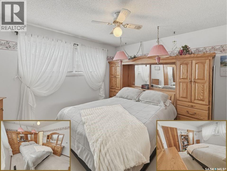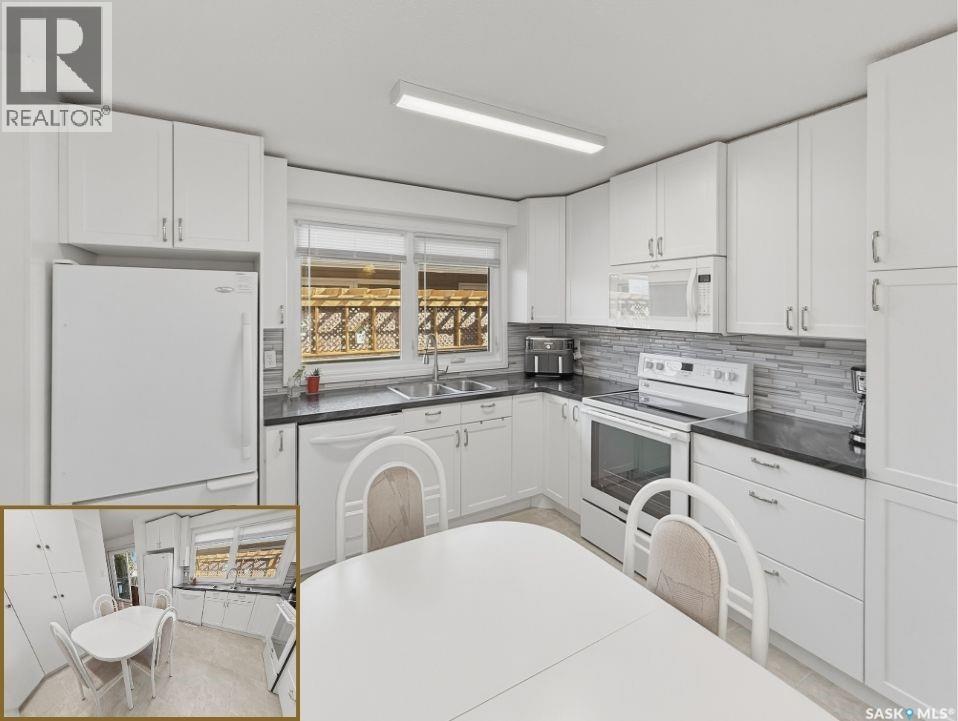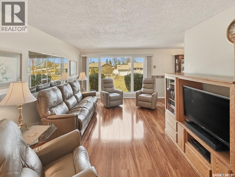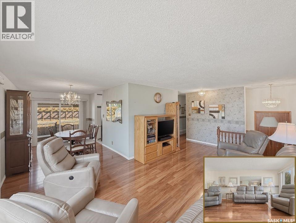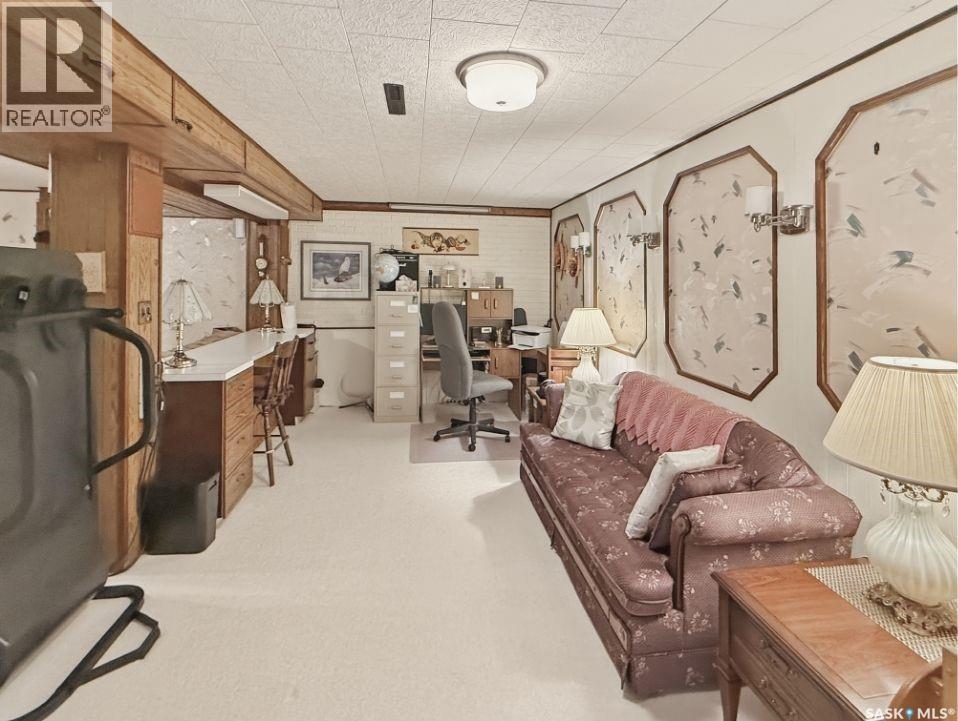 Tucked away on a quiet cul-de-sac in Swift Current’s sought-after southeast, just blocks from the Chinook Pathway and golf course, and within walking distance to Pioneer Co-op (grocery, gas bar, and liquor), this spacious bungalow checks all the boxes for location and lifestyle. Offering 3+2 bedrooms, the layout is both functional and inviting. The main floor features a bright L-shaped living and dining area with oversized north-facing windows that flood the space with natural light. A patio door off the dining room leads to a sun-soaked, private deck spanning the length of the home—perfect for morning coffee or easy entertaining. The kitchen is well-appointed with an abundance of white cabinetry and an east-facing window. Three bedrooms are located on the main, including a primary suite with a 2-piece ensuite and south-facing window. The main 4-piece bath has been updated with a Bath Fitter tub and modern vanity. Downstairs offers excellent additional living space with a cozy family room featuring built-in bookshelves and a gas fireplace, two more bedrooms, a 4-piece bath, laundry, and a dedicated storage room. An energy-efficient furnace adds comfort and efficiency. Outside, the property continues to impress with a single attached garage plus a double detached heated garage with workbench—ideal for projects, storage, or the enthusiast. The private backyard is designed for entertaining, complete with a second deck, included gazebo, and two natural gas hookups for BBQ or outdoor heating. Shingles are approximately 10 years old and main floor windows are PVC. A well-rounded home in a prime location—move in and enjoy. (id:44393)