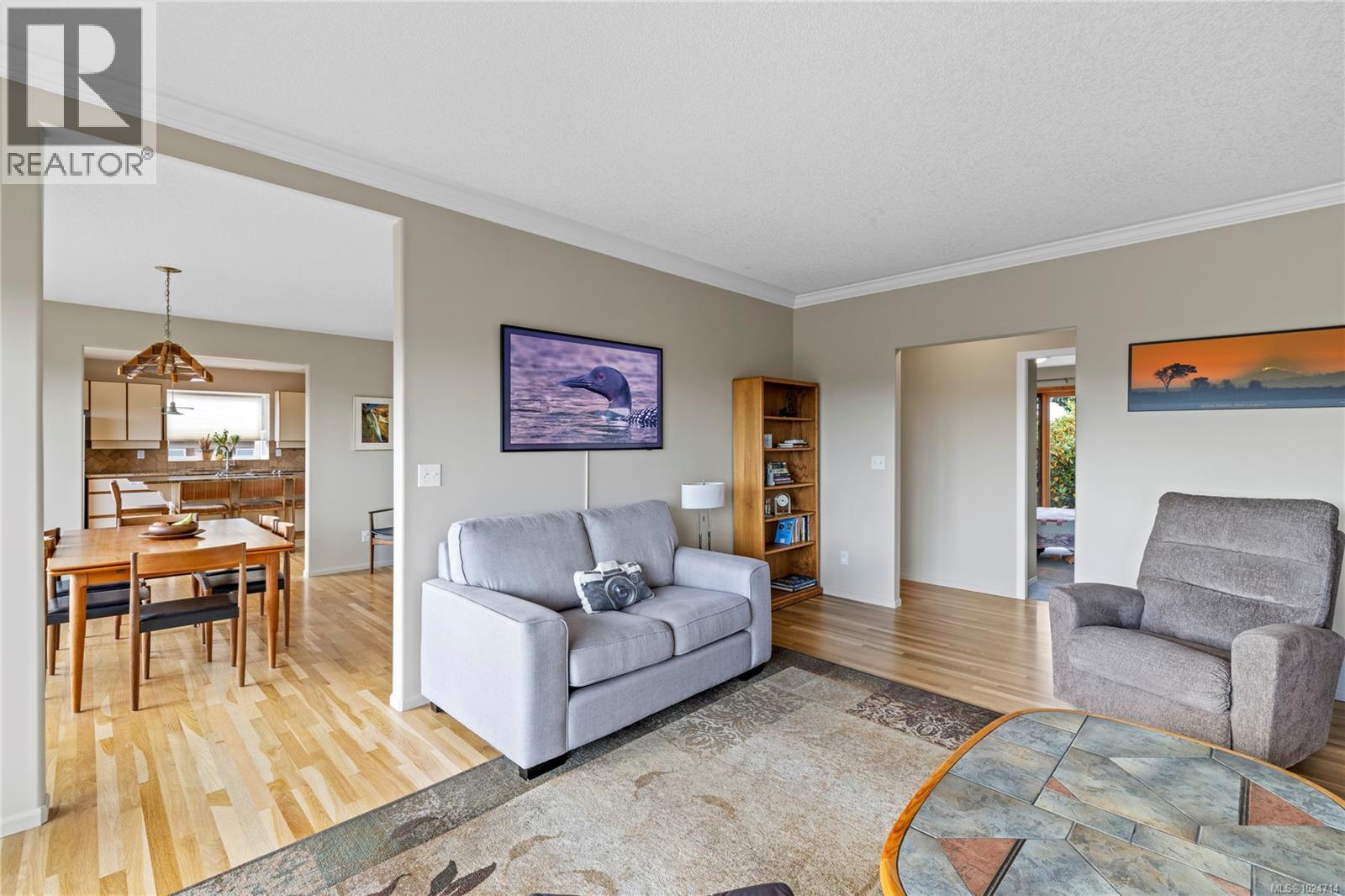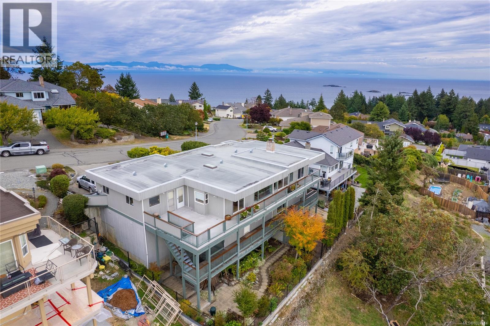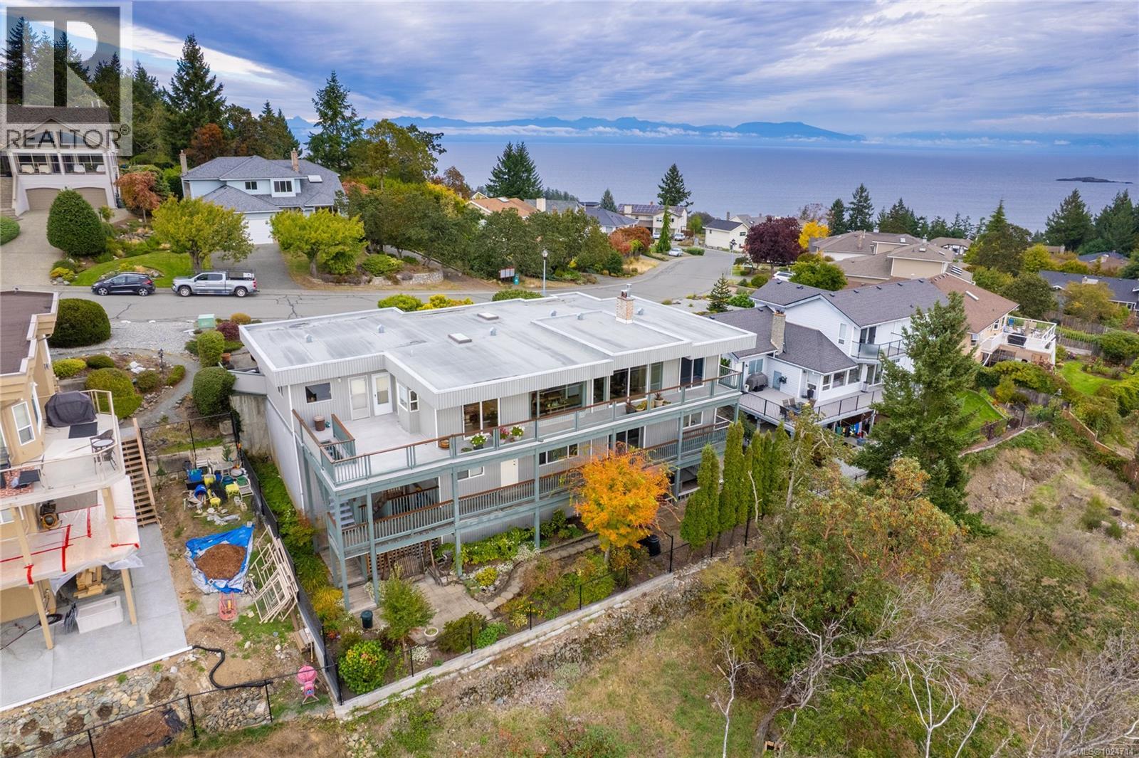 Enjoy stunning panoramic views stretching from the ocean to Mount Benson from this impressive home. Floor-to-ceiling windows and refinished hardwood flooring enhance the main living areas. The spacious kitchen features a large centre island with an eating bar leading to a generous dining room and living room with gas fireplace. The main level includes three bedrooms, including a primary with a three-piece ensuite and walk-in closet, plus a three-piece main bathroom. The lower level offers excellent flexibility with a fourth bedroom, family room, hobby room, large rec room with laundry, sauna, and three-piece bathroom. An additional unfinished level provides workshop space and storage. Outdoor highlights include a southern exposed multi-level deck to take in the views and a garden area with irrigation. A heat pump provides efficient year-round comfort. Located near Linley Valley hiking trails and Pipers Lagoon. All data and measurements are approx and must be verified if fundamental. (id:44393)