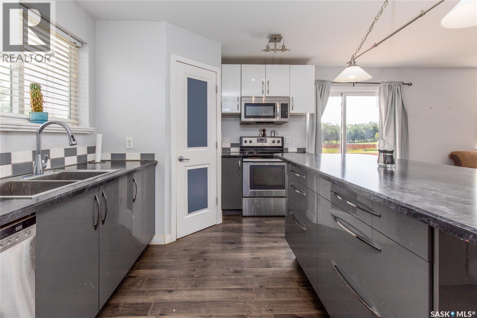 Built in 2014, this bungalow offers two fully developed levels, each 1,130 sq ft, with separate and self-contained living spaces. Both the main and lower levels include three bedrooms, two bathrooms (including an en suite), an open concept full kitchen, a living room, and dining area, a dedicated laundry, and private entrances. The main level features a large wraparound deck on the south and west sides, while the lower level includes stamped concrete flooring with in-floor heating and a walkout basement. Situated on two lots and backing onto open green space, this property offers a rural feel with the convenience of nearby amenities (5 km to Caronport, 29 km to Moose Jaw). The versatile layout makes it well-suited for multi-generational living or rental potential. Book your viewing today! (id:44393)