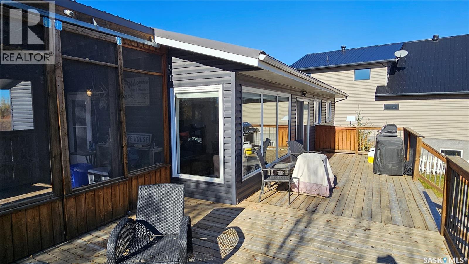 Enjoy year-round lakefront living at 38 Lucien Lakeshore Drive, a 960 sq ft four-season bungalow with direct water access and no stairs to the shore. This cabin offers 4 bedrooms and 2 bathrooms (3 up, 1 down + potential 5th bedroom). The bright open-concept kitchen, dining, and living area features large lake-facing windows and stainless-steel appliances, including an island and bay-window nook. A large screened-in covered porch welcomes you at the entry—perfect for extra seating or summer dining. The spacious deck overlooks the yard and provides plenty of space for BBQs and outdoor furniture. The level yard has room for kids to play, a firepit area, and two storage sheds—one oversized for lake gear and one smaller for tools or toys. The basement is built with ICF walls, offering high ceilings and a partially finished layout including laundry, a 3-piece bath, and one bedroom, with room to add another. Utilities and features include: 1,800 gal. water storage (hauled from Middle Lake), 2,500 gal. septic tank, Metal roof, Vinyl plank flooring throughout, Central air conditioning, Sump pump, Starlink internet equipment included. Located about 35 km North of Humboldt, Lucien Lake is a popular family-friendly destination with a regional park, sandy beaches, boat launch, and excellent fishing for walleye, northern pike, and perch. This move-in-ready lakefront property offers great indoor and outdoor space, modern utilities, and one of the most accessible waterfront lots on Lucien Lake—ideal for both summer fun and year-round enjoyment. (id:44393)