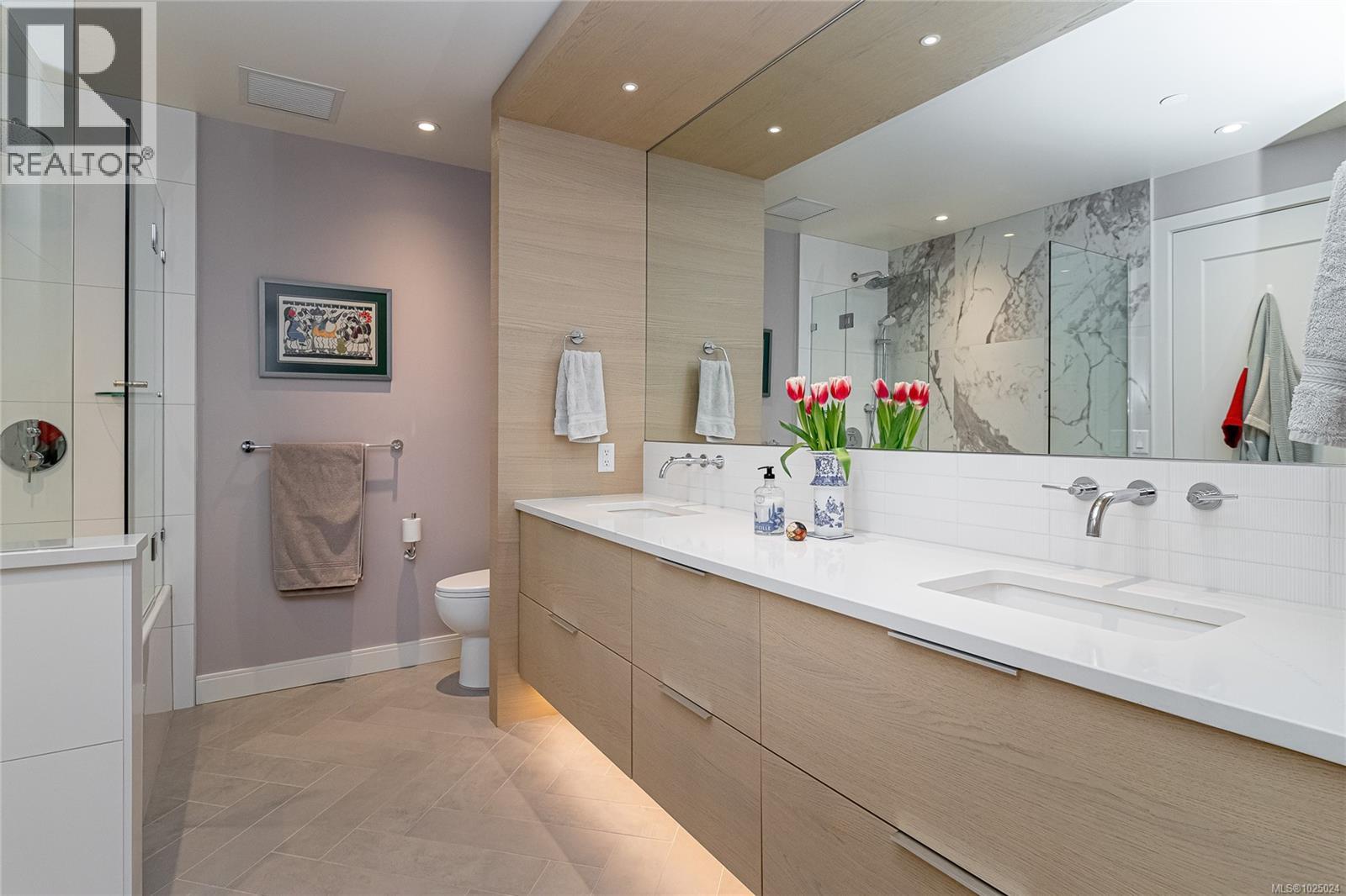 $427 MonthlyPriced $164,000 below the 2026 assessed value and below $900 per sq.ft., this TOP-FLOOR steel-and-concrete home offers outstanding value, privacy, and remarkable finishing! Overlooking a quiet residential neighbourhood, the spacious 800 sq ft one-bedroom features a living area larger than most two-bedroom units in the building—a rare and desirable advantage. Located in one of Victoria’s most sought-after neighbourhoods, this home offers an efficient layout, peaceful exposure, and excellent soundproofing. Enjoy year-round comfort with energy-efficient forced-air heating and air conditioning. Interiors are elevated with spa-inspired bathrooms and a kitchen featuring Italian millwork, Wolf gas cooktop, Fisher & Paykel appliances, integrated fridge, and double-thick quartz countertops. The rooftop garden showcases beautiful views of Mount Baker and the surrounding treescape. Includes secure parking, storage locker, and common bike storage. Steps to shops, cafés, parks, Oak Bay Village. (id:44393)