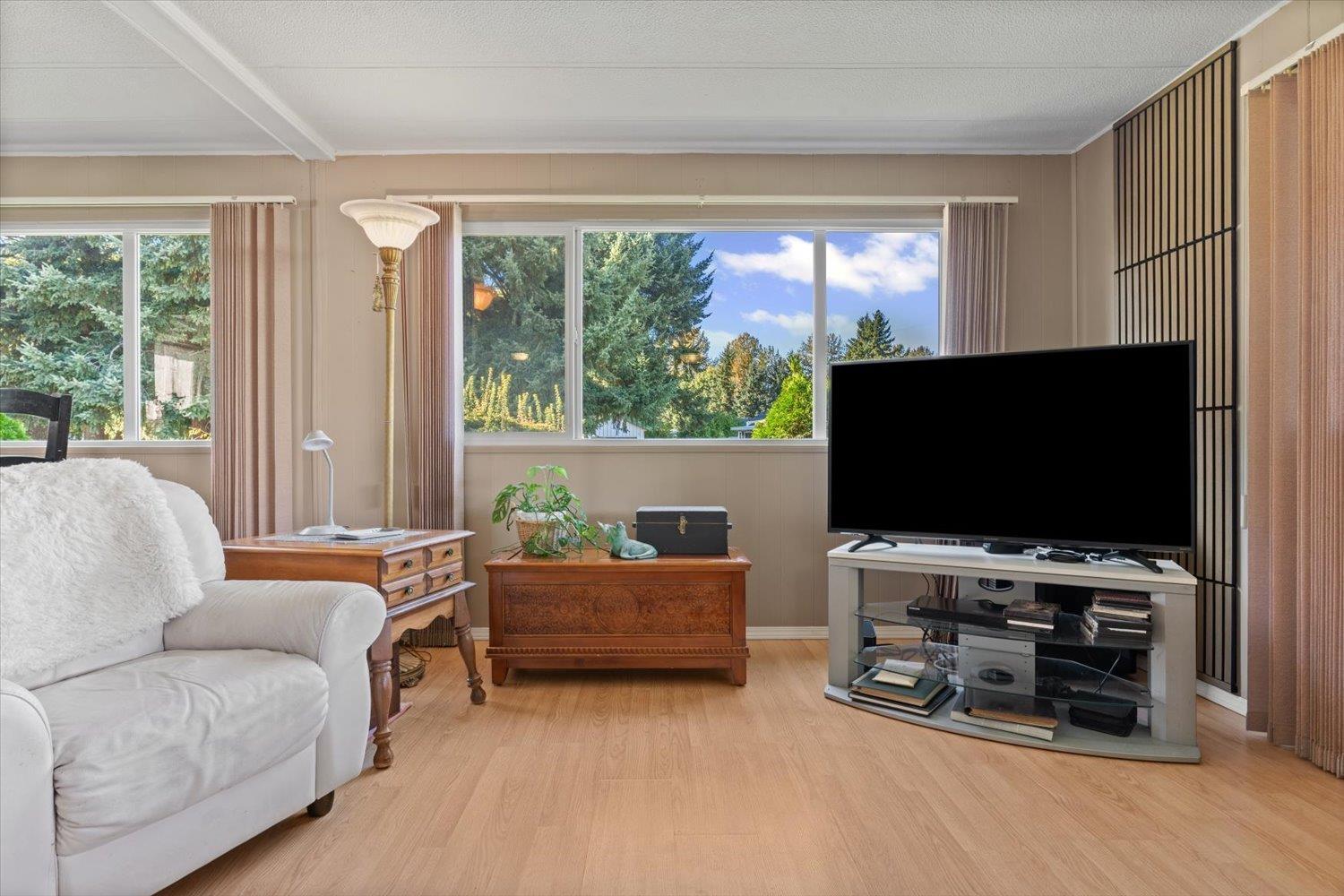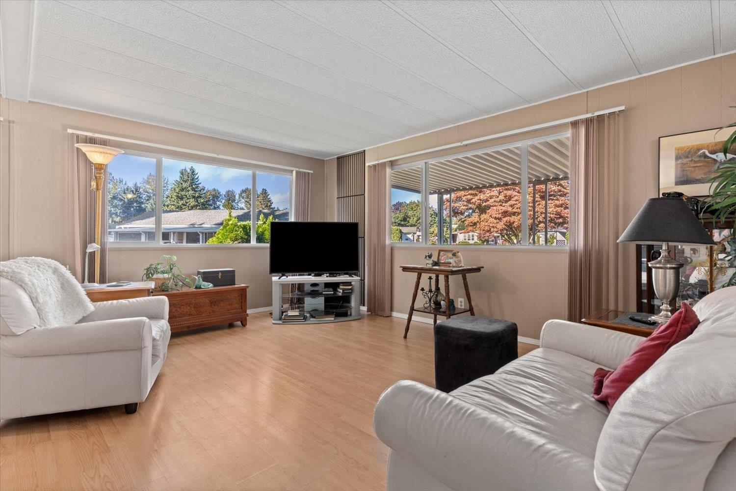 Welcome to Paradise Park, one of Abbotsford's most welcoming and secure 55+ communities, where you can enjoy the freedom of detached living without the confines of a condo. This well kept double-wide offers 2 bedrooms, 2 baths, and a bright, comfortable layout full of natural light. Lots of exterior updates in the past few years for true piece of mind! Step outside to your enclosed patio and spacious yard with two sheds and space to garden or relax. With manicured grounds, friendly neighbors, one small pet allowed, and a price suited to a senior budget, this is easy, independent living at its best. (id:44393)