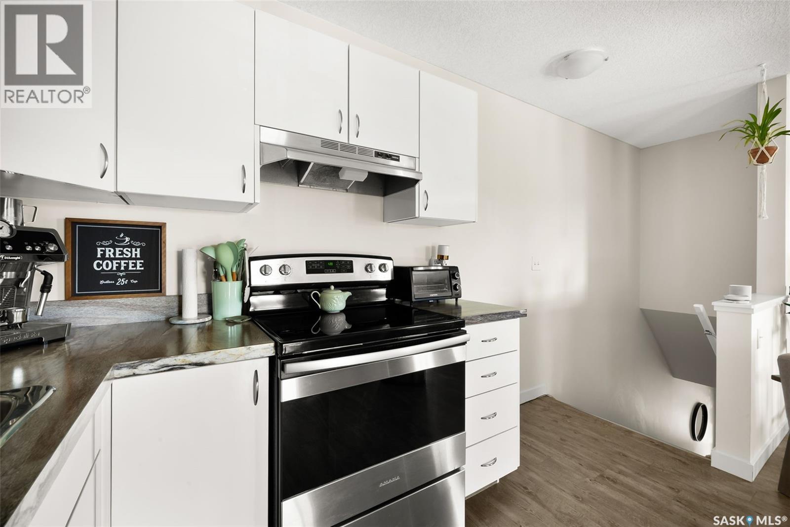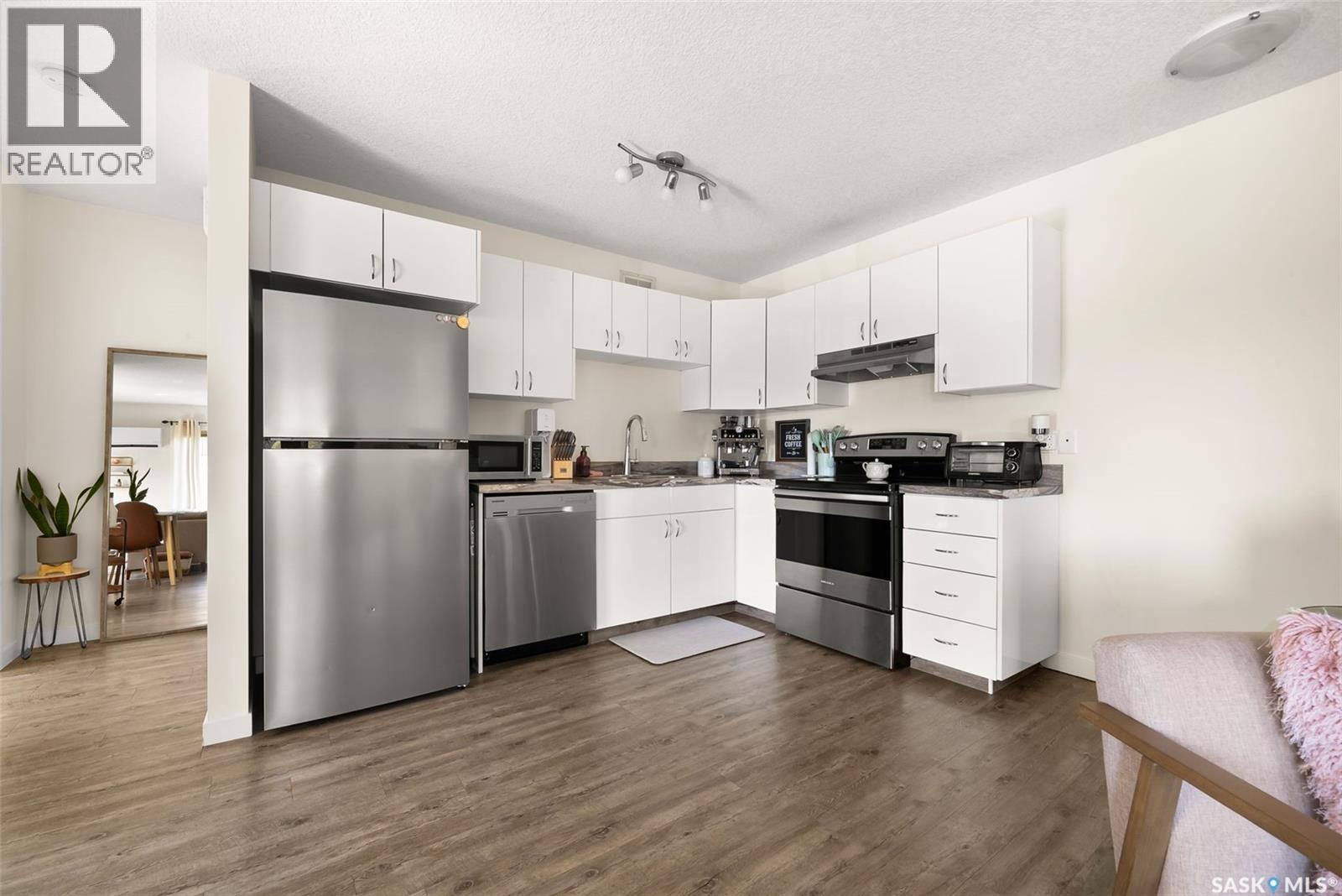 $256.80 MonthlyLooking for a move in ready and updated condo with a single detached garage, look no further! This upper level unit with a balcony was totally updated in 2021 with new flooring throughout, updated kitchen cabinets and counters, new stainless steel appliances, updated 4 piece bathroom, freshly painted plus new water heater! This cute as a button condo is open plan and has lots of light. The living room is flanked with windows and has a garden door to the balcony. The white kitchen has room for an eat in dining table. There are 2 good sized bedrooms and a 4 piece bathroom. The insuite laundry has room for some storage and houses the stacking washer/dryer. The single detached garage #3 and the surface parking stall #114 are just the cherry on top. Recent updates: new toilet summer 2025, new kitchen tap, new blinds & drapes, and new closet doors and shelves in the primary bedroom. Close to schools, parks, shopping, restaurants and other amenities plus quick access to public transit and the Lewvan. (id:44393)