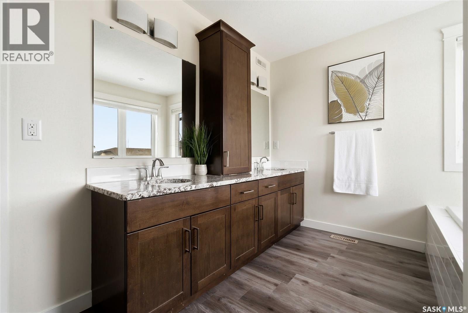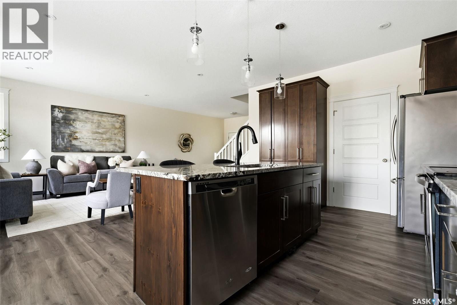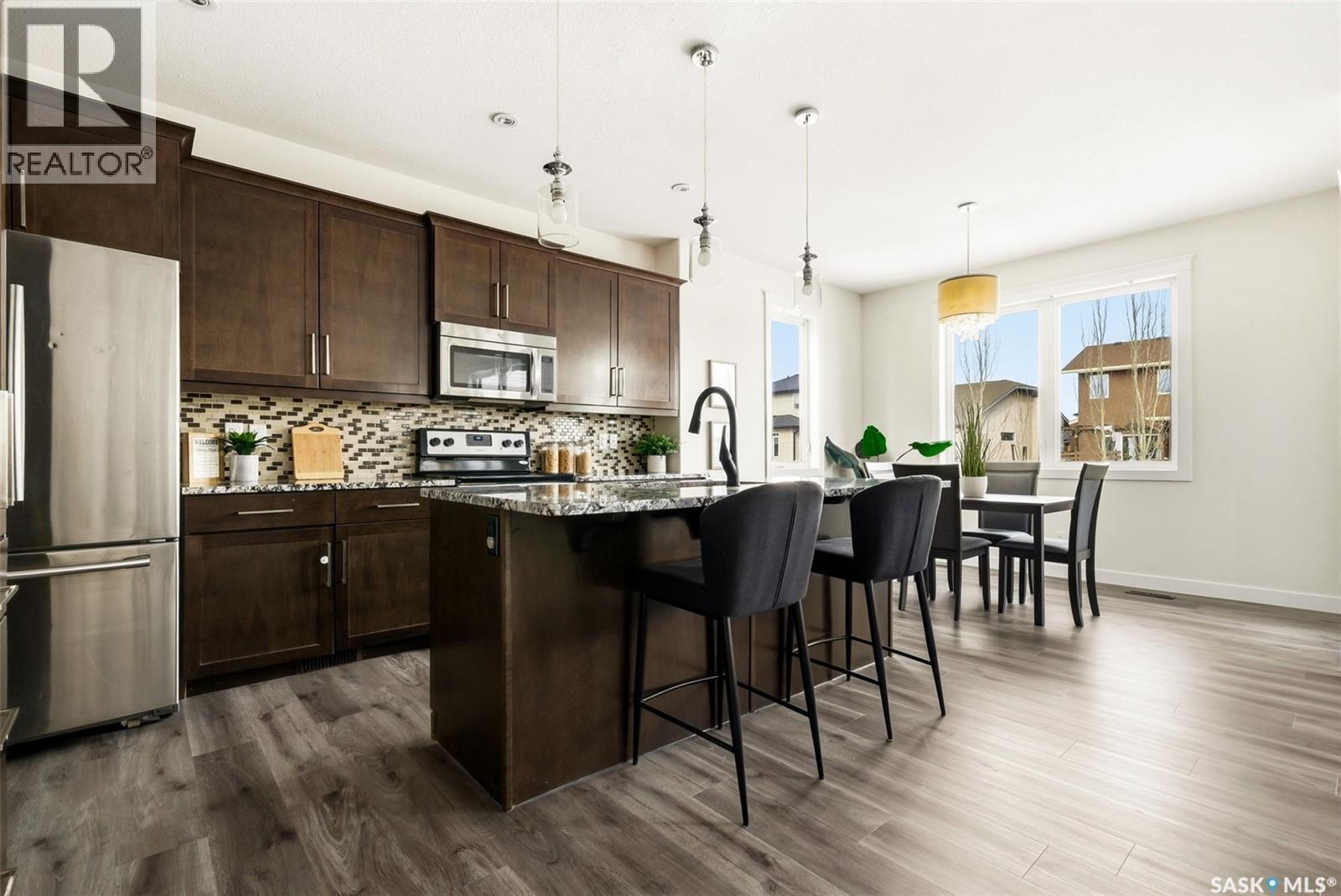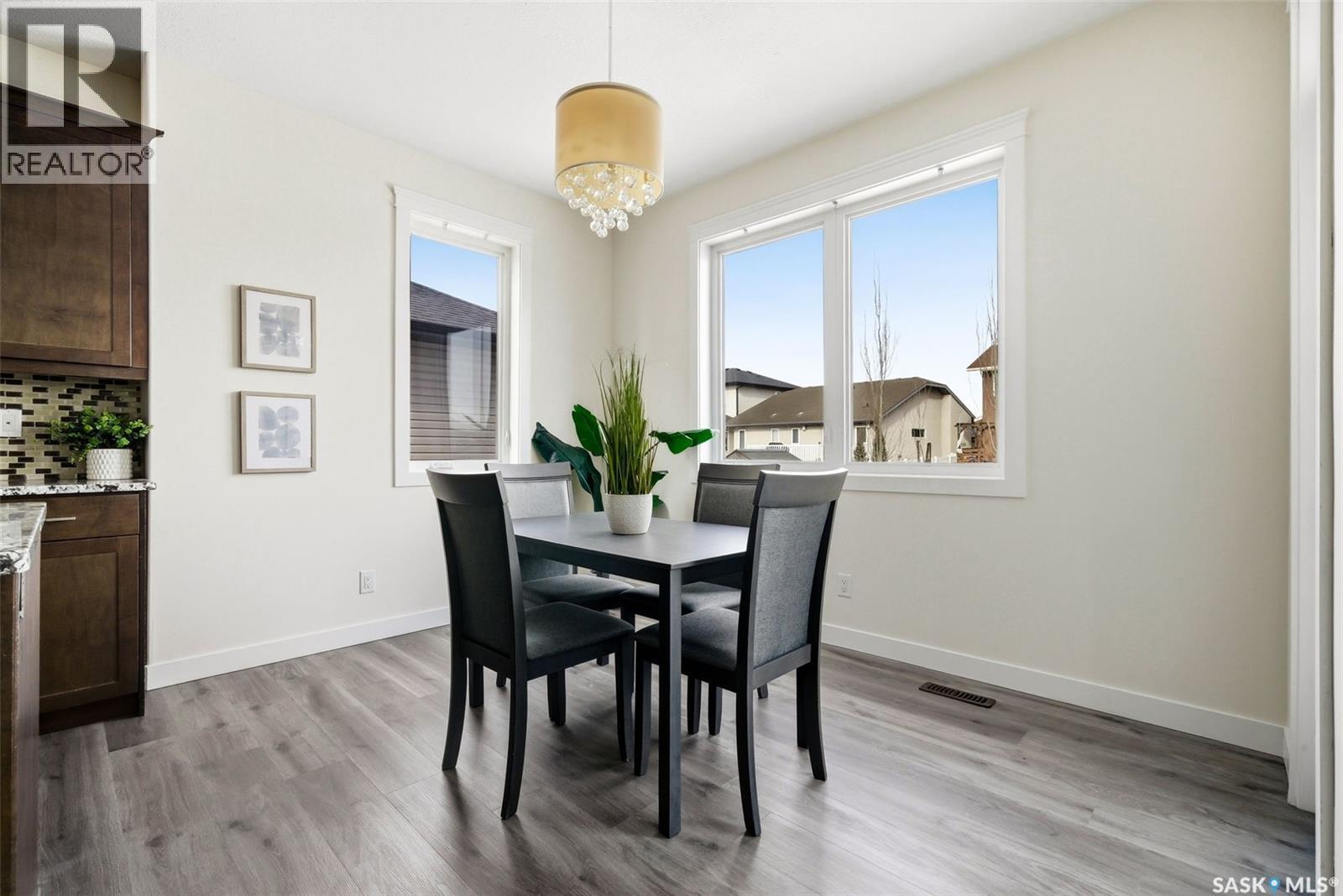 Welcome to 4830 Green Apple Drive, located in the heart of the desirable Greens on Gardiner neighbourhood. This custom-built two-storey offers over 1,730 sq. ft. of well-designed living space, featuring 4 bedrooms and 4 bathrooms, plus a fully developed basement with separate side entrance. Open-concept main floor features 9-foot ceilings and newer vinyl plank flooring throughout, creating a bright and modern living space. A convenient mudroom area leads to the double attached garage, adding functionality for everyday living. The spacious living room is filled with natural light thanks to large windows overlooking the backyard. The kitchen is beautifully finished with espresso-toned maple cabinetry, a built-in pantry, granite countertops, tile backsplash, soft-close drawers, and a large island perfect for meal prep or casual dining. The adjoining dining area provides plenty of space for family gatherings and features a garden door leading to the back deck with gas BBQ hookup. The deck overlooks the fully fenced backyard with lawn, offering great space for outdoor enjoyment. A two-piece powder room is conveniently located near the front closet and garage entrance. Upstairs, the second level offers three good-sized bedrooms, including a spacious primary suite featuring a large walk-in closet and a five-piece ensuite with jetted tub, double vanity with granite countertops, and separate shower. The second level also includes a full four-piece main bathroom and convenient second-floor laundry. New carpet throughout the second level adds a fresh feel. Fully developed basement, with separate side entrance, features a large recreation room with wet bar area, an additional spacious bedroom, and a four-piece bathroom with granite vanity, offering great extra living space. This home is ideally located within walking distance to École Wascana Plains School and École St. Elizabeth, as well as parks, walking paths, and all east-end amenities. As per the Seller’s direction, all offers will be presented on 03/19/2026 7:00PM. (id:44393)