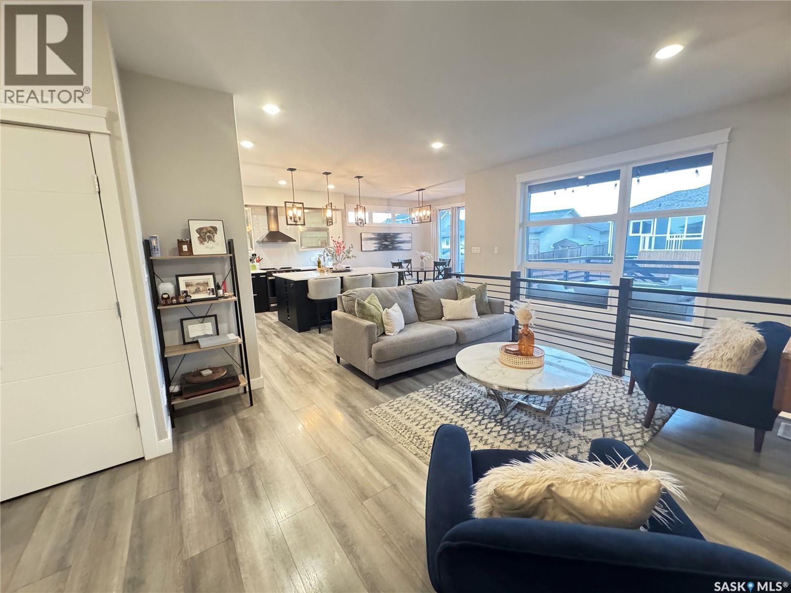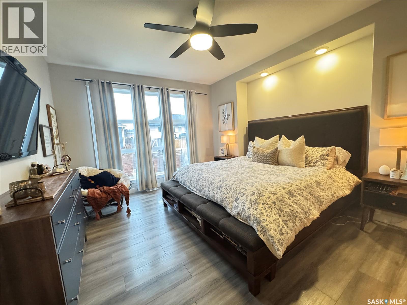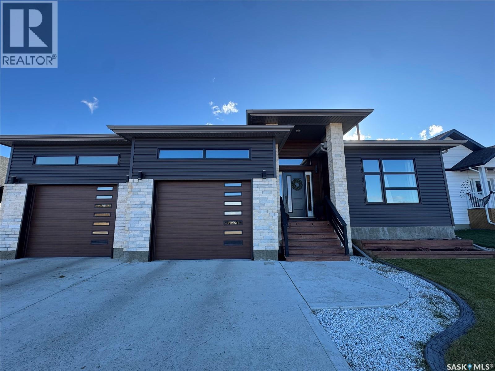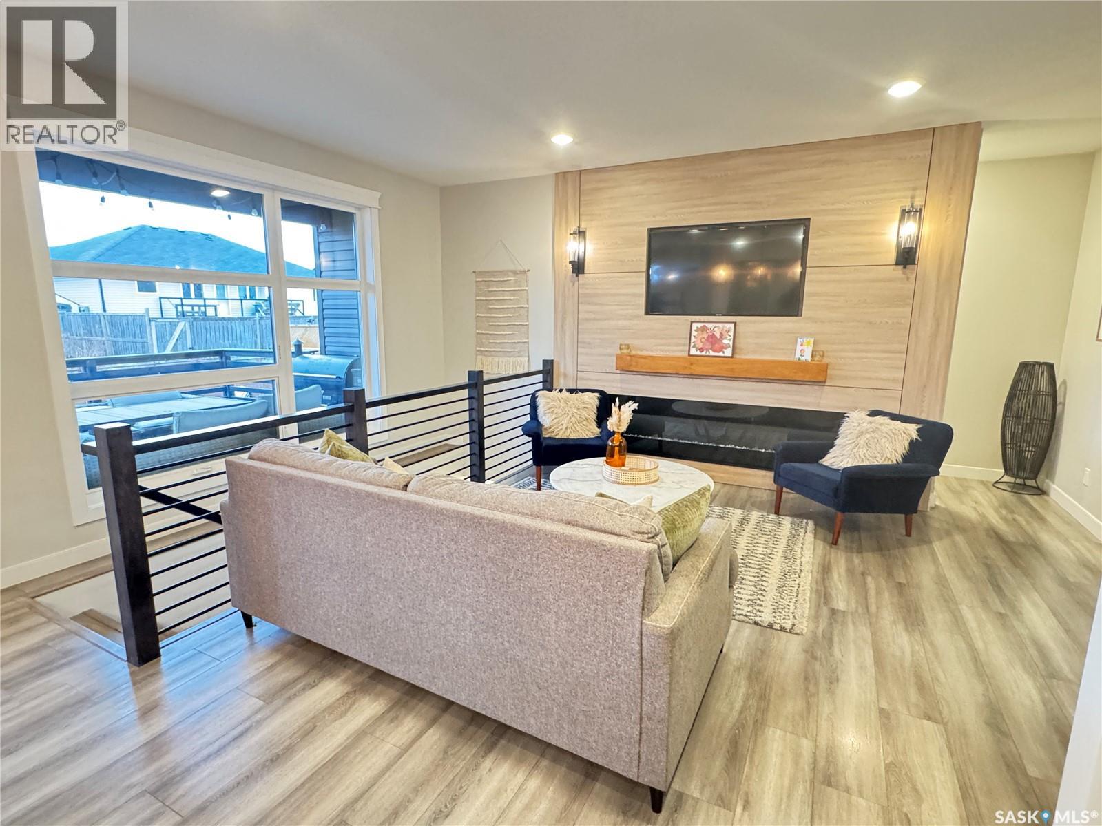 Welcome to this stunning modern-style 2 + 2 bedroom raised bungalow, ideally situated in Humboldt’s sought-after North Division—just a short walk from the hospital and Humboldt’s beautiful 18-hole golf course. Step inside to a bright, open-concept main floor featuring 9-ft ceilings and stylish laminate flooring throughout. The front bedroom offers flexible space—perfect as a home office or guest room. The spacious entertaining area includes a beautifully designed kitchen with a large island, wall pantry, and dining space that overlooks the backyard with access to a covered deck—ideal for relaxing or entertaining. The main floor also features convenient laundry and a welcoming layout designed for comfort and functionality. The primary bedroom is a true retreat, complete with a beautiful 4-piece ensuite and direct access to a walk-in closet. The fully finished basement mirrors the home’s modern appeal with 9-ft ceilings, a cozy and spacious family room, and a well-equipped wet bar (or optional second kitchen for revenue potential). Two additional bedrooms, a 4-piece bath, utility room, and storage area complete the lower level, with direct access to the heated garage. Curb appeal shines with an oversized heated garage (30’ x 24’) featuring two 8’ x 10’ overhead doors, plus an additional 12’ x 10’ section with an 8’ x 6’ rear door opening to the backyard and a direct pathway to RV parking. The fully fenced yard is beautifully manicured with lush greenspace, flower gardens, and garden boxes. Additional features include central air, central vac, and garburator.?Buyer to verify all measurements. (id:44393)
