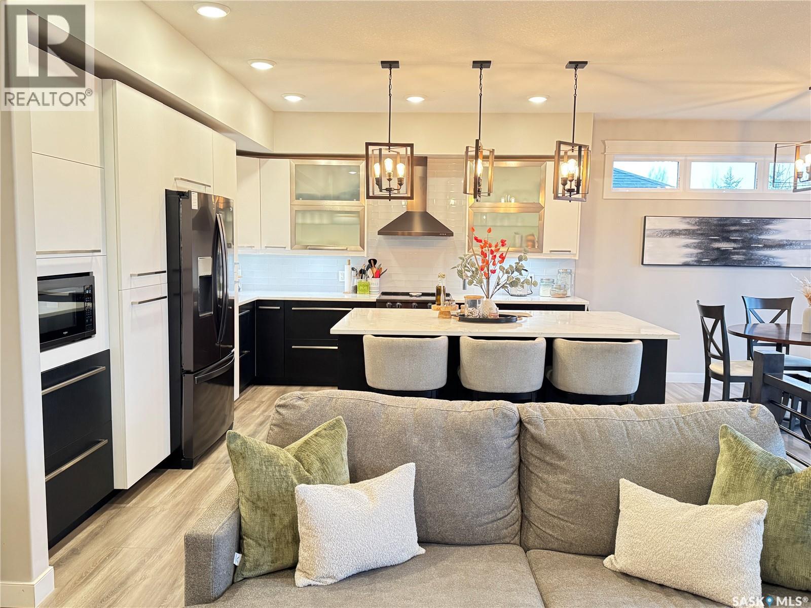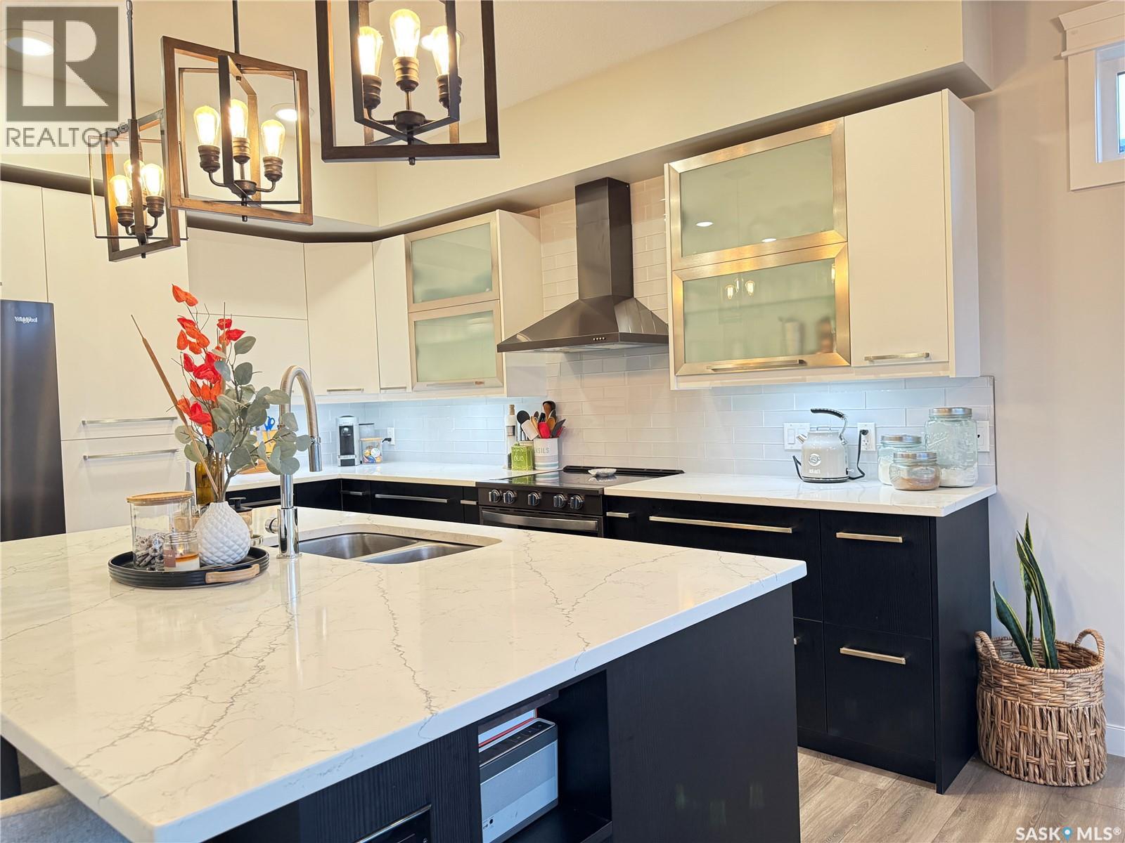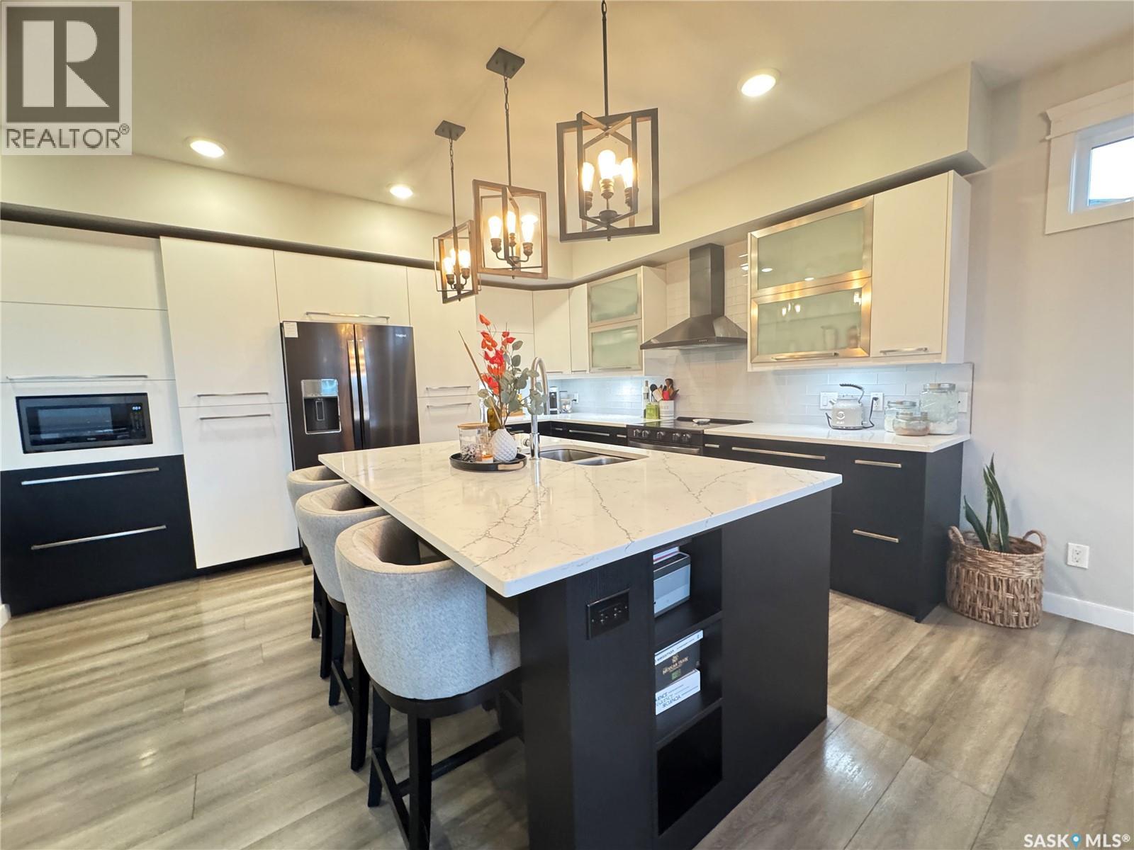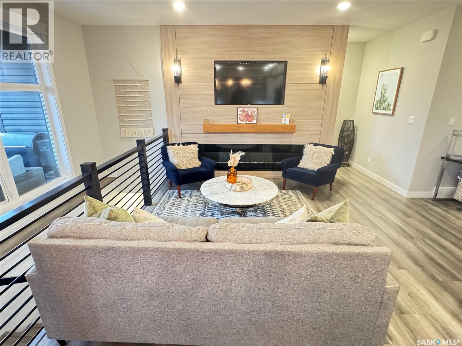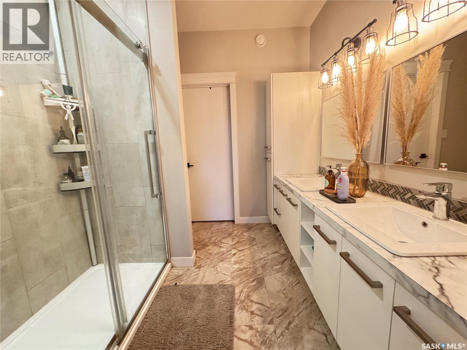 Welcome to this stunning modern-style 2 + 2 bedroom raised bungalow, ideally situated in Humboldt’s sought-after North Division—just a short walk from the hospital and Humboldt’s beautiful 18-hole golf course. Step inside to a bright, open-concept main floor featuring 9-ft ceilings and stylish laminate flooring throughout. The front bedroom offers flexible space—perfect as a home office or guest room. The spacious entertaining area includes a beautifully designed kitchen with a large island, wall pantry, and dining space that overlooks the backyard with access to a covered deck—ideal for relaxing or entertaining. The main floor also features convenient laundry and a welcoming layout designed for comfort and functionality. The primary bedroom is a true retreat, complete with a beautiful 4-piece ensuite and direct access to a walk-in closet. The fully finished basement mirrors the home’s modern appeal with 9-ft ceilings, a cozy and spacious family room, and a well-equipped wet bar (or optional second kitchen for revenue potential). Two additional bedrooms, a 4-piece bath, utility room, and storage area complete the lower level, with direct access to the heated garage. Curb appeal shines with an oversized heated garage (30’ x 24’) featuring two 8’ x 10’ overhead doors, plus an additional 12’ x 10’ section with an 8’ x 6’ rear door opening to the backyard and a direct pathway to RV parking. The fully fenced yard is beautifully manicured with lush greenspace, flower gardens, and garden boxes. Additional features include central air, central vac, and garburator.?Buyer to verify all measurements. (id:44393)