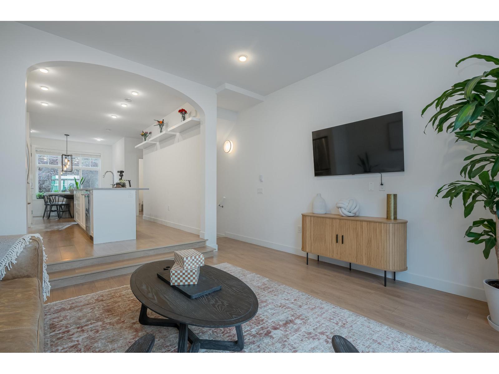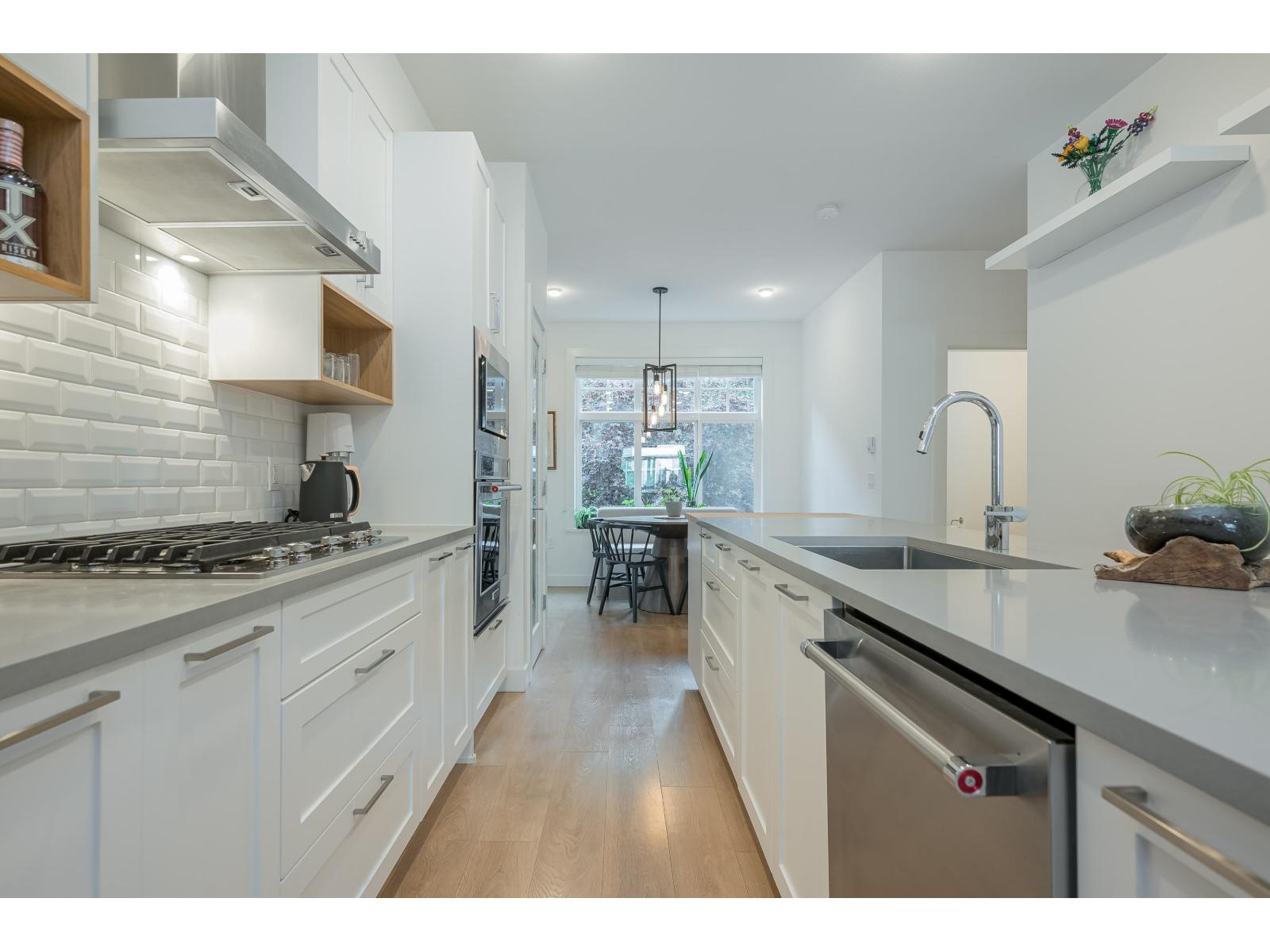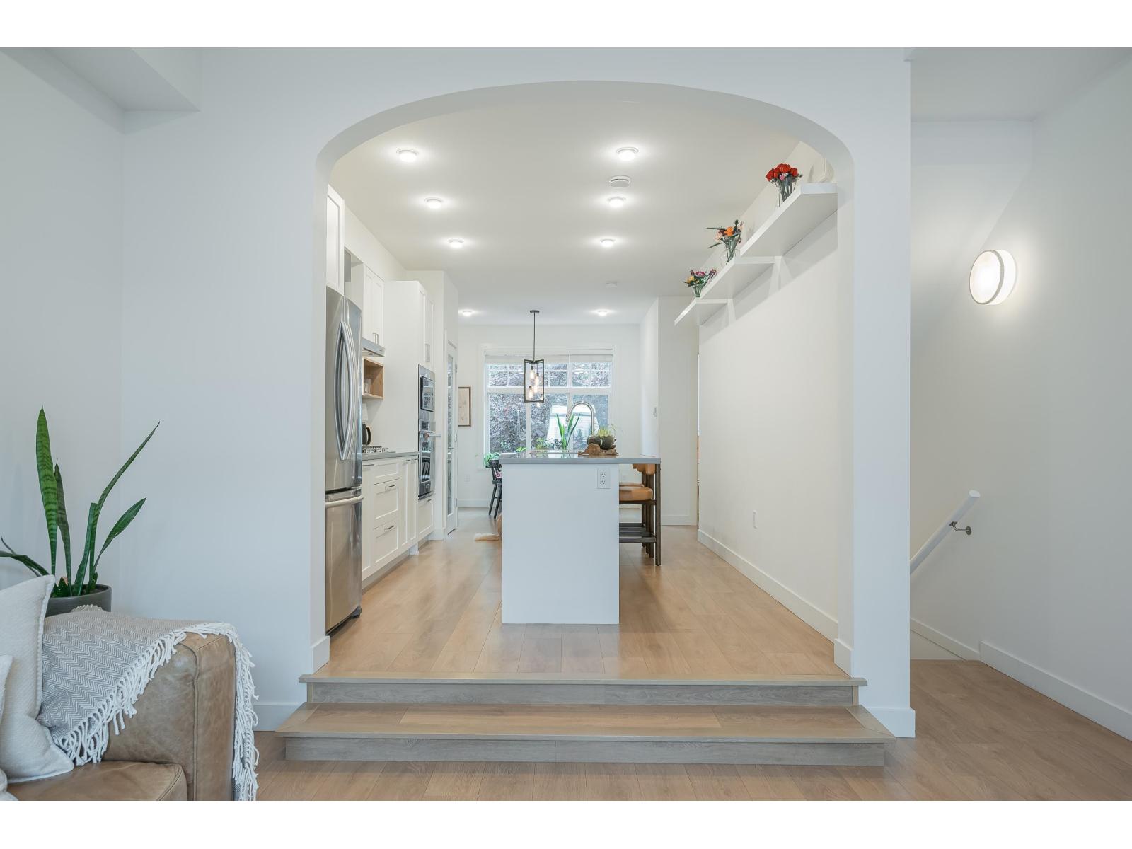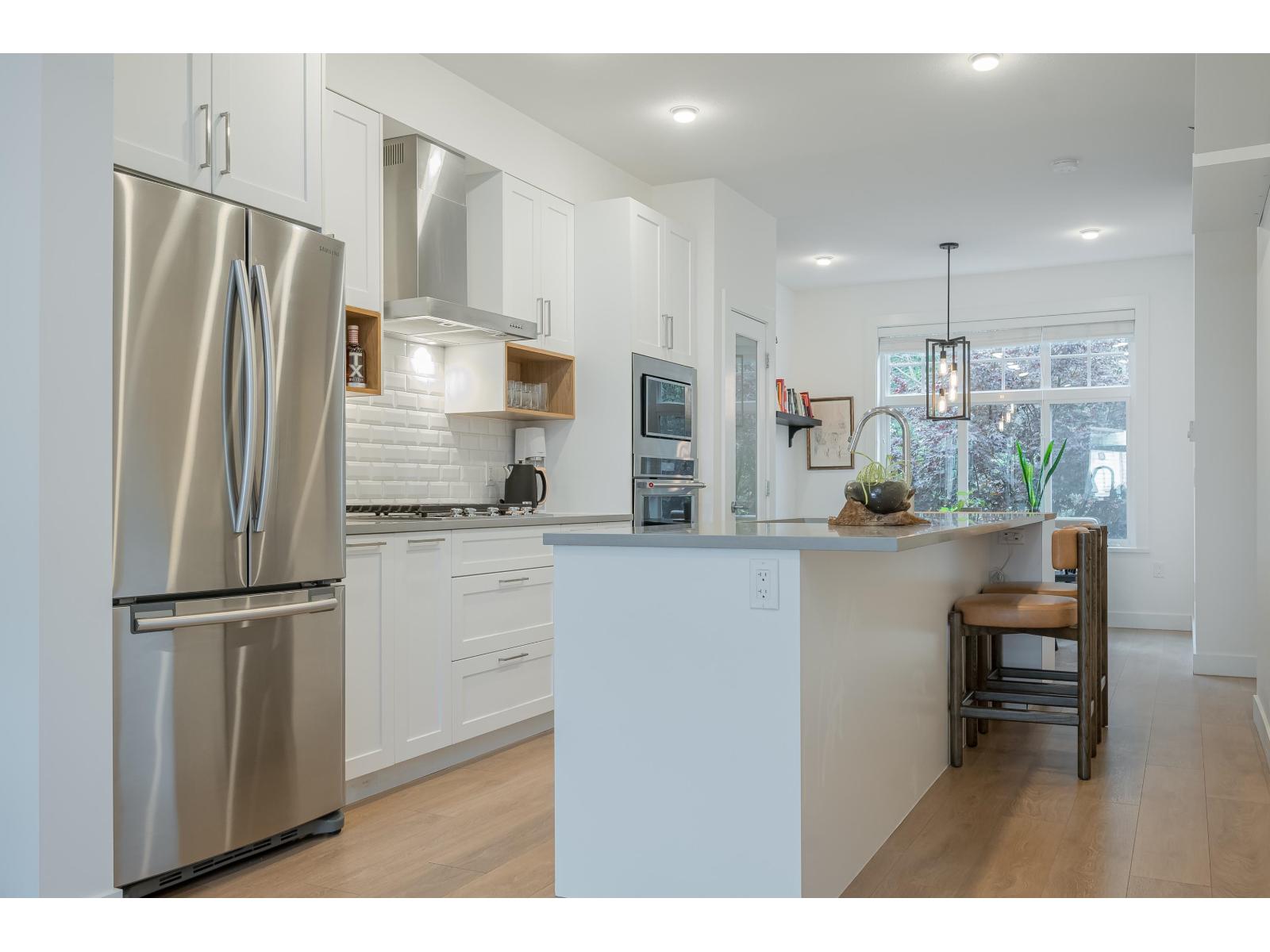 $335 MonthlyLuxurious and impeccably maintained 1401 sq. ft three bedroom unit boasting 9-foot ceilings, a gourmet island kitchen with breakfast bar, high-end stainless steel appliances, and elegant quartz countertops. This exceptional residence offers a rare 2 pc powder room on the main floor, two generously sized bedrooms upstairs with ensuite bathrooms on the upper level, and a versatile bedroom/den space downstairs with direct access to backyard that backs onto peaceful greenspace. Step outside to the expansive 15' x 10'5 deck off the living room. Ideally situated in South Surrey adjacent to The Hills Golf Course and Noble restaurant, 2 blocks to Douglas Elementary School, close proximity to a regional mall, and an array of commercial and medical amenities. (id:44393)