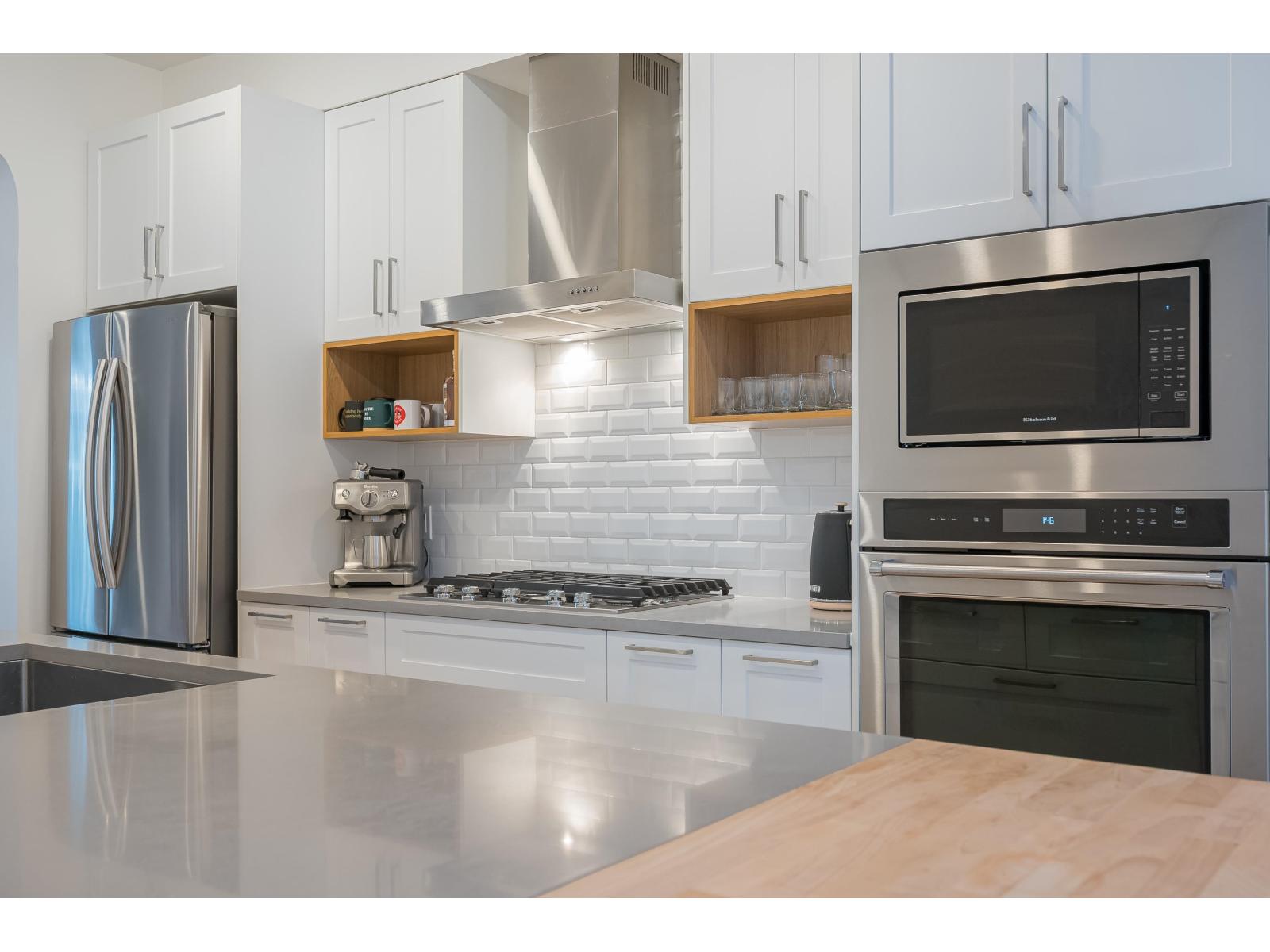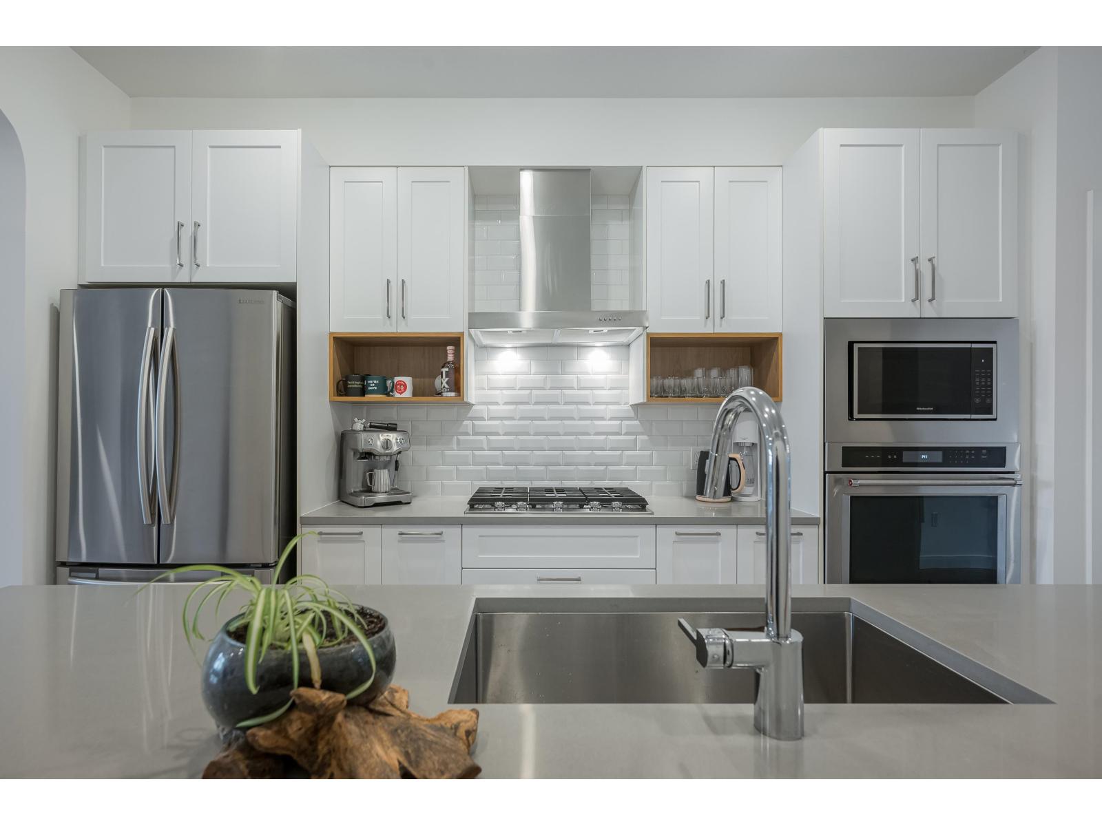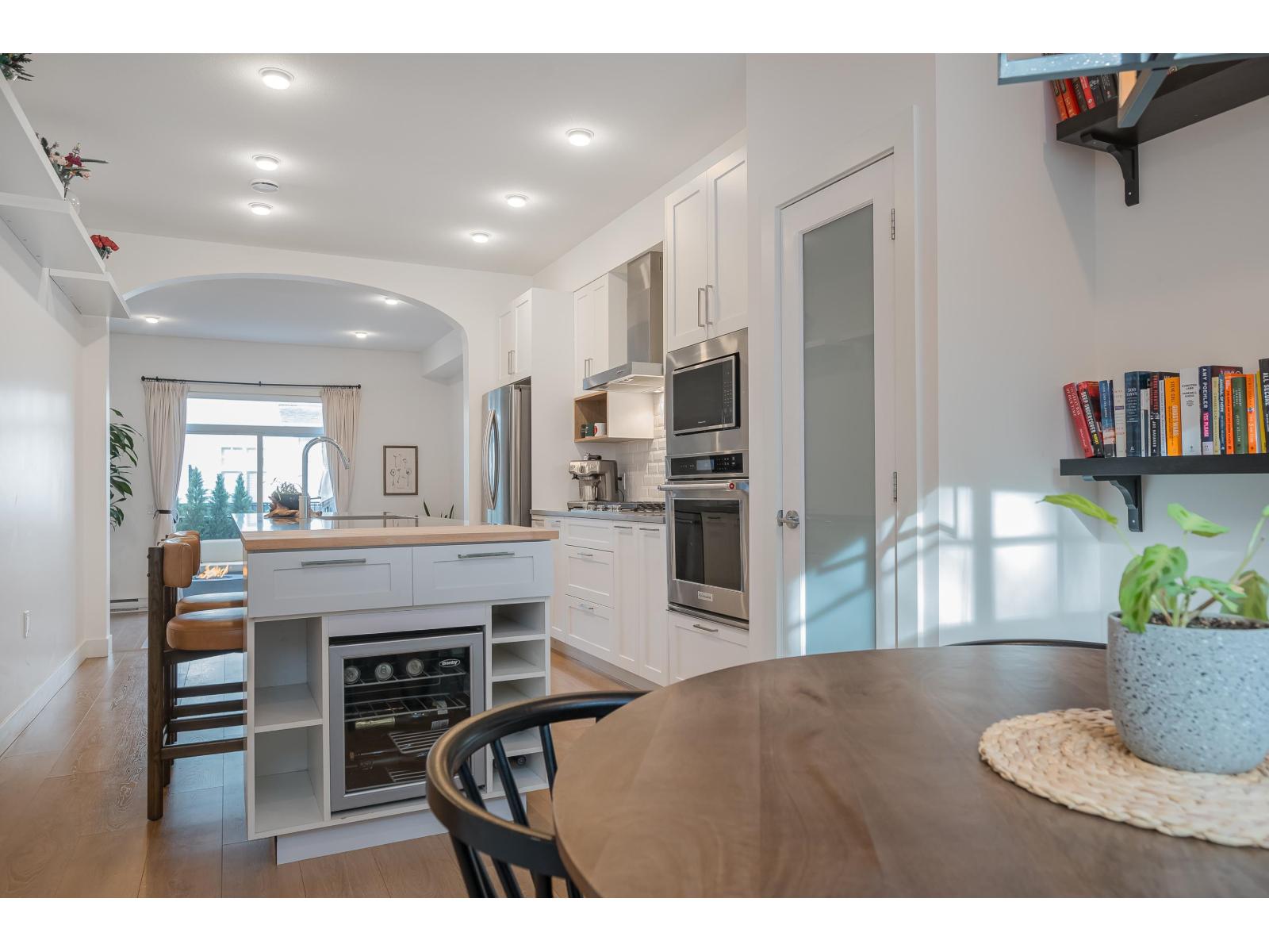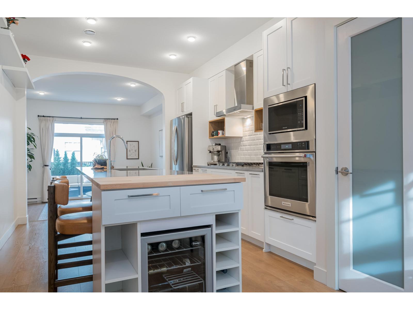 $335 MonthlyLuxurious and impeccably maintained 1401 sq. ft three bedroom unit boasting 9-foot ceilings, a gourmet island kitchen with breakfast bar, high-end stainless steel appliances, and elegant quartz countertops. This exceptional residence offers a rare 2 pc powder room on the main floor, two generously sized bedrooms upstairs with ensuite bathrooms on the upper level, and a versatile bedroom/den space downstairs with direct access to backyard that backs onto peaceful greenspace. Step outside to the expansive 15' x 10'5 deck off the living room. Ideally situated in South Surrey adjacent to The Hills Golf Course and Noble restaurant, 2 blocks to Douglas Elementary School, close proximity to a regional mall, and an array of commercial and medical amenities. (id:44393)