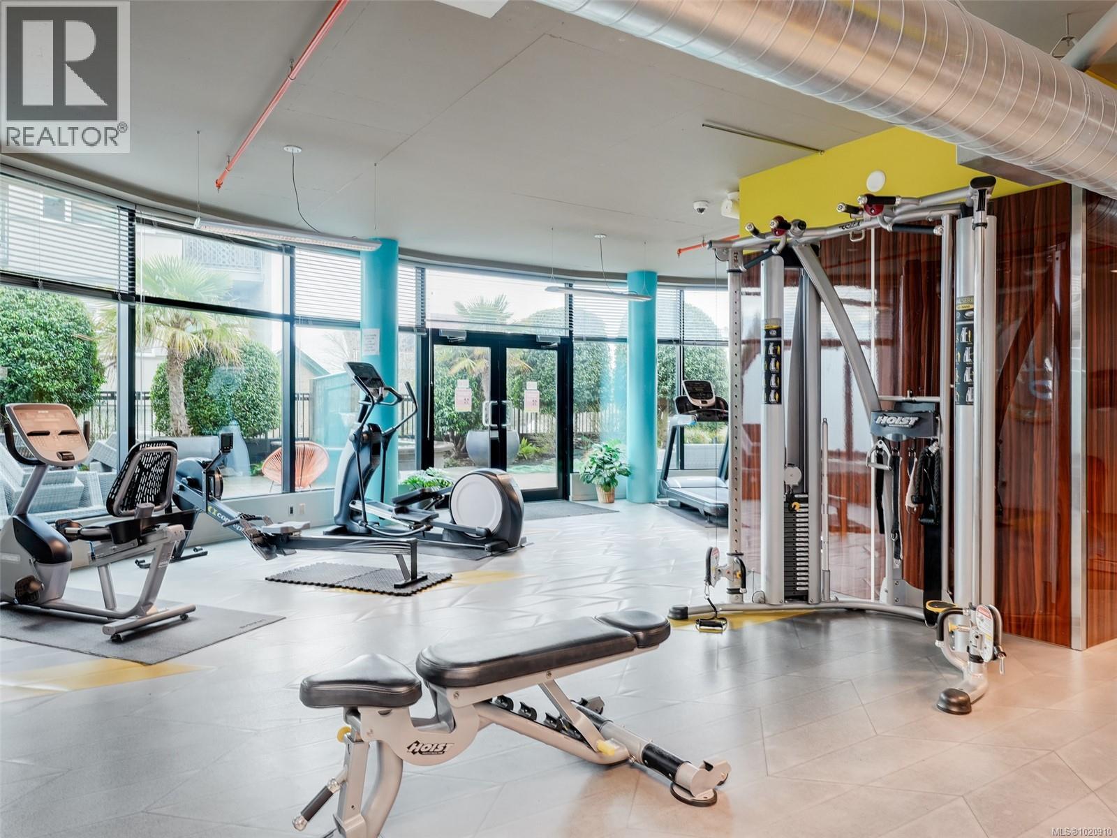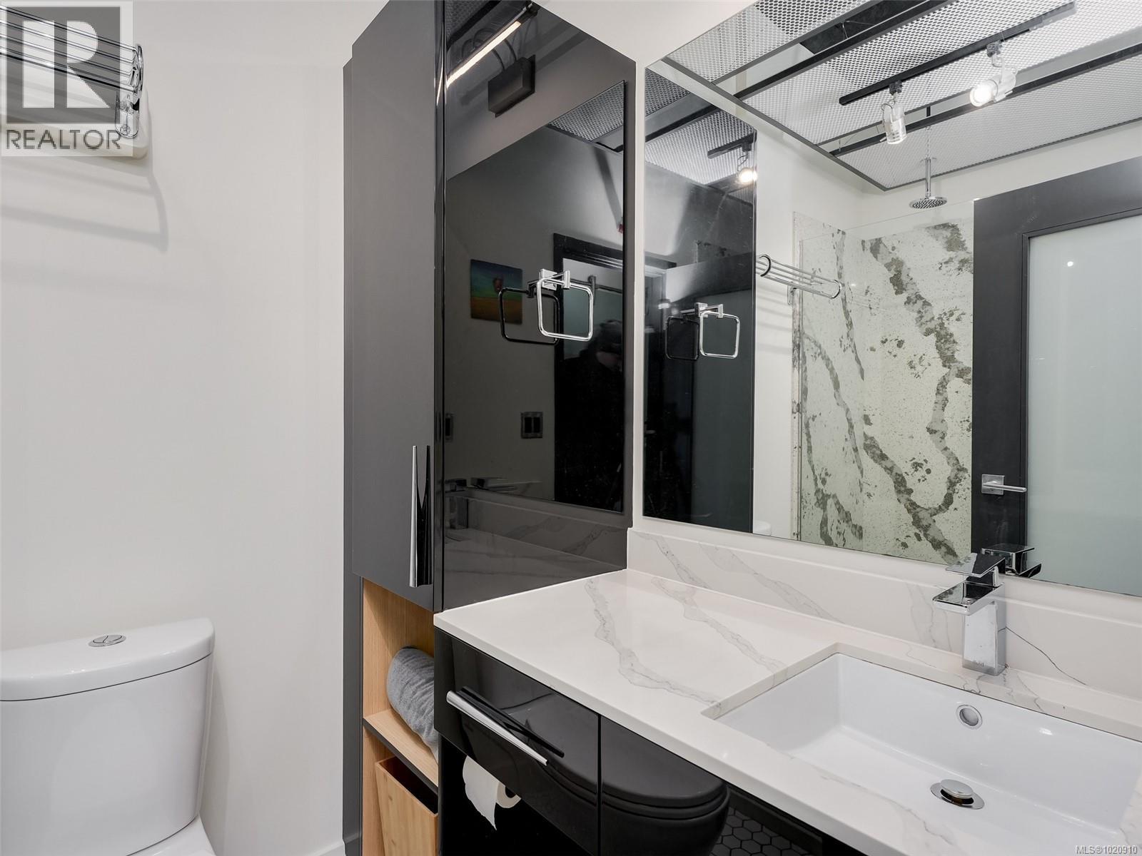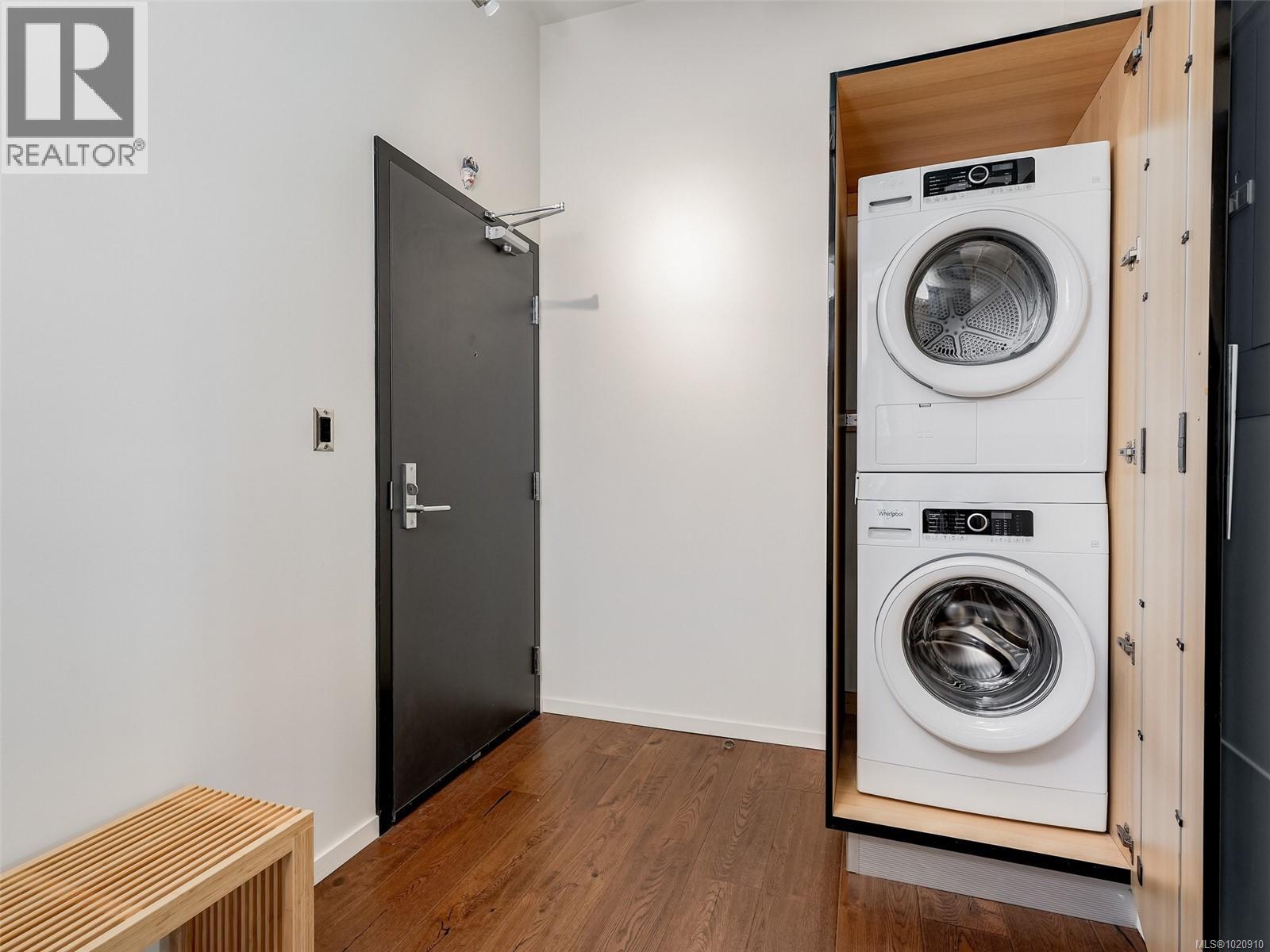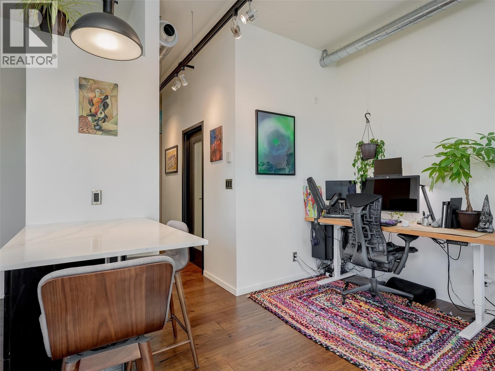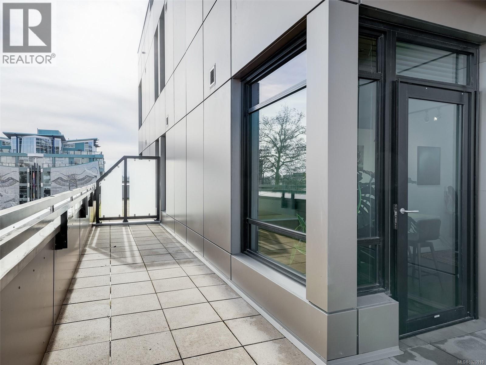 $410 MonthlyStylish one-bedroom corner unit with an expansive private terrace! Located in the Jukebox, a quality steel-and-concrete building. This home features an industrial vibe with exposed ductwork and concrete walls. Features include 10 ft. ceilings, hardwood floors, quartz countertops, premium stainless appliances, and in-suite laundry. Enjoy BBQs, and gardening from your spacious terrace. Building amenities include a fully equipped gym and a serene third-floor meditation garden exclusively for residents. Ideally situated in Harris Green on the edge of vibrant downtown Victoria, with an exceptional 98–99 walk score—steps to the Inner Harbour, Beacon Hill Park, restaurants, cafés and shops. Close to bike lanes and bus routes. Includes a secured underground parking stall, storage locker, and allows two pets. Enjoy all the convenience of living at the Jukebox!!! (id:44393)