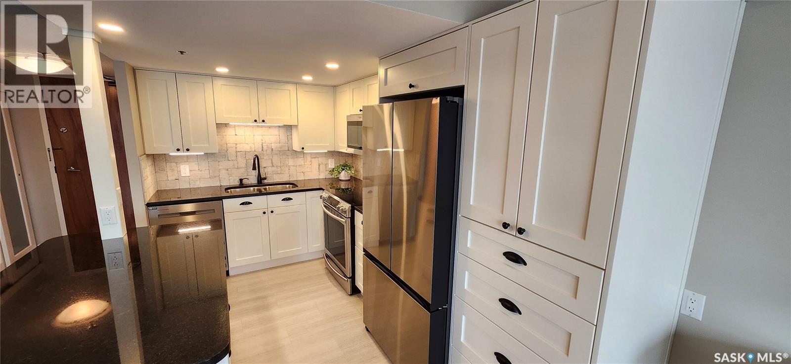 $853 MonthlyConvenient, luxurious downtown living in The Terrace condo building. Walk to the river, the U of S, & downtown amenities. This immaculate 2 bedroom / 2 bath 1076 sq ft condo is light and bright with a wall of floor to ceiling east facing windows. The new kitchen is sure to impress with quality white cabinetry, granite countertops, undermount double sinks, stainless steel appliances, updated lighting, and a huge island for food prep or entertaining. Attention paid throughout with customized closets, pantry, and storage room to maximize storage space. Boiler & forced air heat & central air conditioning keep you comfortable. Indoor heated parking. The Terrace building amenities include a swimming pool, hot tub, sauna, 4th floor community room & outdoor patio/BBQ area, a guest suite + a roof top patio for 22nd floor panoramic views. This unit and building are definitely worth a look! (id:44393)