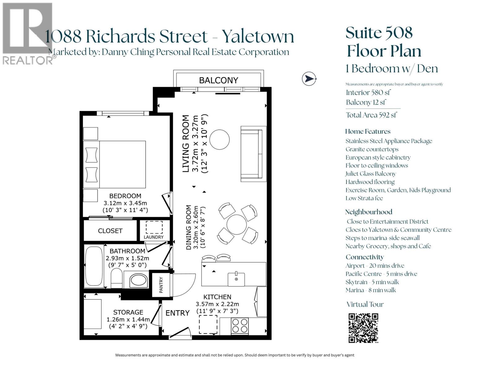 $309.26 MonthlyWelcome to Richards Living, one of Vancouver's newest contemporary buildings in the heart of Yaletown. This bright 1 bedroom + den home features an efficient open-concept layout with no wasted space, floor-to-ceiling windows, and a balcony. The chef-inspired kitchen offers stainless steel appliances and granite countertops, with matching granite in the bathroom. The den is ideal for a home office or extra storage. Enjoy great amenities including a rooftop garden, fitness room, bike room, and visitor parking. Includes 1 parking stall. Perfectly positioned on a quiet, residential block with no retail below, yet steps to restaurants, transit, Emery Barnes Park, shops/services, and the Seawall. One of Yaletown's most sought-after buildings. Call your Realtor for a private showing (id:44393)