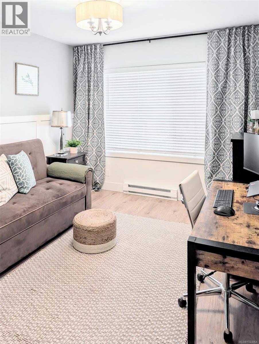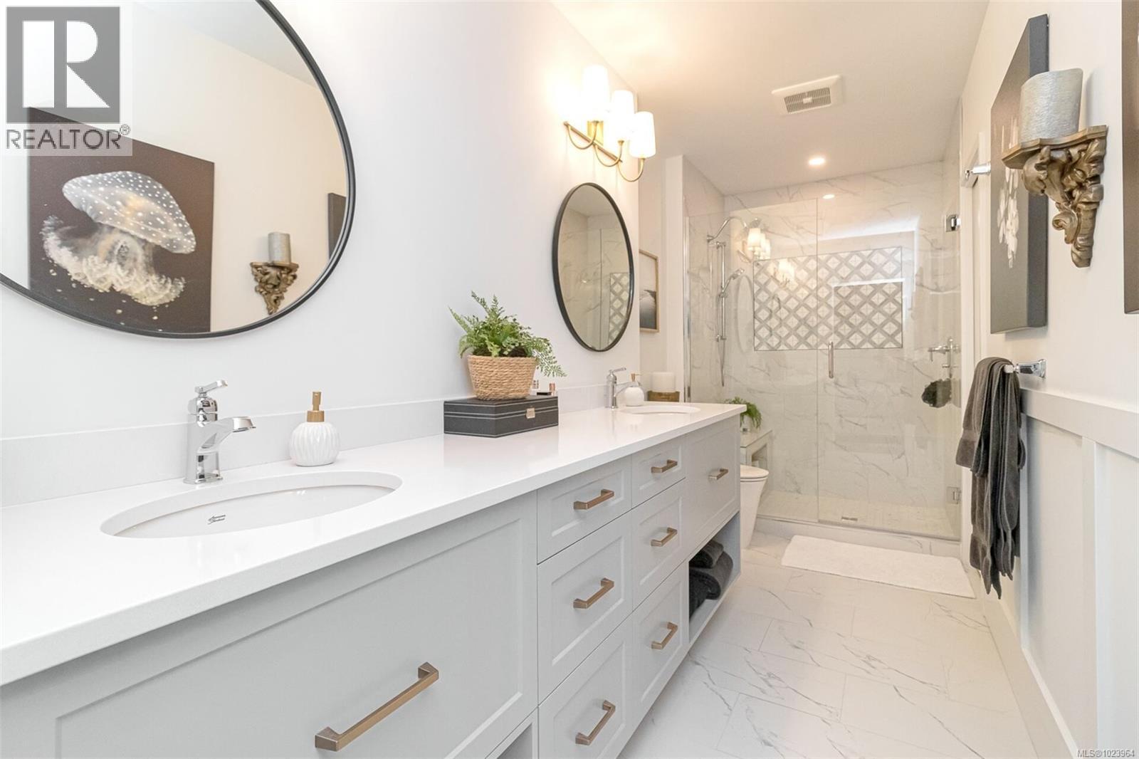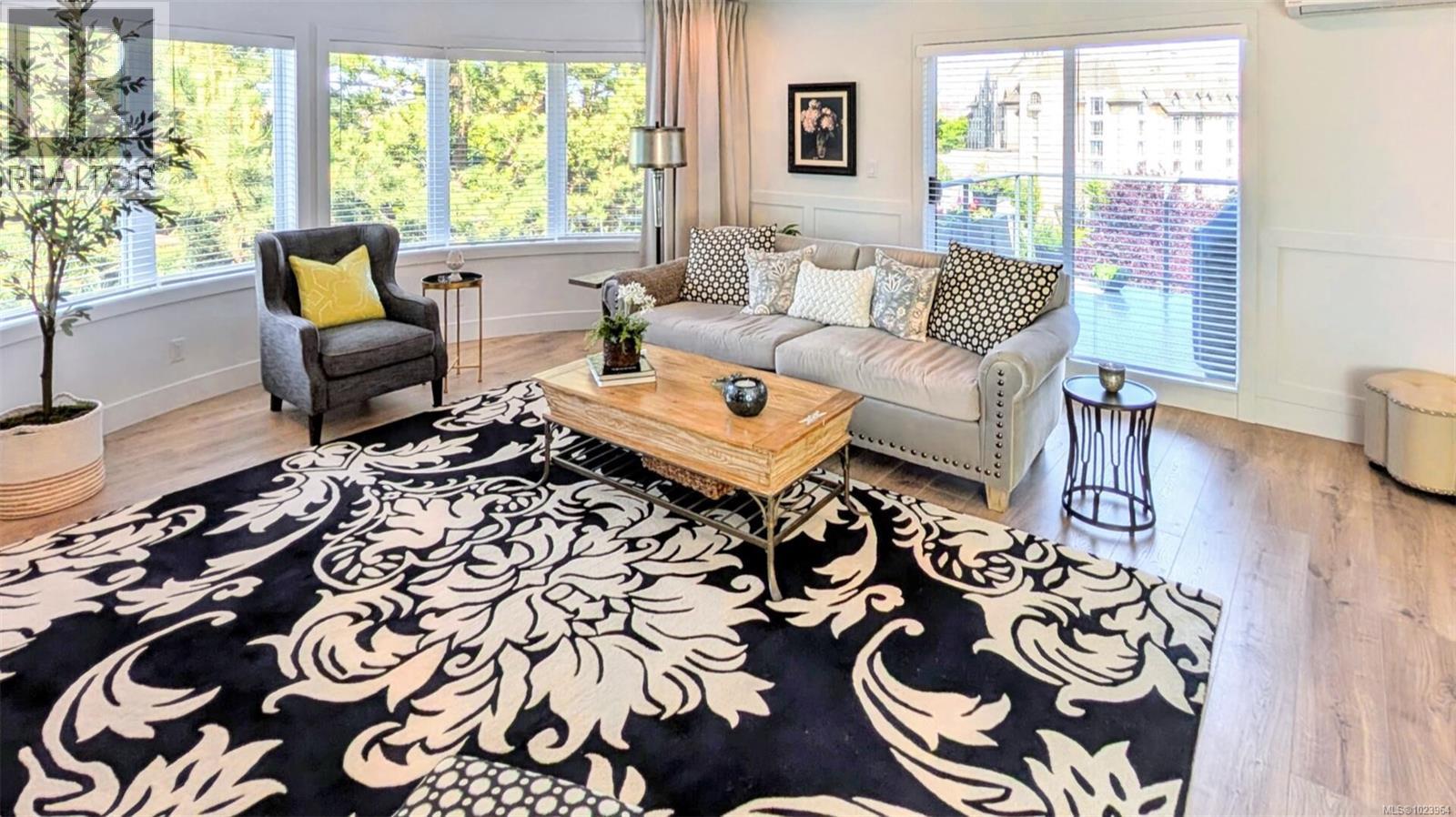 $855 MonthlyStunning top floor, corner unit, with partial water view. Stripped back to its studs in 2023 - everything in this condo is new. Custom cabinetry; quartz counters; wide plank floors; heated tile in bathrooms; natural gas F/P w/cast stone mantel; S/S appliances; Epoxy deck; & Heat/AC pump. Rooms are generously sized in this open plan which includes windows on three sides. Kitchen boasts a 9ft. peninsula - ample prep space/room for entertaining. It also houses a coffee/wine bar, pantry cabinet, and area for a bistro table. Primary bdrm with W/I closet, & access to the deck = a great place to enjoy morning coffee or cocktails & BBQ. Ensuite has 8 ft. double vanity & over-sized tile shower with 2 spray heads & bench. 2nd bdrm acts as an office/guest room & provides a bright space for guests, alongside the conveniently located main bath. In-suite laundry provides plenty of room & extra storage. Well-managed bldg with large CRF. Conveniences: secure u/g parking with car wash area, storage locker, beautifully landscaped courtyard, lounge & boardroom, bike storage, and community rooftop deck overlooking the harbour. “Location, Location” aptly applies here - an 8 min. walk to downtown restaurants & shops, a 15 min. walk to the Parliament buildings, and the Songhees Walkway & Galloping Goose Trail are both located mere steps from your front door. This West Coast styled beauty is immaculate - and ready for you to call home. (id:44393)