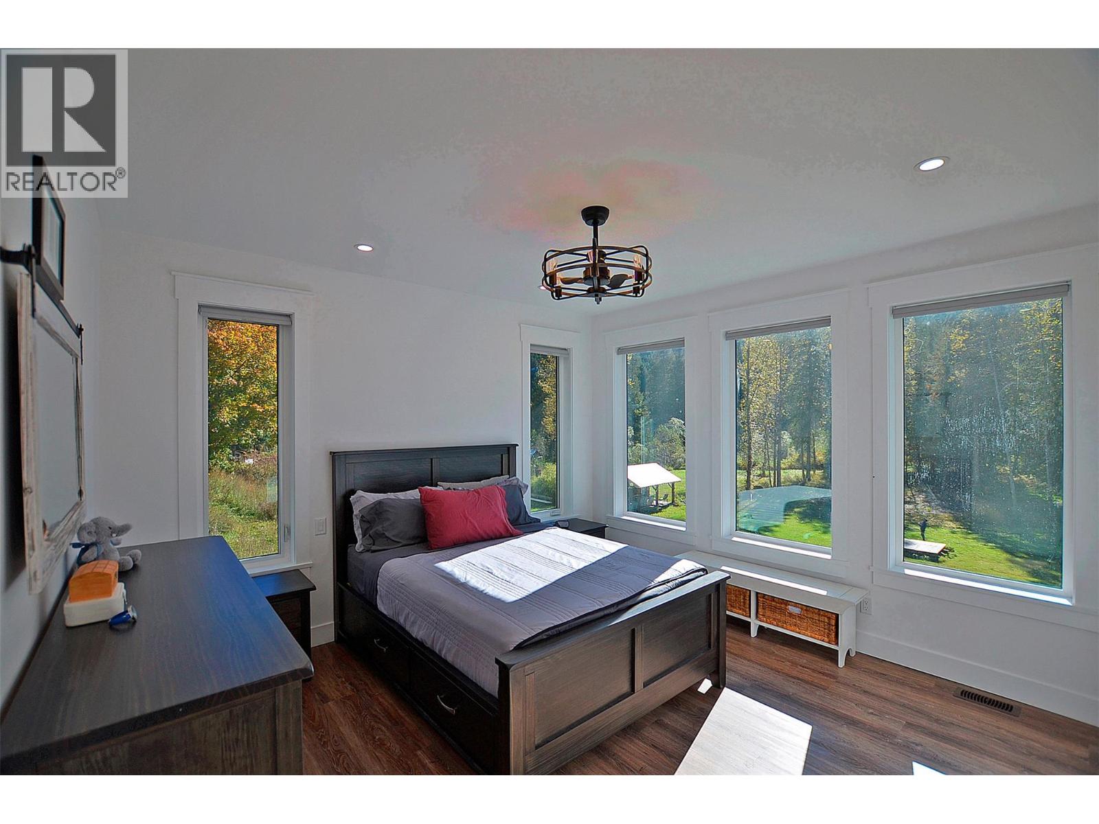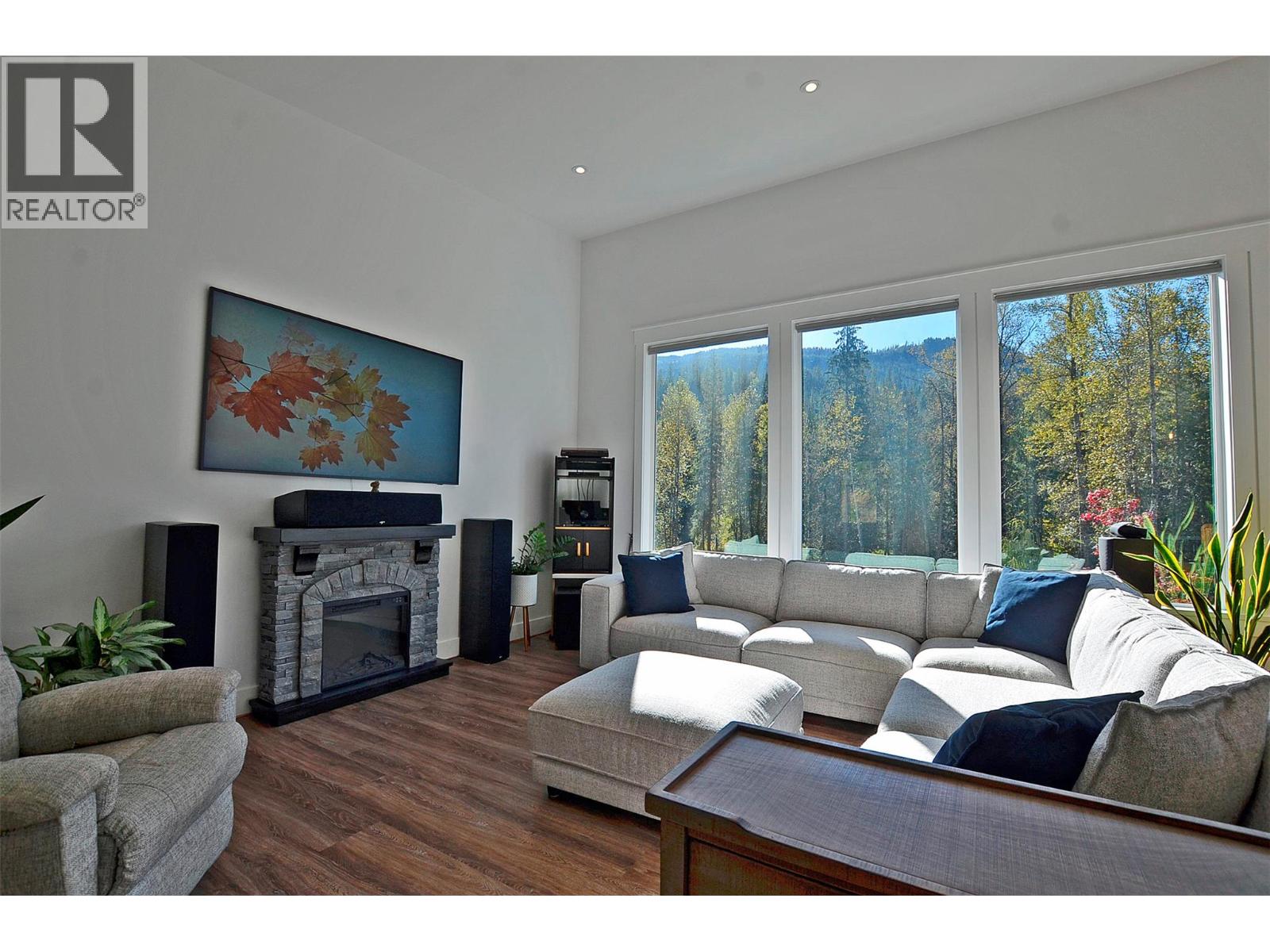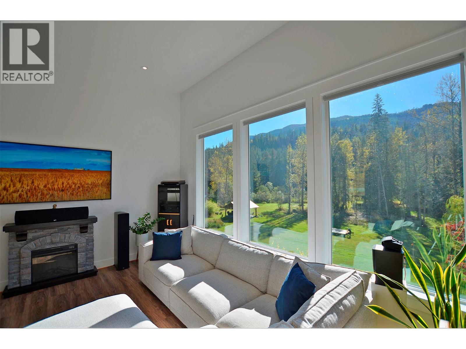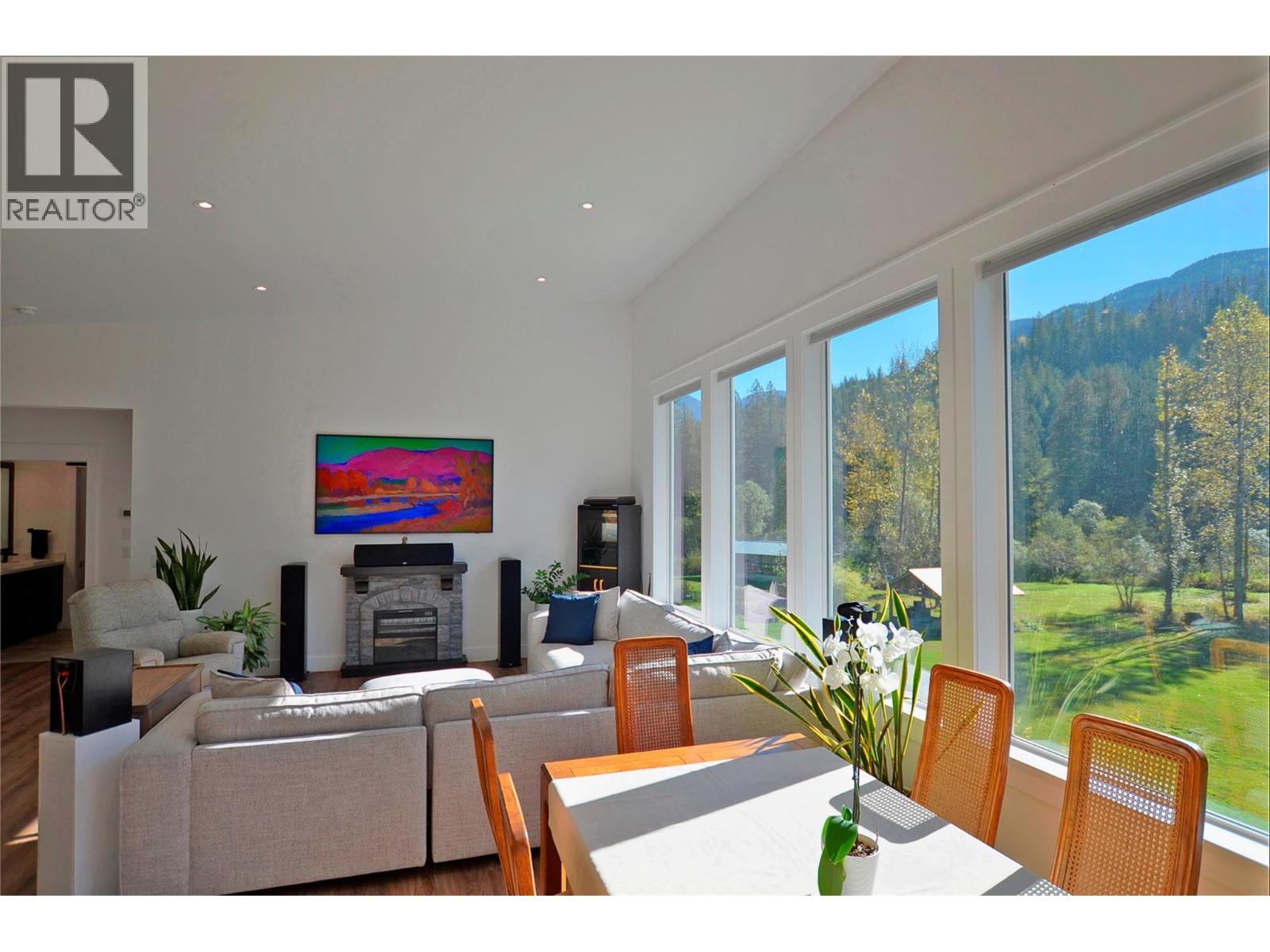 A breathtaking view can be yours in this stunning, fully-developed 4-bedroom home, completed in 2025. It blends rural lifestyle with convenient access to shopping, schools, and recreation such as sledding, skiing, and boating. Situated on a 7.39-acre parcel 1km from the Crazy Creek Hot Pools Resort, between Sicamous and Revelstoke, it's ideal for entertaining or tranquil treed walks to a sandy beach on the pristine Eagle River to enjoy fishing and swimming. The residence is designed with an open bright layout, high vaulted ceilings, noise-reducing windows, and a walk-out lower level. The kitchen and bathrooms are equipped with quality cabinetry, countertops, stylish light fixtures, and modern appliances. Kitchen highlights include a serving island, soft-close doors and deep drawers for functional storage. The living areas feature an electric fireplace and covered deck access. The finished lower level provides an expansive versatile space, two more bedrooms, laundry, utility, and patio-yard access. The home features blackout blinds, ceiling fans, heat pump AC, and is hot tub-ready with two electrical services. An adjacent residential building currently functions as a large studio/suite with a hot tub. Outside buildings include a garden shed, equipment shed, gazebo, woodshop, and RV pad with full hookups. With its accessible location, stunning views, garden and socializing areas, this setting can become your private oasis! (id:44393)