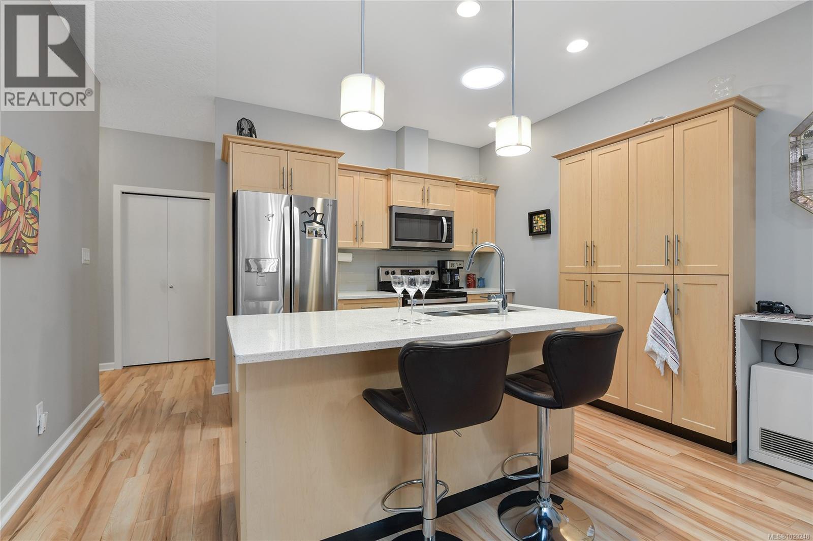 $681 MonthlyMotivated Seller! Welcome to RiversEdge Village, nestled in the prestigious Sunriver Estates! This beautifully appointed 3-bedroom Rancher offers easy one-level living with an attached garage while overlooking the Sunriver Nature Trail Park! Step inside to discover an open-concept floor plan, and a stylish kitchen featuring stone countertops and a large island perfect for entertaining. Outside, the fully landscaped yard boasts a charming cherry tree, raised garden beds, stonework, and fine wood details. A versatile backyard cabin serves perfectly as a private office/storage, alongside a practical shed and covered outdoor entertaining area. Enjoy access to the RV/Boat storage area and community Club House—ideal for hosting private gatherings. With scenic walking trails and the Sooke River just steps away, this home offers the perfect blend of nature, comfort, and community living. QUICK POSSESSION POSSIBLE! (id:44393)
