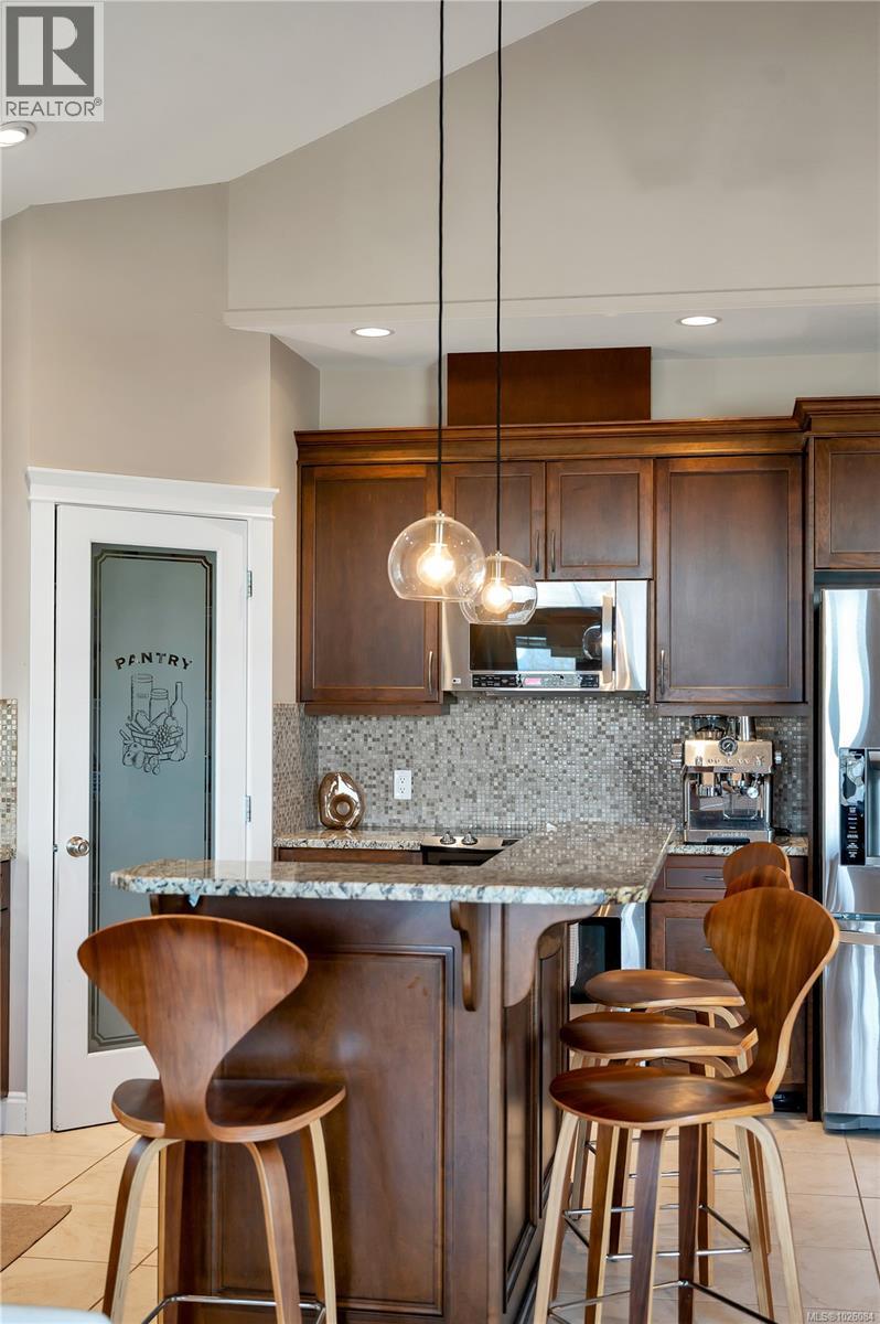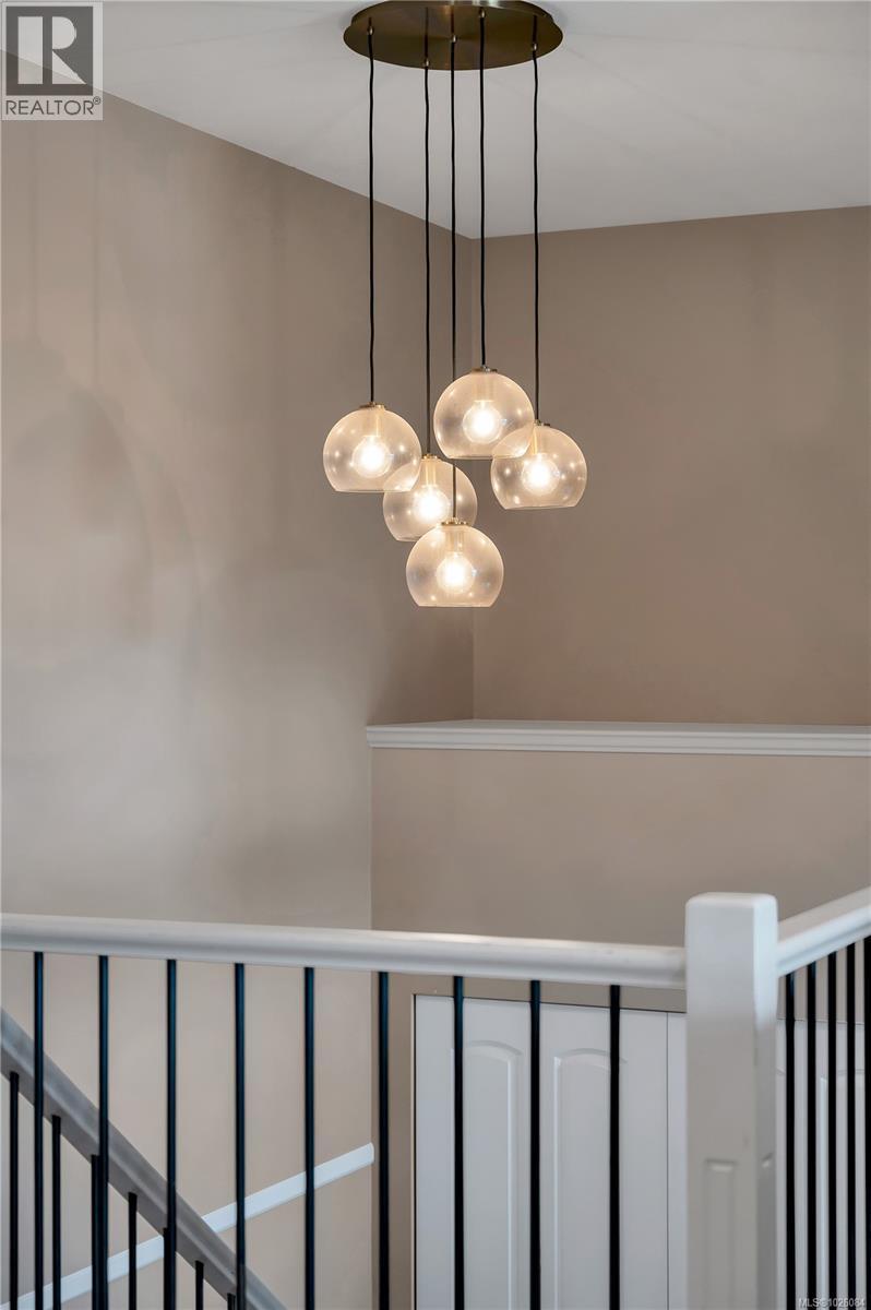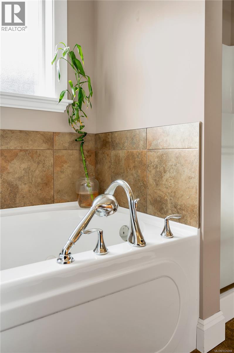 Positioned on an elevated lot in Georgia Park, this refined 4 bed, 3 bath home offers space, views & connection to nature. 14 ft vaulted ceilings & an open layout create light & flow. From the kitchen, dining & living room, enjoy ocean & mountain views, anchored by a gas fireplace. The kitchen features granite counters, heated tile floors, walk in pantry & raised breakfast bar, with heated floors also in the upstairs bathrooms. Updated interior lighting adds elegance, while modernized exterior fixtures enhance curb appeal. The covered front deck with natural gas hookup extends your living space year round & the backyard features a sunken patio, a relaxed lounging retreat. The primary suite includes a jetted tub, rain shower, double sinks & walk in closet. Downstairs offers 2 bedrooms, full bath & flex space with suite potential. Steps to forested trails, pond & a short walk to the ocean. Double garage, landscaping & irrigation make this a compelling choice in the Campbell River market. (id:44393)