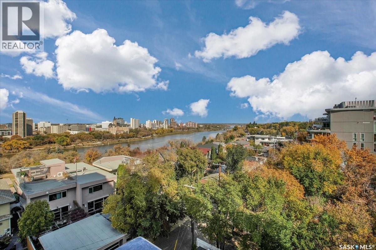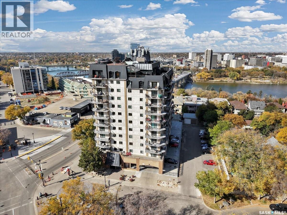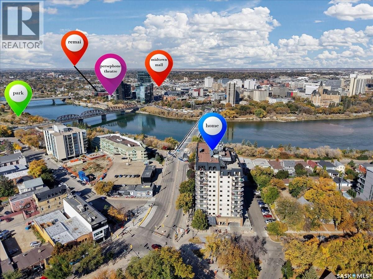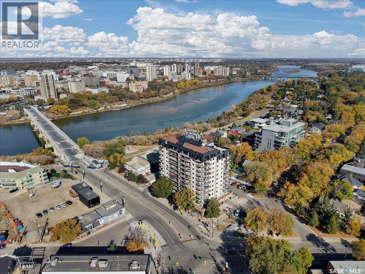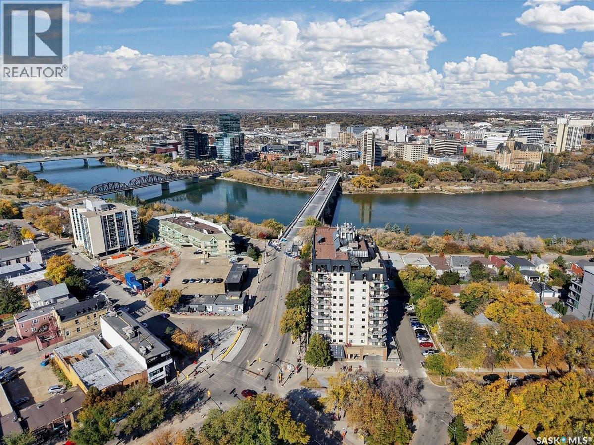 $533 MonthlyPerched on the 7th floor at the top of the iconic Broadway Bridge, this spacious 2-bedroom, 1-bathroom condo offers the ultimate blend of city living and riverside tranquility. Step out your door and you're moments away from the heart of downtown, where boutique shops, vibrant restaurants, and cozy cafes line the streets. Or head down Broadway itself, alive with pubs, live music, and eclectic local flair. Just beyond your balcony, the river glistens over the treetops—your own private view of Saskatoon’s scenic riverbank and all its walking trails. Inside, the generous living space opens up to a balcony that lets you soak in sweeping views of the water and skyline. Whether you're hosting a dinner in the dedicated dining room, unwinding in the large primary bedroom, or settling guests into the second bedroom, there's room to relax and recharge. The 4-piece bathroom offers both comfort and convenience, while the well-equipped kitchen is ready for your morning coffee or evening culinary adventures. When you're not enjoying the festivals and fairs just steps from your building, take advantage of the condo's amenities room—a great spot for gathering with friends, family, or fellow residents. Your unit also comes with one secure underground parking space, complete with a handy storage locker right in front. This is more than just a condo—it's a lifestyle at the center of everything. As per the Seller’s direction, all offers will be presented on 10/08/2025 1:00PM. (id:44393)