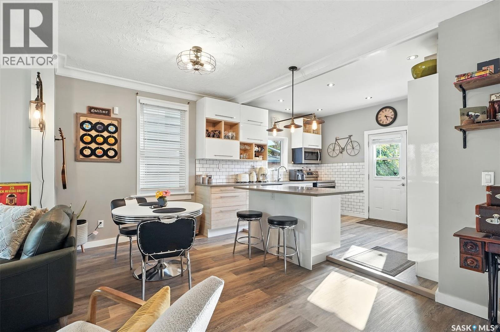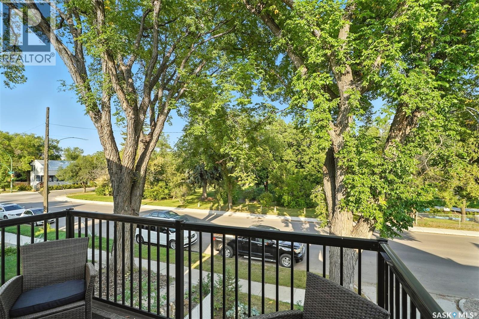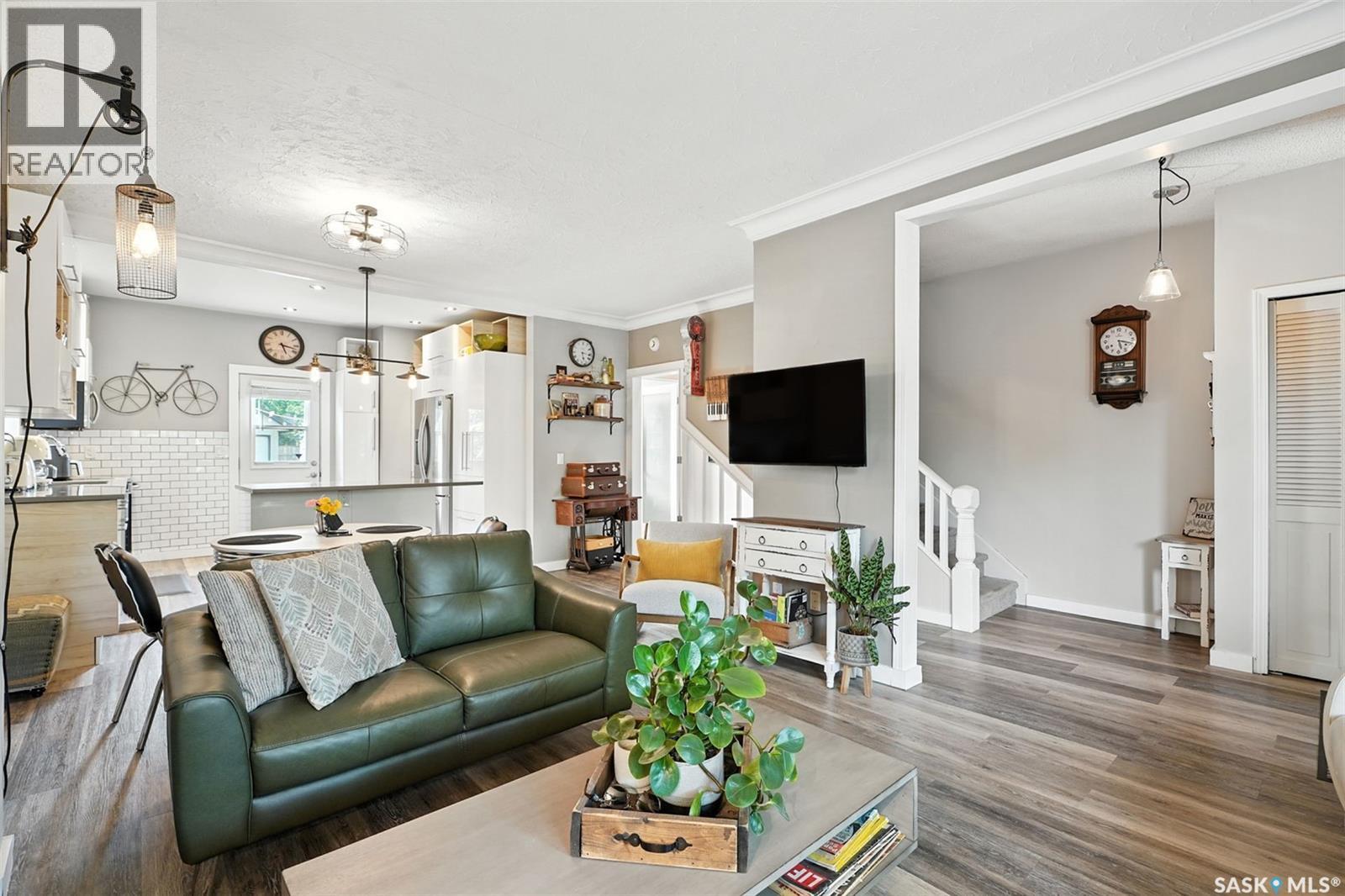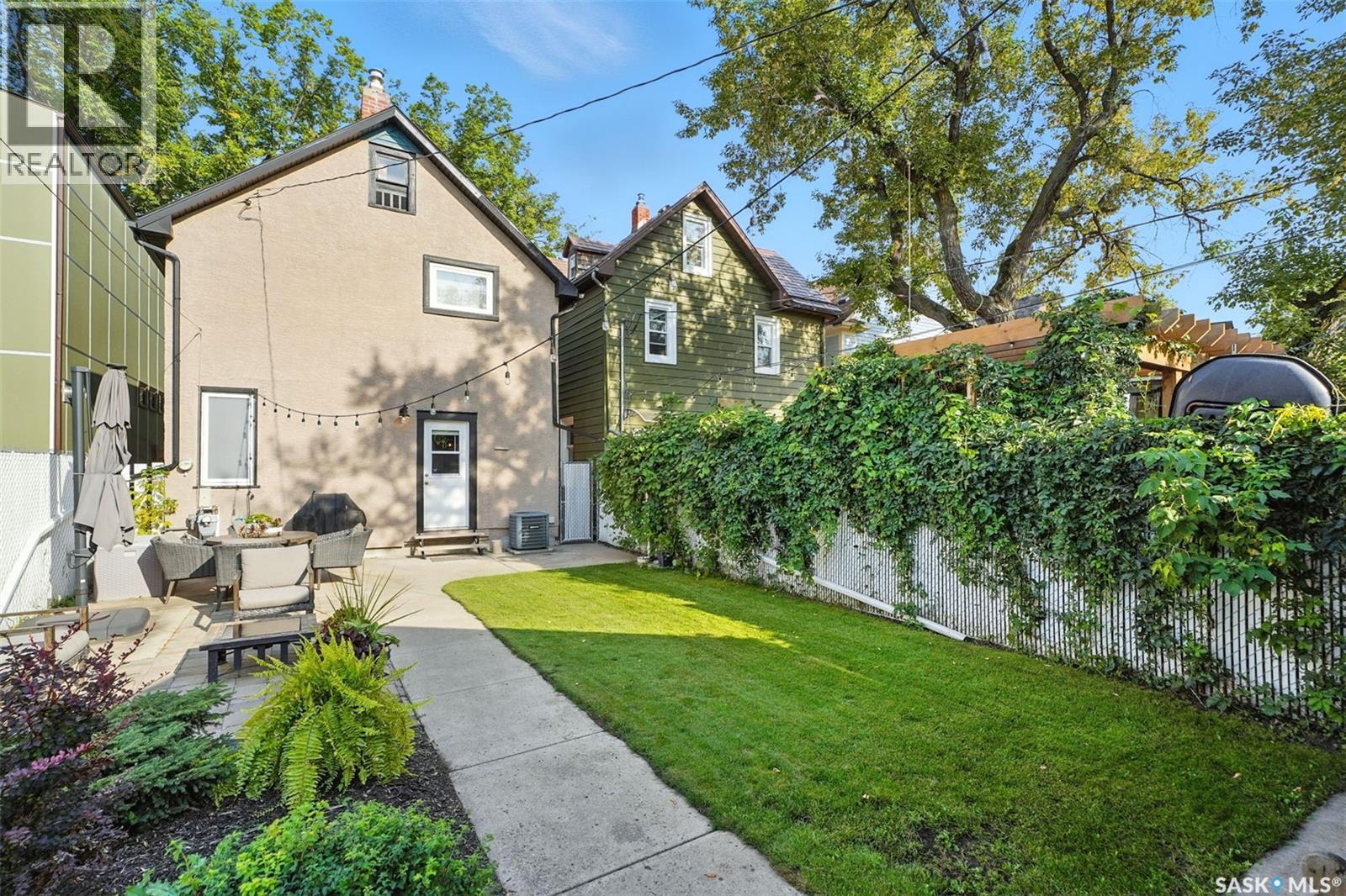 With Victoria Park as your front yard view, Saskatoon’s River Landing and the heart of downtown just a short stroll away, this thoughtfully renovated two-storey home blends timeless charm with modern comfort. Meticulous updates throughout speak to a level of ownership that has been both intentional and enduring. The main floor offers a welcoming front porch and continues into an inviting open-concept living and dining area with vinyl plank flooring throughout. The fully renovated kitchen is a standout, complete with high gloss cabinetry, subway tile backsplash, quartz countertops, and stainless steel appliances. A beautifully finished three-piece bathroom is located just off the kitchen, featuring a two-person soaker tub, updated vanity, modern lighting, and a water-efficient toilet. Upstairs, you’ll find three generously sized bedrooms and a well-appointed four-piece bathroom. The primary bedroom has been reimagined from two smaller rooms into one expansive retreat, offering exceptional space and versatility for storage or a private sitting area. The second bedroom offers access to the rooftop patio overlooking Victoria Park. The developed basement adds even more living space with a cozy family room featuring a wet bar, an open space for a studio, home gym, or flex space for your lifestyle needs. Enjoy a mechanical room with storage space and a dedicated laundry area. 100-amp electrical panel has been replaced in recent years and central air conditioning for cool comfort all summer long. Outdoors, the front yard is designed for low-maintenance living with a concrete driveway offering additional off street parking, while the backyard is fully fenced for privacy and features a patio, flower garden, and oversized detached garage for year round parking convenience. This property offers the rare combination of location, lifestyle, and move-in-ready updates—an ideal opportunity for those who value character, convenience, and quality. (id:44393)