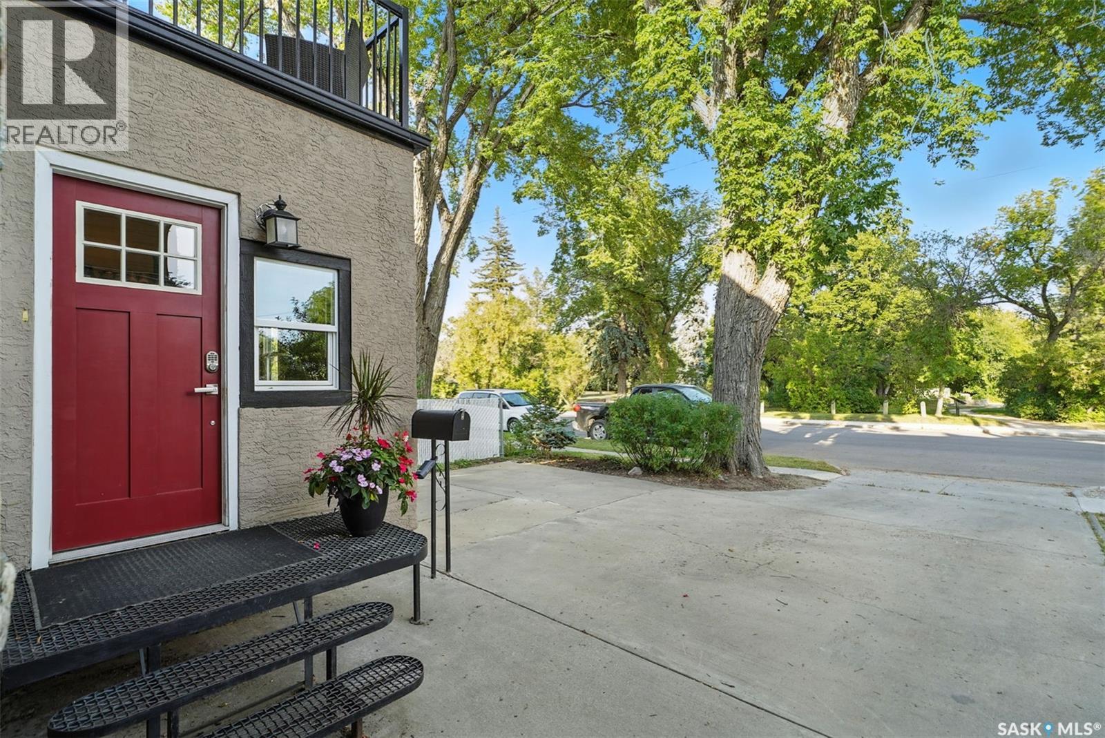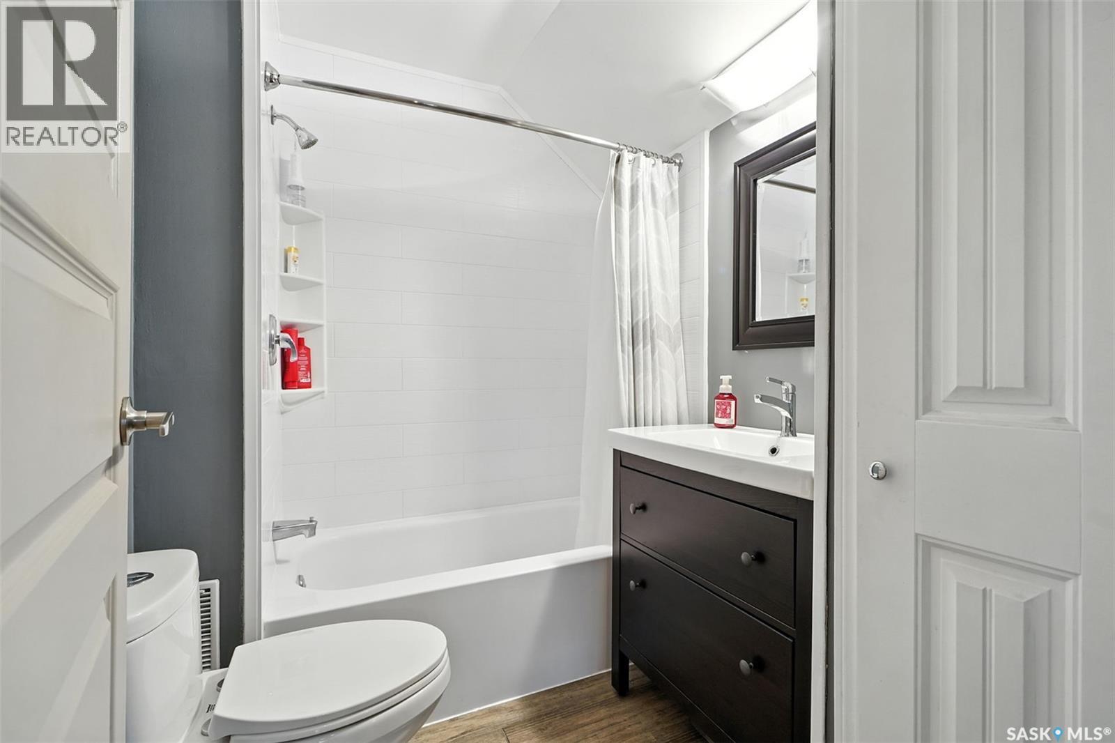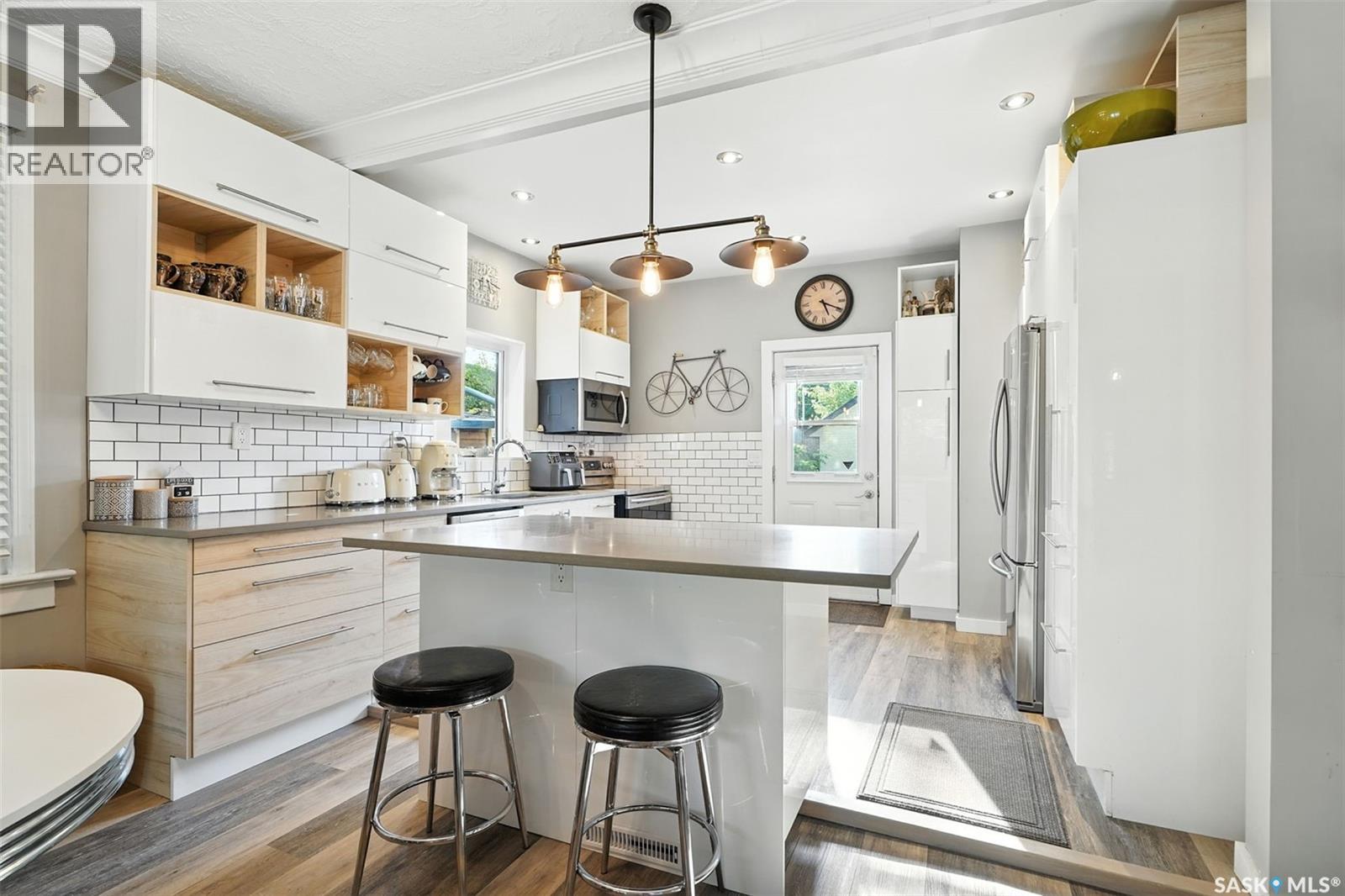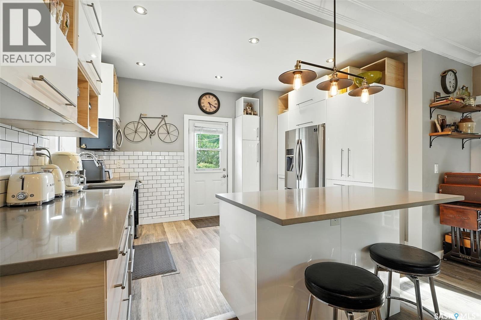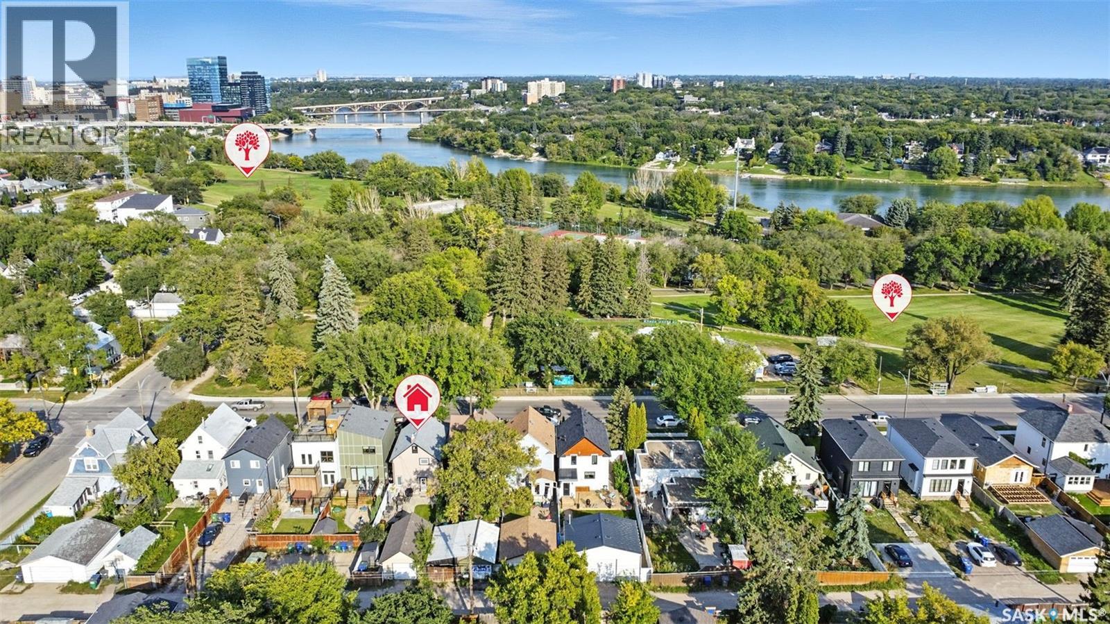 With Victoria Park as your front yard view, Saskatoon’s River Landing and the heart of downtown just a short stroll away, this thoughtfully renovated two-storey home blends timeless charm with modern comfort. Meticulous updates throughout speak to a level of ownership that has been both intentional and enduring. The main floor offers a welcoming front porch and continues into an inviting open-concept living and dining area with vinyl plank flooring throughout. The fully renovated kitchen is a standout, complete with high gloss cabinetry, subway tile backsplash, quartz countertops, and stainless steel appliances. A beautifully finished three-piece bathroom is located just off the kitchen, featuring a two-person soaker tub, updated vanity, modern lighting, and a water-efficient toilet. Upstairs, you’ll find three generously sized bedrooms and a well-appointed four-piece bathroom. The primary bedroom has been reimagined from two smaller rooms into one expansive retreat, offering exceptional space and versatility for storage or a private sitting area. The second bedroom offers access to the rooftop patio overlooking Victoria Park. The developed basement adds even more living space with a cozy family room featuring a wet bar, an open space for a studio, home gym, or flex space for your lifestyle needs. Enjoy a mechanical room with storage space and a dedicated laundry area. 100-amp electrical panel has been replaced in recent years and central air conditioning for cool comfort all summer long. Outdoors, the front yard is designed for low-maintenance living with a concrete driveway offering additional off street parking, while the backyard is fully fenced for privacy and features a patio, flower garden, and oversized detached garage for year round parking convenience. This property offers the rare combination of location, lifestyle, and move-in-ready updates—an ideal opportunity for those who value character, convenience, and quality. (id:44393)