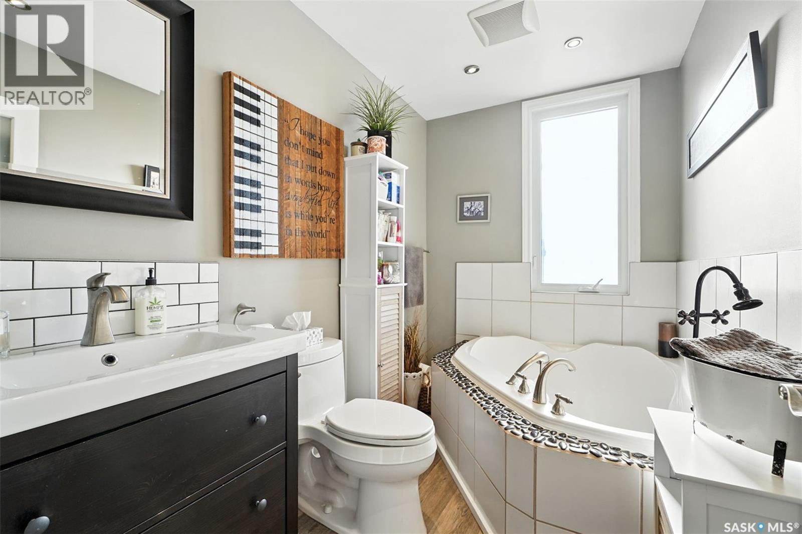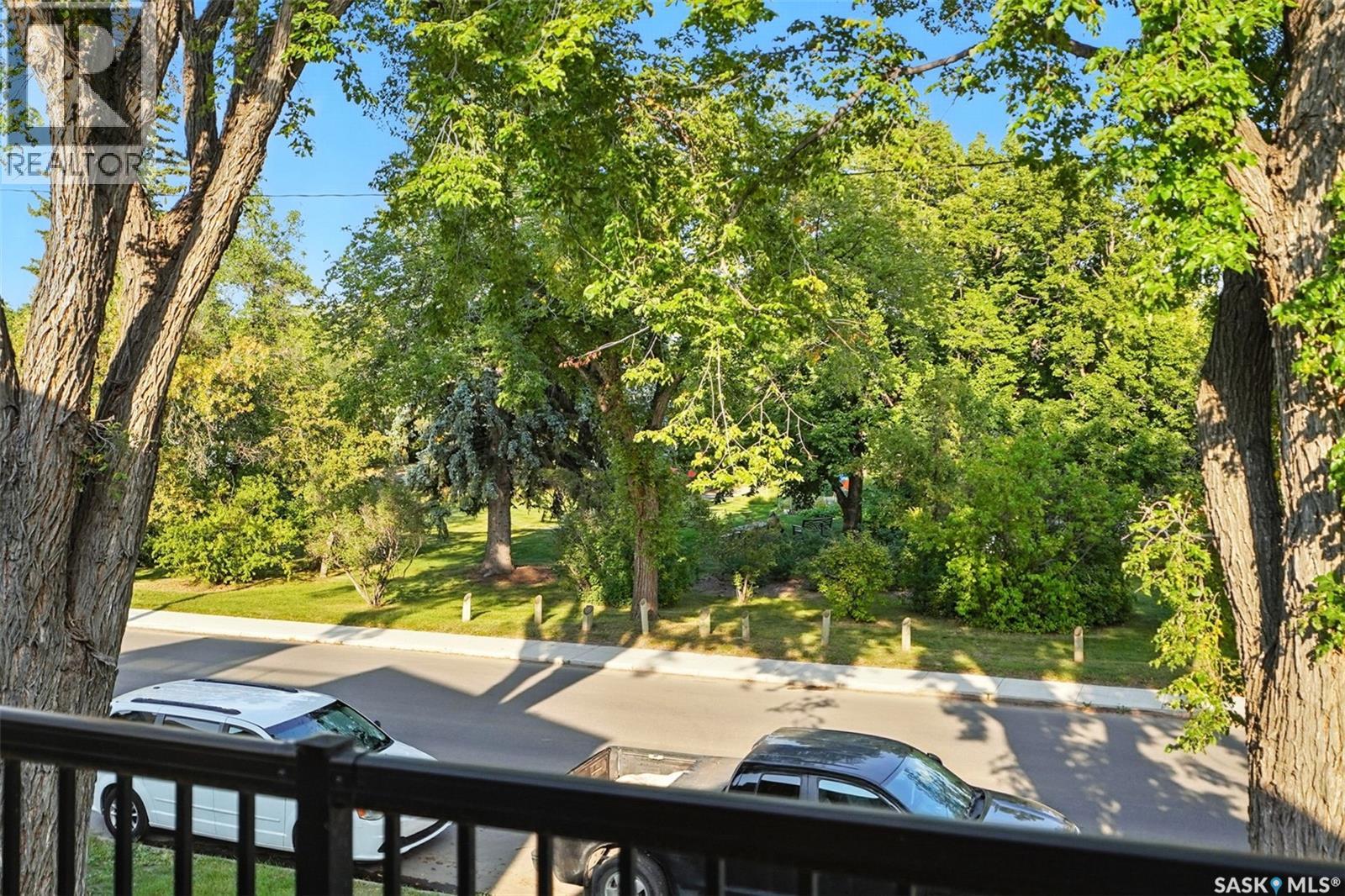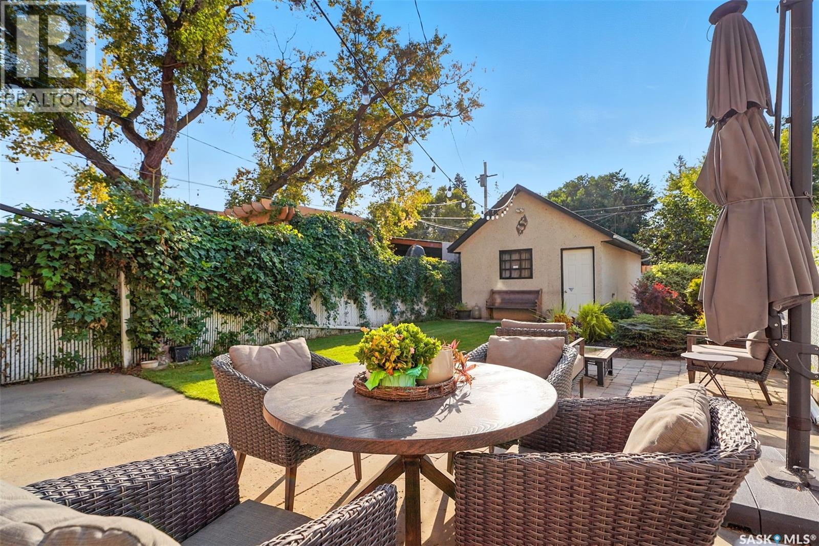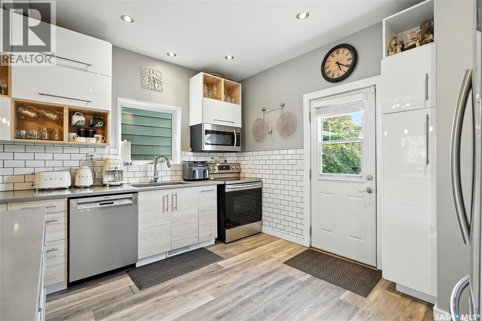 With Victoria Park as your front yard view, Saskatoon’s River Landing and the heart of downtown just a short stroll away, this thoughtfully renovated two-storey home blends timeless charm with modern comfort. Meticulous updates throughout speak to a level of ownership that has been both intentional and enduring. The main floor offers a welcoming front porch and continues into an inviting open-concept living and dining area with vinyl plank flooring throughout. The fully renovated kitchen is a standout, complete with high gloss cabinetry, subway tile backsplash, quartz countertops, and stainless steel appliances. A beautifully finished three-piece bathroom is located just off the kitchen, featuring a two-person soaker tub, updated vanity, modern lighting, and a water-efficient toilet. Upstairs, you’ll find three generously sized bedrooms and a well-appointed four-piece bathroom. The primary bedroom has been reimagined from two smaller rooms into one expansive retreat, offering exceptional space and versatility for storage or a private sitting area. The second bedroom offers access to the rooftop patio overlooking Victoria Park. The developed basement adds even more living space with a cozy family room featuring a wet bar, an open space for a studio, home gym, or flex space for your lifestyle needs. Enjoy a mechanical room with storage space and a dedicated laundry area. 100-amp electrical panel has been replaced in recent years and central air conditioning for cool comfort all summer long. Outdoors, the front yard is designed for low-maintenance living with a concrete driveway offering additional off street parking, while the backyard is fully fenced for privacy and features a patio, flower garden, and oversized detached garage for year round parking convenience. This property offers the rare combination of location, lifestyle, and move-in-ready updates—an ideal opportunity for those who value character, convenience, and quality. (id:44393)