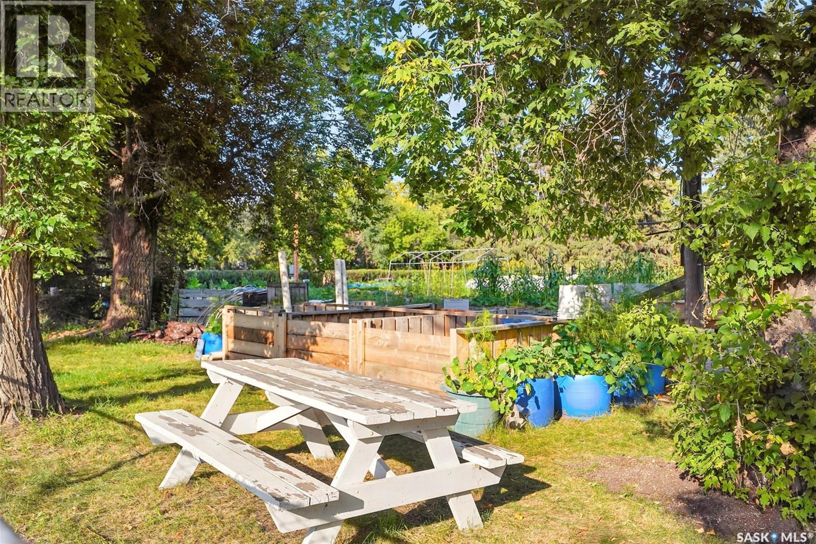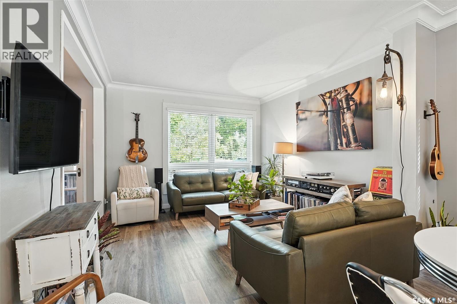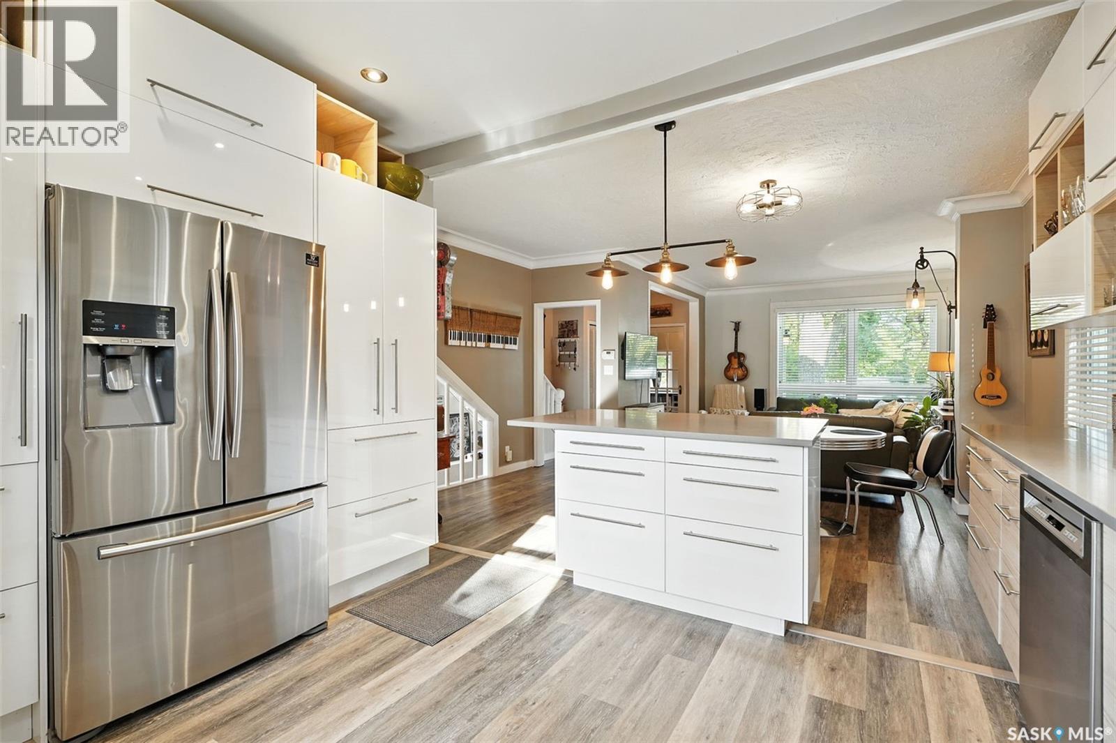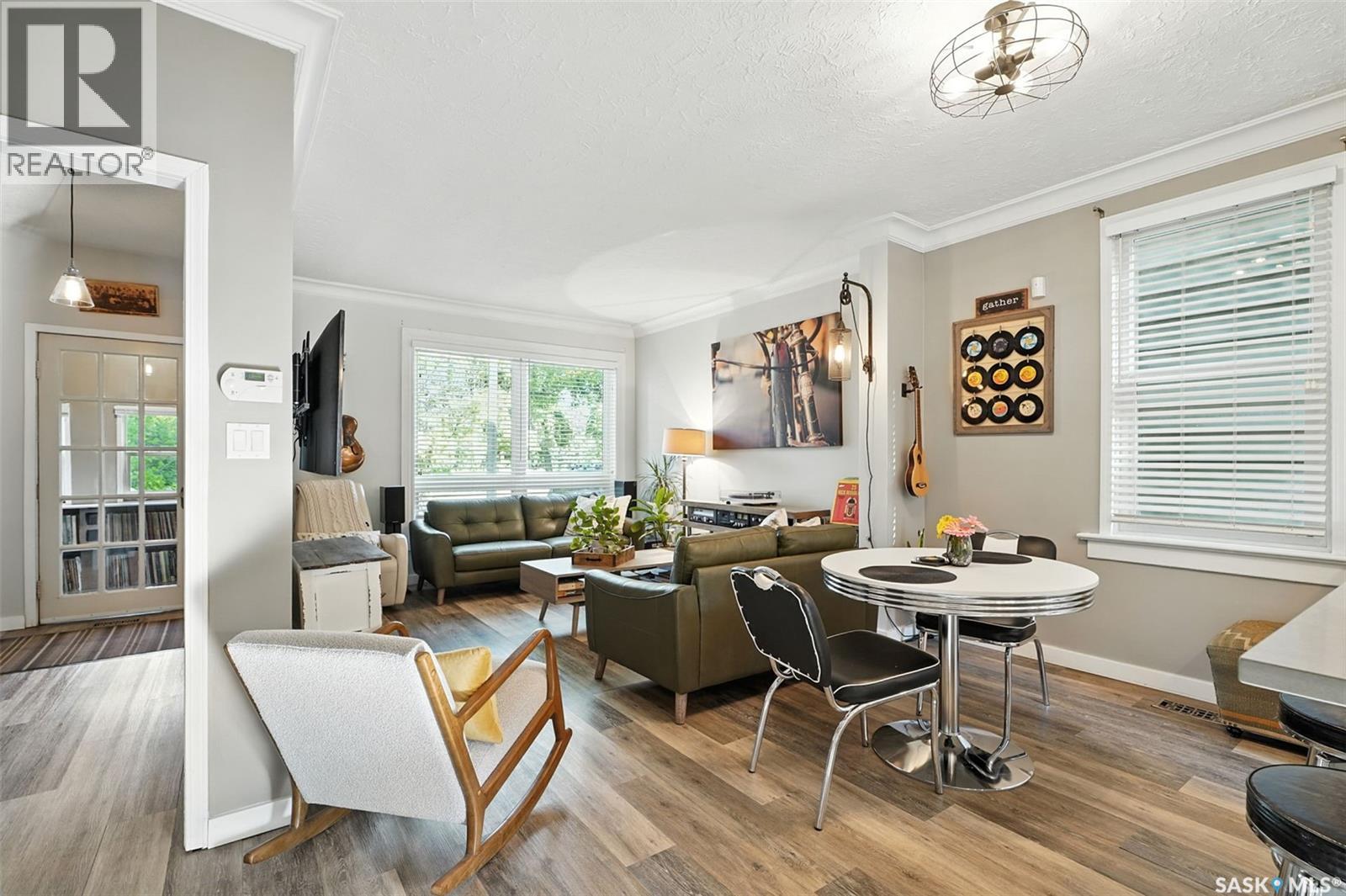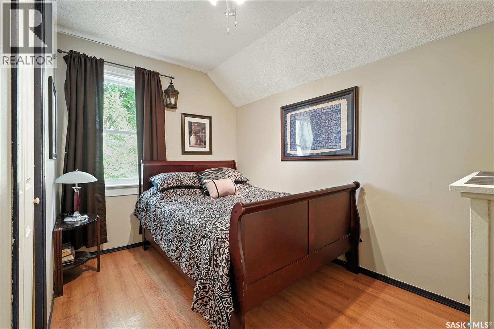 With Victoria Park as your front yard view, Saskatoon’s River Landing and the heart of downtown just a short stroll away, this thoughtfully renovated two-storey home blends timeless charm with modern comfort. Meticulous updates throughout speak to a level of ownership that has been both intentional and enduring. The main floor offers a welcoming front porch and continues into an inviting open-concept living and dining area with vinyl plank flooring throughout. The fully renovated kitchen is a standout, complete with high gloss cabinetry, subway tile backsplash, quartz countertops, and stainless steel appliances. A beautifully finished three-piece bathroom is located just off the kitchen, featuring a two-person soaker tub, updated vanity, modern lighting, and a water-efficient toilet. Upstairs, you’ll find three generously sized bedrooms and a well-appointed four-piece bathroom. The primary bedroom has been reimagined from two smaller rooms into one expansive retreat, offering exceptional space and versatility for storage or a private sitting area. The second bedroom offers access to the rooftop patio overlooking Victoria Park. The developed basement adds even more living space with a cozy family room featuring a wet bar, an open space for a studio, home gym, or flex space for your lifestyle needs. Enjoy a mechanical room with storage space and a dedicated laundry area. 100-amp electrical panel has been replaced in recent years and central air conditioning for cool comfort all summer long. Outdoors, the front yard is designed for low-maintenance living with a concrete driveway offering additional off street parking, while the backyard is fully fenced for privacy and features a patio, flower garden, and oversized detached garage for year round parking convenience. This property offers the rare combination of location, lifestyle, and move-in-ready updates—an ideal opportunity for those who value character, convenience, and quality. (id:44393)