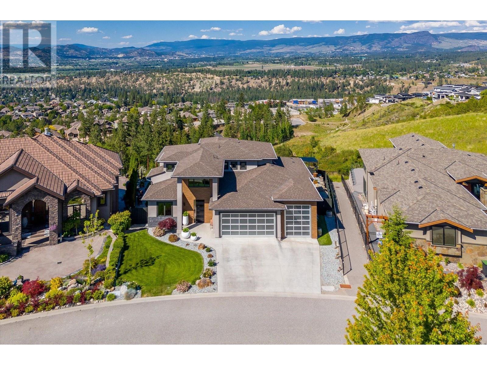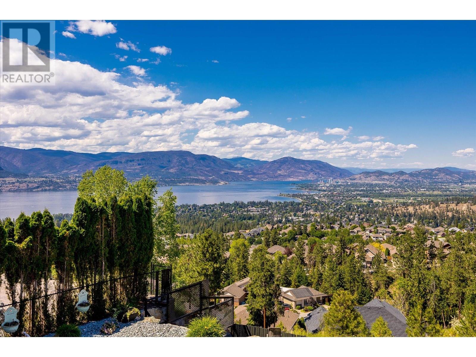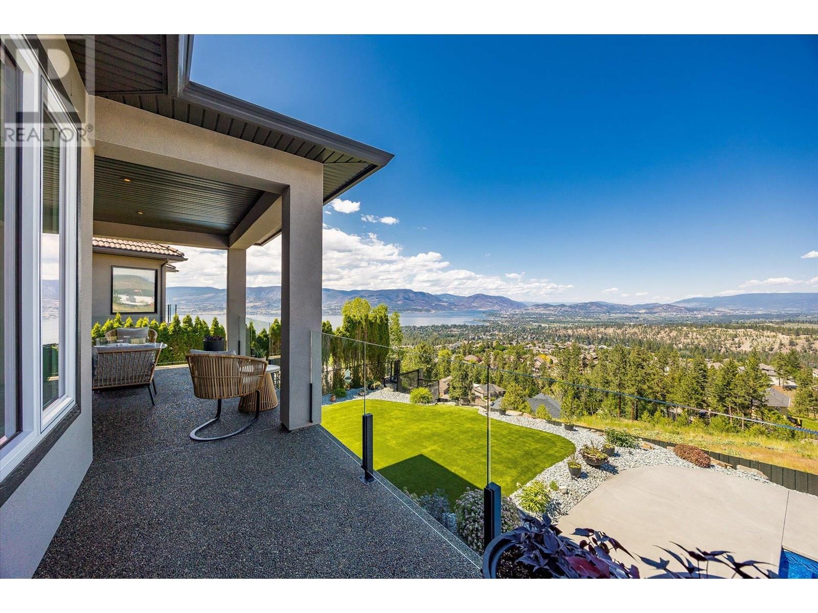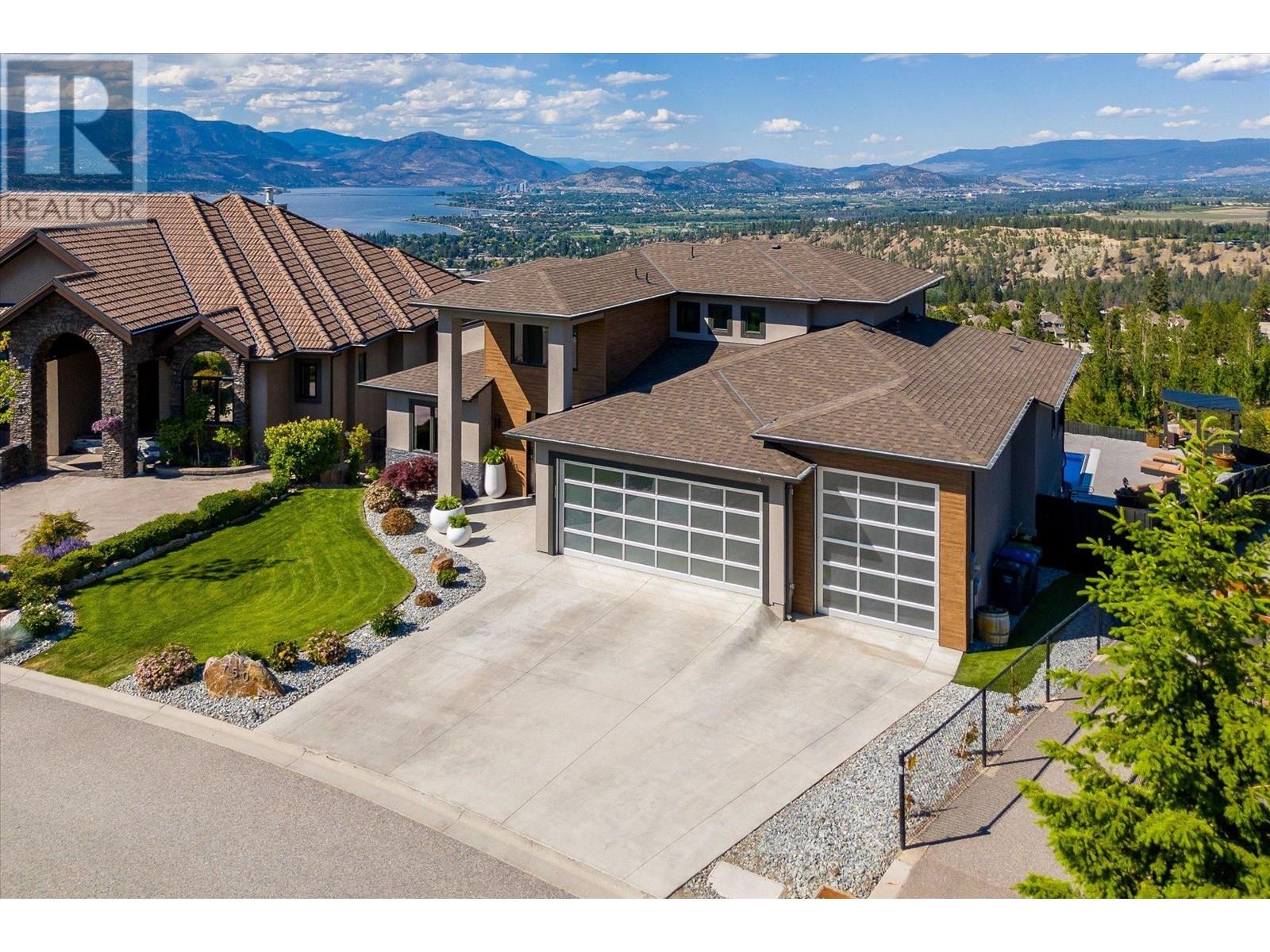 Welcome to this fully updated, exquisite 5 bedroom + den, 4 bathroom home, where no detail has been overlooked. As you step through the grand entrance, you are greeted by soaring vaulted ceilings and a chef's kitchen, complete with top-of-the line appliances and a butler's pantry. The heart of this home showcases breathtaking 180-degree vistas, seeing all of Kelowna, creating a mesmerizing backdrop for everyday living. The opulent primary suite is tucked away in a private corner of the main floor, offering a tranquil sanctuary with stunning lake views and a spa- like ensuite. Two additional generously sized bedrooms are located upstairs, providing ample space and privacy for family and guests. The lower walk-out level is an entertainer's paradise, featuring a sophisticated whiskey tasting room, an exquisite wine cellar, a stylish bar, a spacious rec room, and a state-of-the-art theatre room. This level seamlessly transitions to a private backyard and pool area, where the panoramic views are simply unmatched. Completing this magnificent property are four garage spots, including a double garage and a tandem garage, equipped with EV charging and ample space for a boat or RV. With plenty of parking, convenience and luxury are ensured at every turn. This home combines elegance, functionality, and breathtaking scenery, making it a true masterpiece. (id:44393)