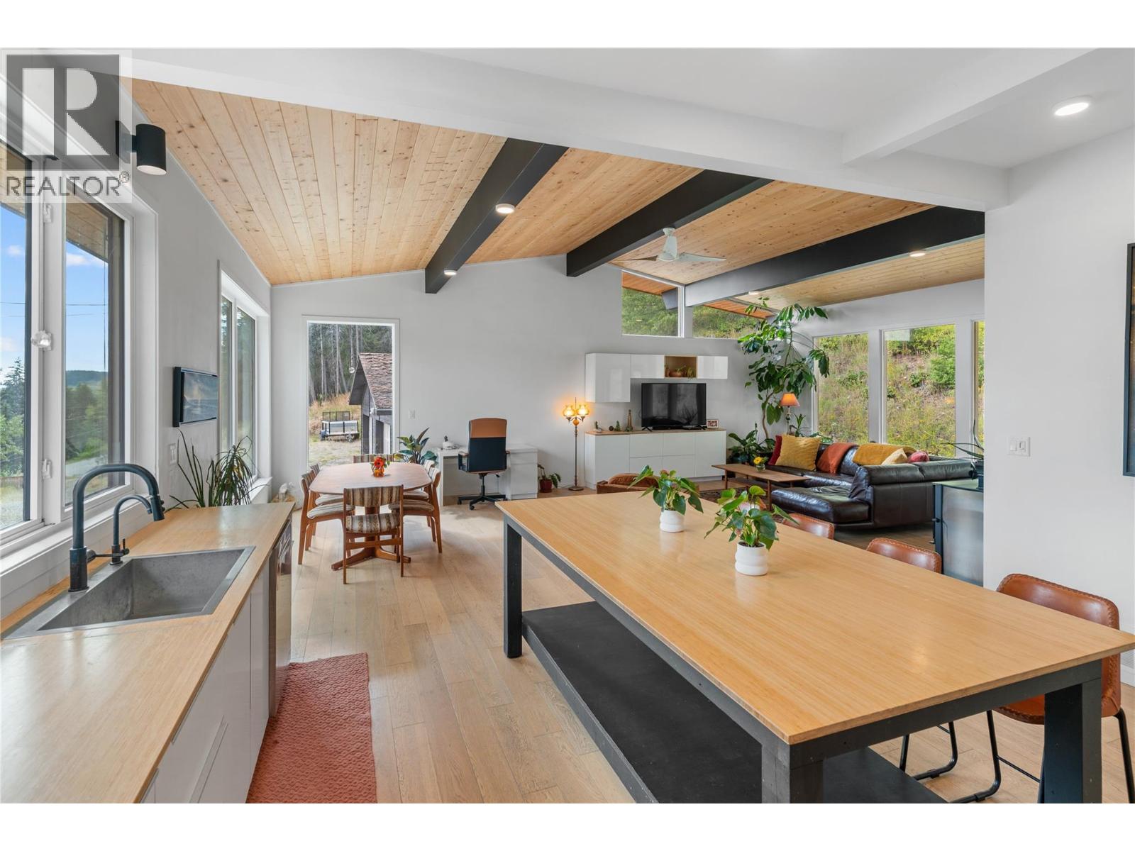 Elevated Mountainside Modernism | 10.86-Acre Private Estate. Discover the pinnacle of mid-century modern elegance nestled within a sprawling 10.86-acre sanctuary. This rare mountainside retreat offers an unparalleled blend of architectural character and absolute seclusion, boasting panoramic valley views and access to premier trail networks. Extensively renovated to harmonize warmth with contemporary design, the main level spans over 2,000 square feet of luminous, open-concept living. Architectural Grandeur: Soaring 14' cathedral ceilings and expansive windows frame the breathtaking natural landscape. Gourmet Artistry: A chef-inspired kitchen features premium stainless-steel appliances and an oversized social island, tailored for grand-scale entertaining. Climate Comfort: High-efficiency heating via a newer propane furnace, complemented by the soulful ambiance of a wood-burning stove. Versatile Utility The lower level provides 1,200 square feet of bonus storage space featuring a 6' ceiling height— currently the mechanical hub, or curated storage. Beyond the main residence, the estate caters to the enthusiast with a Detached Double Garage: 24’ x 24’ secure parking. Work Shop: 14’ ceilings and 60-amp service for specialized hobbies. Located on a primary school bus route just 15 minutes from Kelowna and 25 minutes to the slopes of Big White, this is a masterclass in private, high-design acreage. (id:44393)