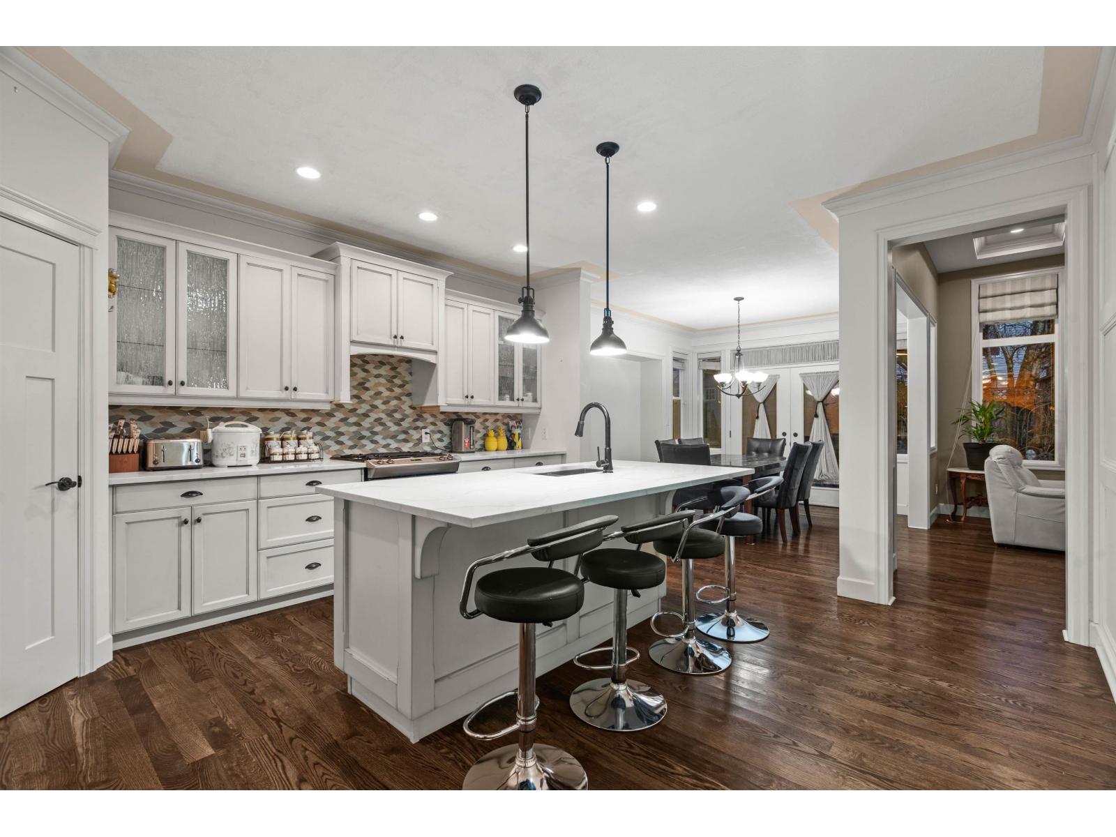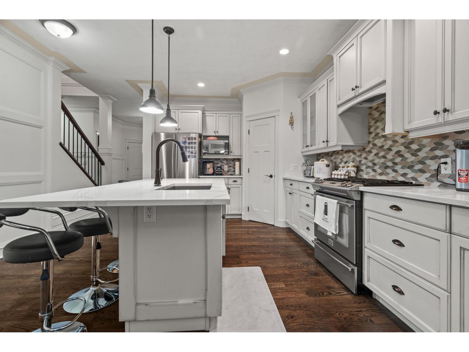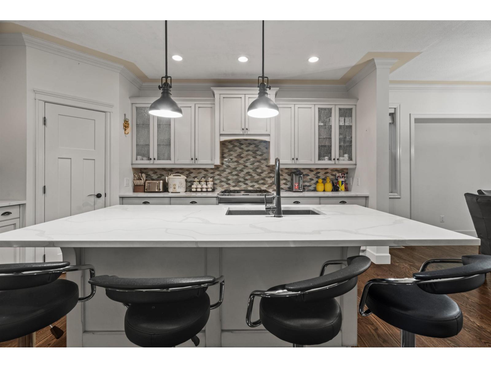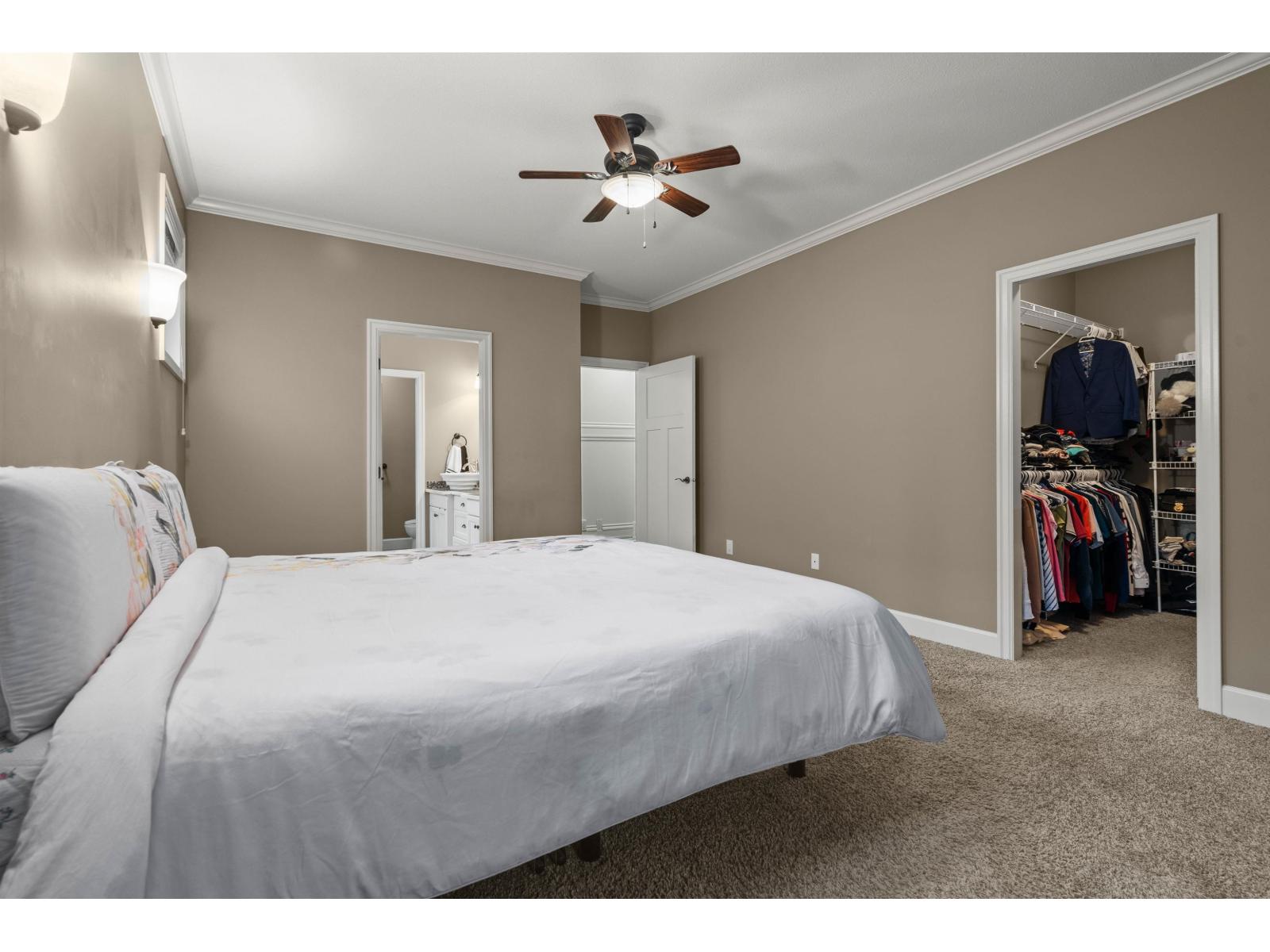 This unique and inviting floor plan is tucked away on a quiet cul-de-sac in desirable Eastern Chilliwack! Offering 4 bedrooms + loft and 3 bathrooms with convenient main floor living, this home is perfect for everyone! The main level features a spacious primary bedroom with ensuite bathroom including dual sinks and shower, plus a second bedroom and full bathroom ideal for guests or extended family. The bright kitchen showcases a large island, custom white cabinetry, backsplash, hardwood flooring, and detailed crown moulding, flowing seamlessly into the dining area and great room with coffered ceilings and a cozy gas fireplace. Upstairs, enjoy a versatile loft/flex space with electric fireplace. The basement offers two bedrooms, partially finished living space, and plenty of unfinished square footage ready for your ideas (recreation room and/or suite potential). Step outside to a private, fully fenced, low-maintenance backyard with stamped concrete, hot tub, shed, and a peaceful park setting. Excellent location (id:44393)
