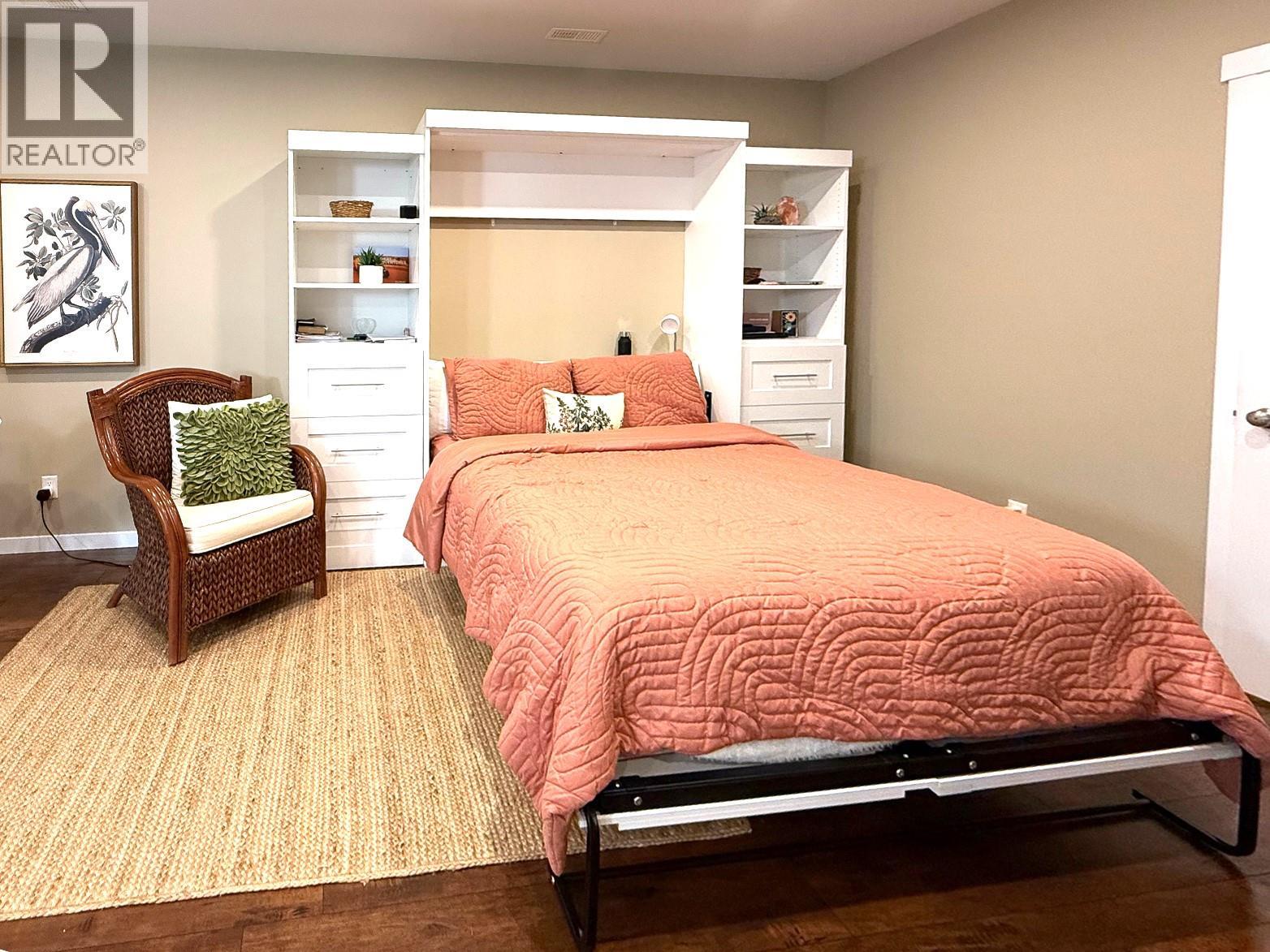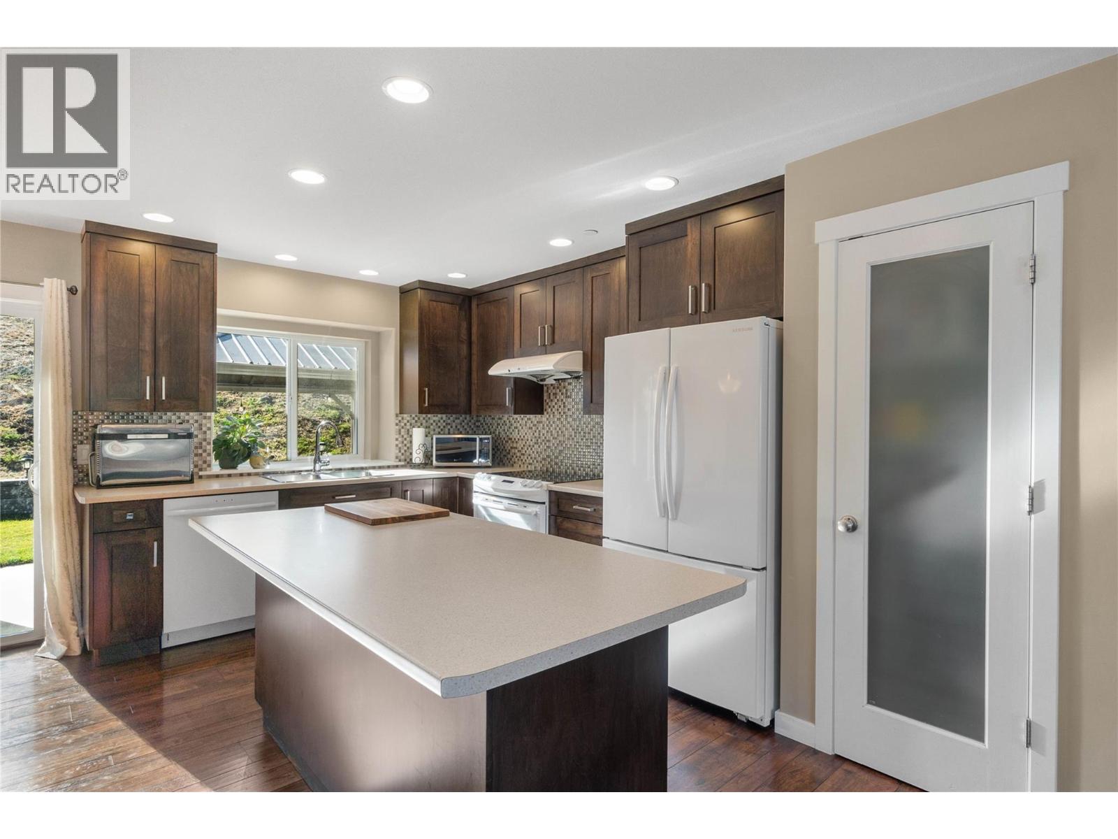 Beautiful family home with great street appeal, xeriscaped front yard & generous 3 car wide driveway for your RV or boat with easy care manual UG sprinklers for the front plantings. Welcoming foyer with front bedroom/office and access to the oversized, heated double garage with tandem bay for a 3rd vehicle or workshop. Upper level features engineered hardwood floors, open concept living with island kitchen with appliances included & lots of cabinets for storage. Spacious living room has gas fireplace & stunning river and mountain vineyard views. Dining area with built-in buffet opens to a private fenced yard with negotiable gazebo — perfect for kids & pets. Three bedrooms up including a spacious primary with 4pc ensuite, double sinks & large shower. Entry level offers a bright bachelor in-law suite with Murphy bed, private entrance & full kitchen with all appliances and full bath — ideal mortgage helper or guest space. New hot water tank, in-house sprinkler system, well maintained & serviced furnace & A/C. Backs onto greenspace with trails & close to neighborhood park — the perfect home for a growing family! (id:44393)