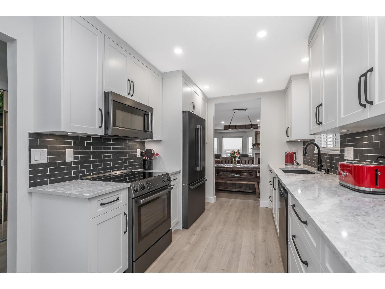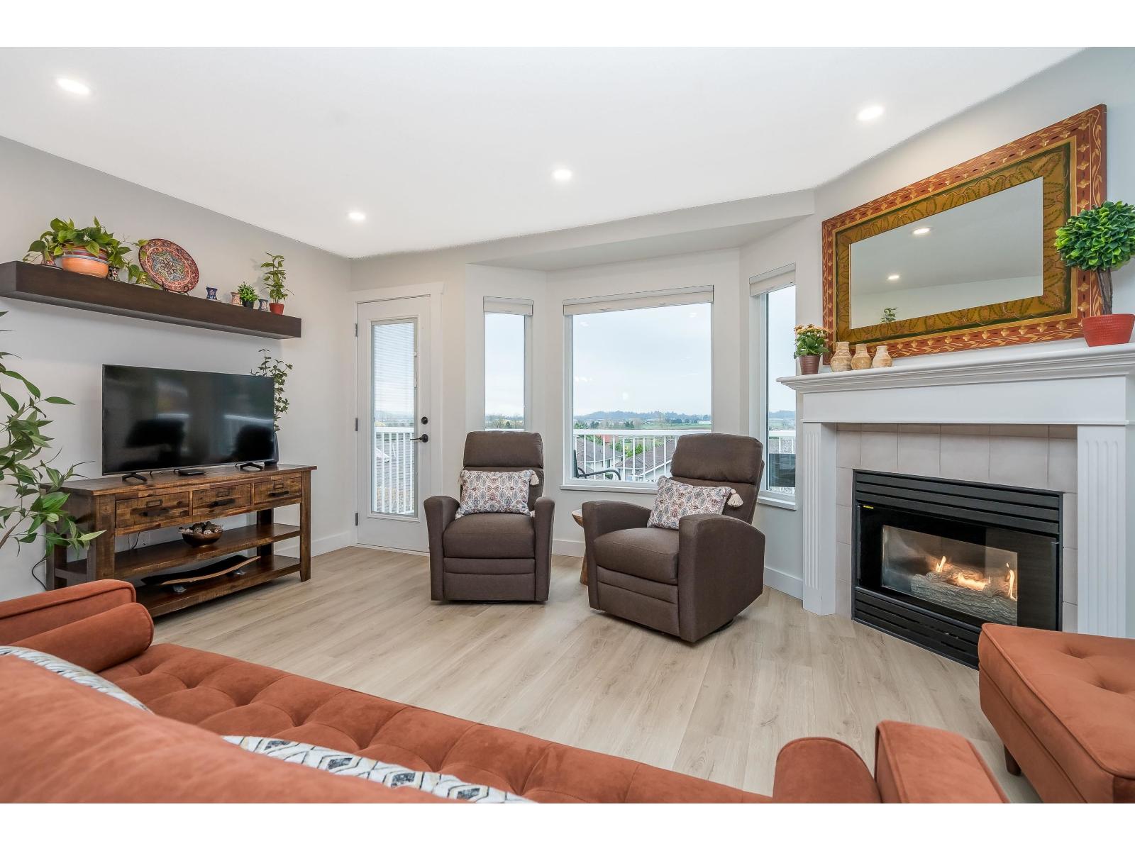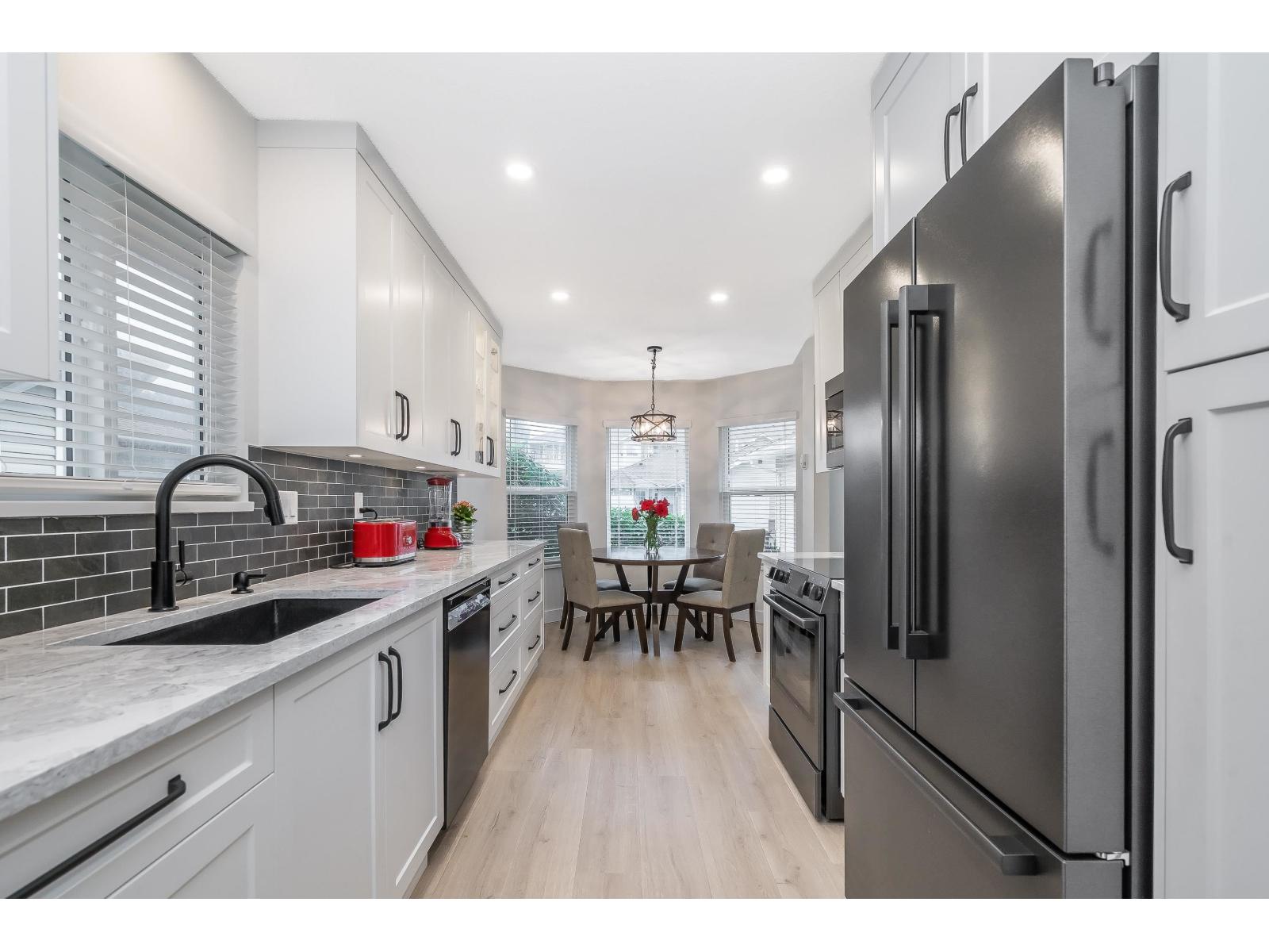 $572.29 MonthlyStunning COMPLETELY renovated rancher w/ full walk-out bsmt in East Abbotsford's amazing 'gated' Belmont Ridge. End unit! Updates & features - triple glazed windows, pex piping, A/C (heat pump), high efficiency hot water system (combi system), radiant h/w heat. Gorgeous custom kitchen w/ pull-outs, quartz countertops, black stainless Bosch appliances, commercial grade sink, deluxe ensuite, new baths, vinyl plank thru-out, recessed lighting, bsbrds & trim, railings, light fixtures, closet organizers, murphy bed/desk combo, window coverings, door hardware. Private fenced yard. Gorgeous views over farmland & amazing sunsets. Steps to shopping, restaurants, parks, trails & easy freeway access. (id:44393)