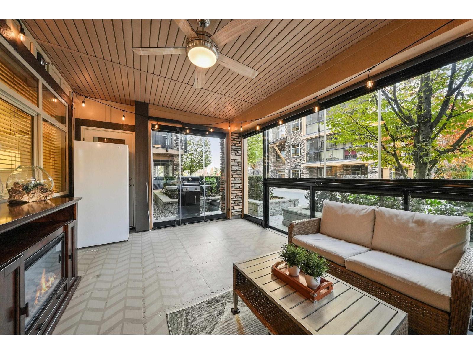 $427.67 MonthlyStunning 1,602 sq.ft. ground floor condo with large enclosed solarium! The sought-after Executive M2 Plan offers the best layout for comfort and functionality. Open concept design ideal for downsizers or families! Gourmet kitchen with granite counters, solid wood cabinetry, pantry, gas range and S/S appliances. Features 9 ft ceilings and A/C throughout. Two primary-style bedrooms on opposite ends for privacy. Bathrooms feature heated floors, fog-free mirrors and double sinks. Includes 3rd bedroom plus spacious den (or 4th bedroom). Enclosed solarium with retractable glass panels and gas BBQ hookup for year-round use. Direct outdoor access-perfect for pet owners & steps to the dog park! Two parking stalls (1 oversized) & large roll-up storage locker. Unbeatable Willoughby Heights location! (id:44393)