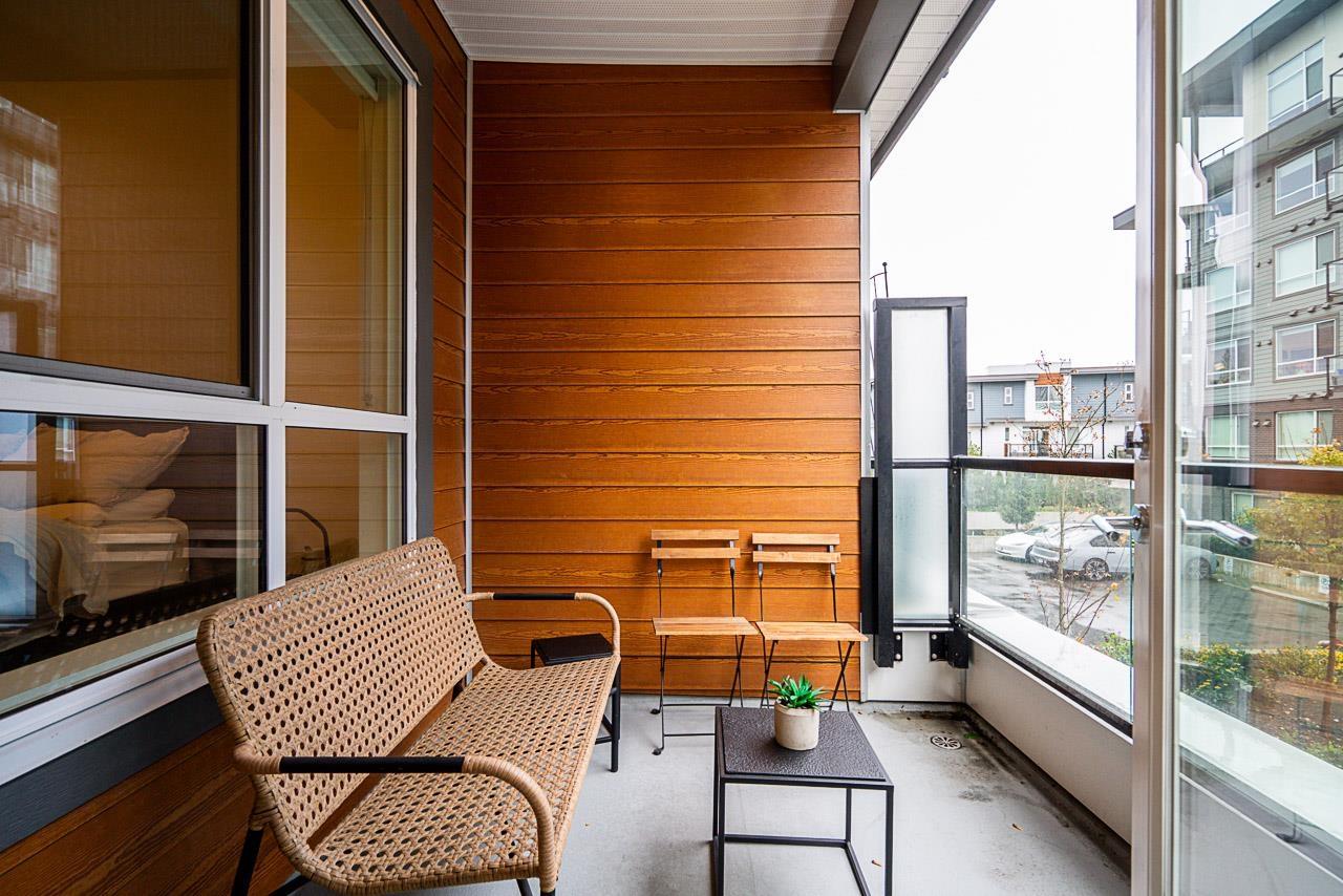 $349.62 MonthlyPrime Alexander Square location, steps from Willoughby Town Centre, restaurants, schools, transit, and highways. This like-new 1 bed plus den, 1 bath RDG home offers bright south-facing exposure overlooking the courtyard. The kitchen features quartz counters, Whirlpool stainless steel appliances, washer/dryer, microwave, and a Mysa smart thermostat. The bedroom and walk-in closet are carpeted for comfort. Parking access via 80th St. and through the adjacent townhouse with fob entry to the two-level parkade. Amenities include a gym, lounge, rooftop deck with BBQs, courtyard with fire pits, and community garden plots. Well-run strata includes hot water and caretaker, offering move-in-ready comfort and convenience. (id:44393)
