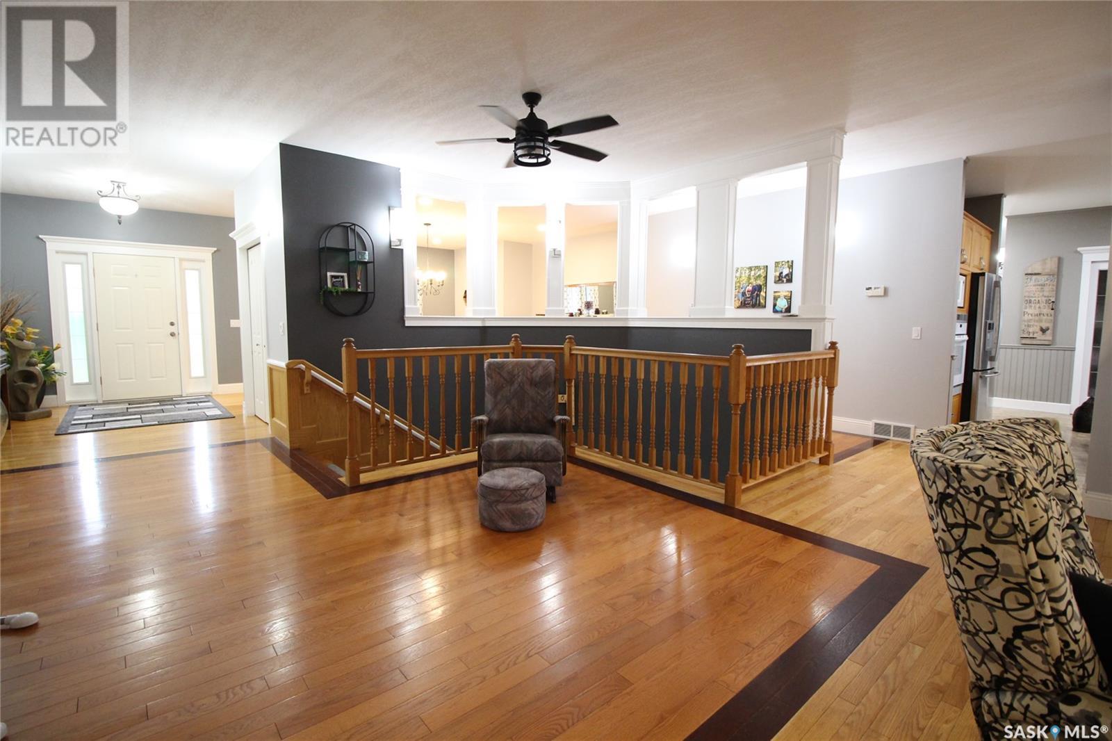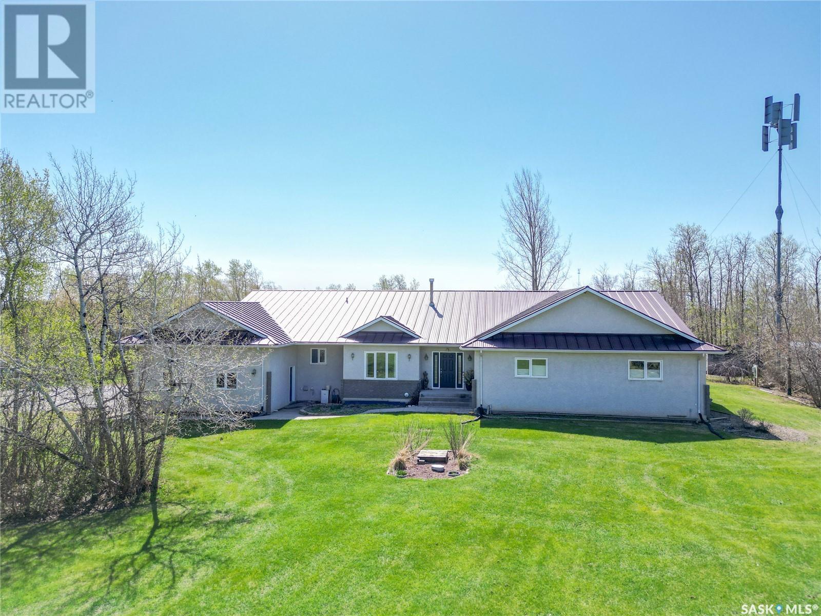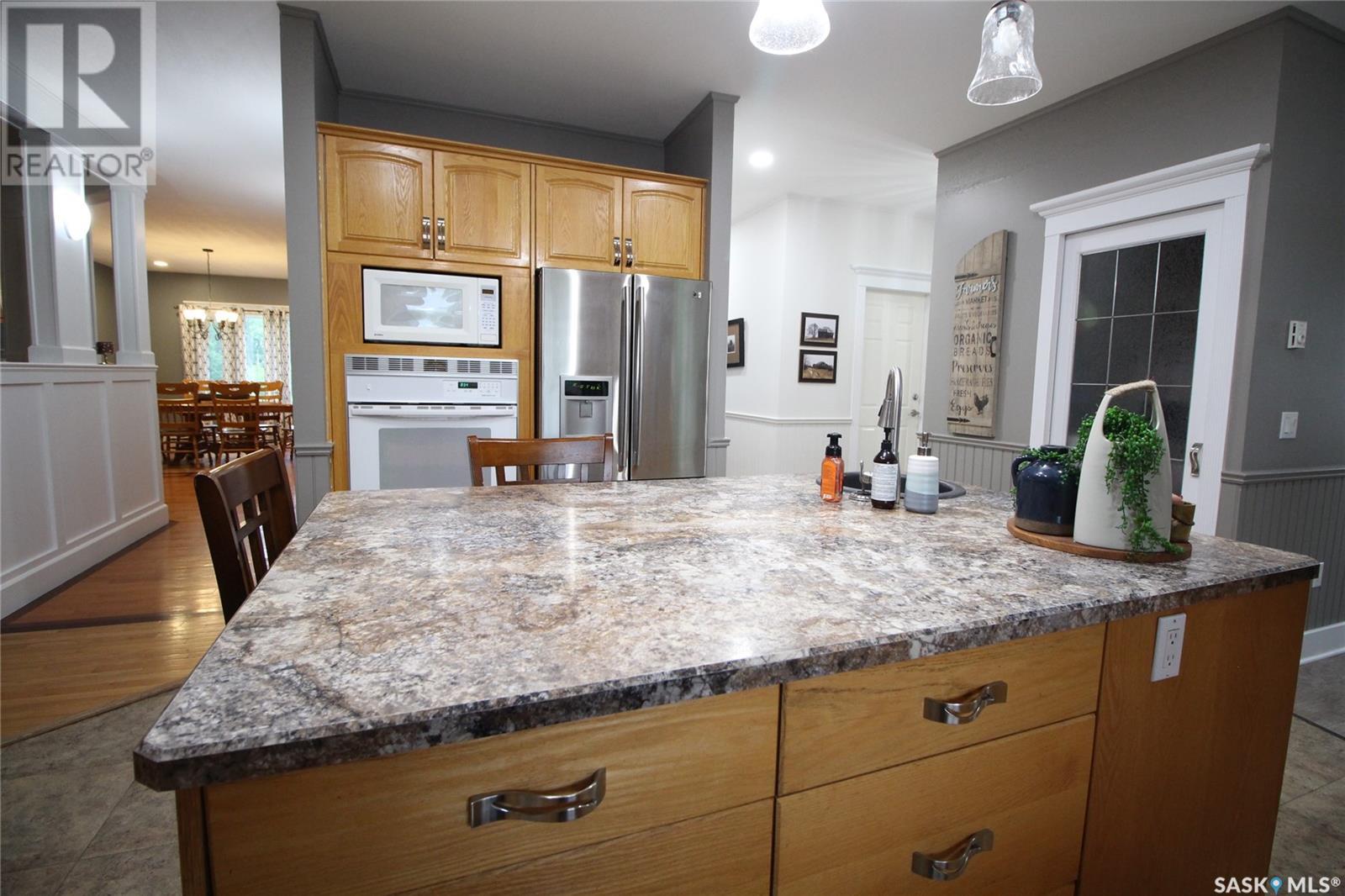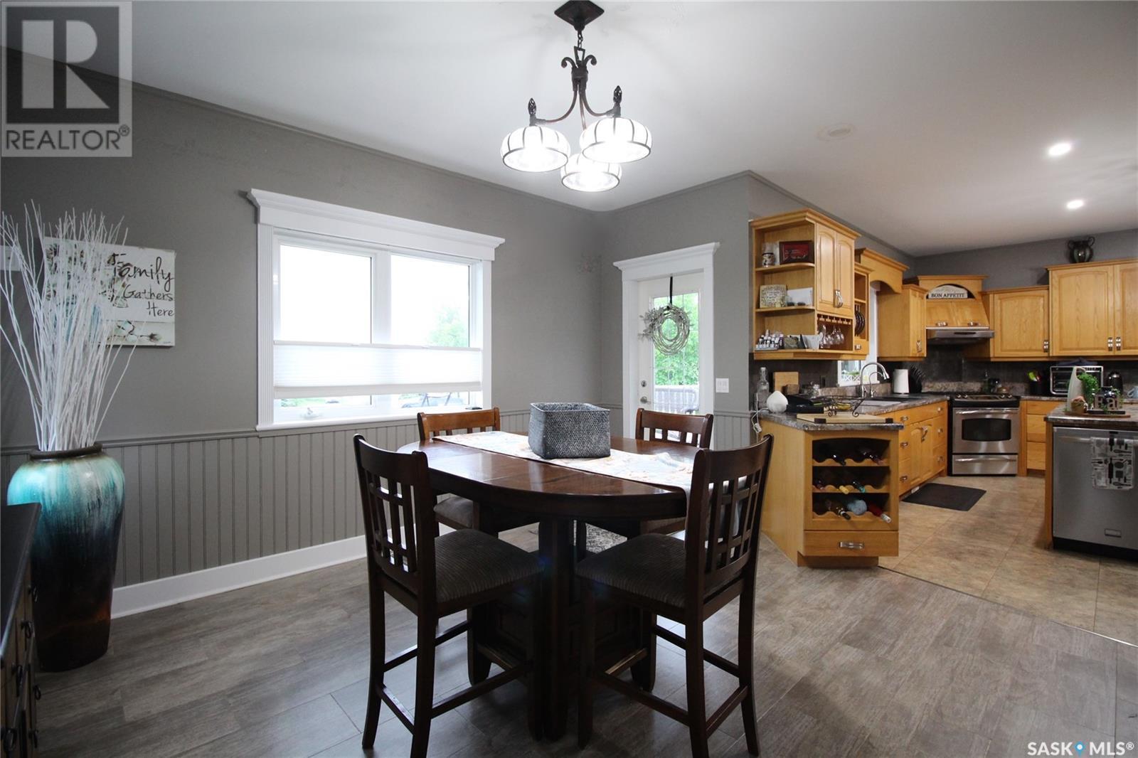 This remarkable property has it all including a location that's perfect; less than 1 km outside of Moosomin! As you pull up to this private oasis you’re greeted by a 3978 sqft home w/double attached garage and a detached garage/shop all of which is surrounded by mature trees and shrubs and located on 3.95 acres. You'll find a large entrance, w/lots of closet space, that leads into the beautiful and bright kitchen! The kitchen features immaculate oak cabinetry, lots of cupboard/counter space, a large pantry, island w/prep sink, and 2 built in ovens. In this well-kept home, you get 2 beautiful dining rooms; one situated off of the kitchen w/access onto the deck and one close to the front entrance w/a more formal vibe. Off of the entrance you’ll also find a 2pc bathroom and an incredible laundry/mud room that every parent dreams of! The spacious living room is a comfortable setting w/the gas fireplace as the focal point and access into the hot tub room. With french doors leading to the deck, this private area is so peaceful and great for entertaining! Vaulted ceilings with the abundance of windows makes this space feel huge! Down the hall you’ll find the huge master bedroom featuring his/her closets and a 5pc ensuite w/new tile flooring and a large corner jet tub, 2 additional bedrooms, 3pc bathroom, and a large office. The basement boasts a huge rec room/family room w/ pool table, 2 additional bedrooms, a 3pc bathroom, and utility room which offers lots of storage space! BONUSES INCLUDE: 2 natural gas furnaces, on demand water heater, RO system, air exchanger, central vac, sump pump, water softener, intercom, 220 hook up, and RF now. You’ll also find heated floor in the basement, hot tub room, and garage! The detached garage/shop is heated with an electric furnace and has a toy area and workshop. And let’s not forget about the yard… this yard is absolutely perfect! Full of mature tress including apple, plum, and cherry trees! Call today to view this property! (id:44393)