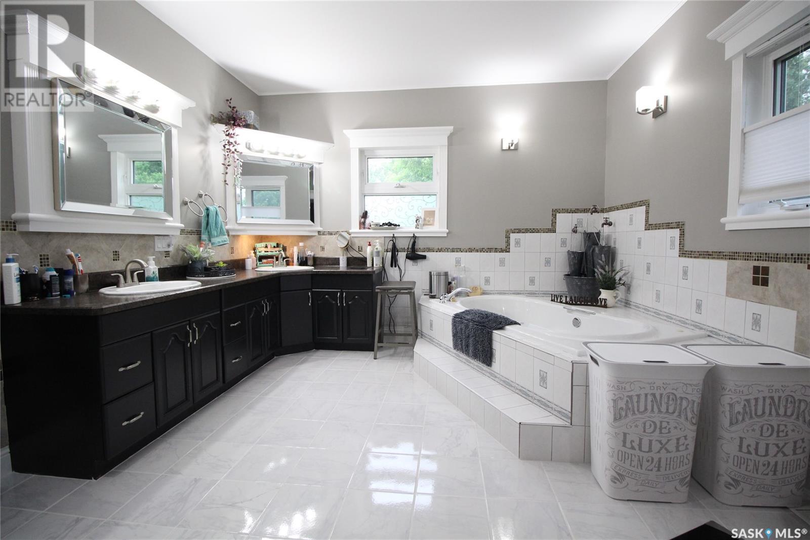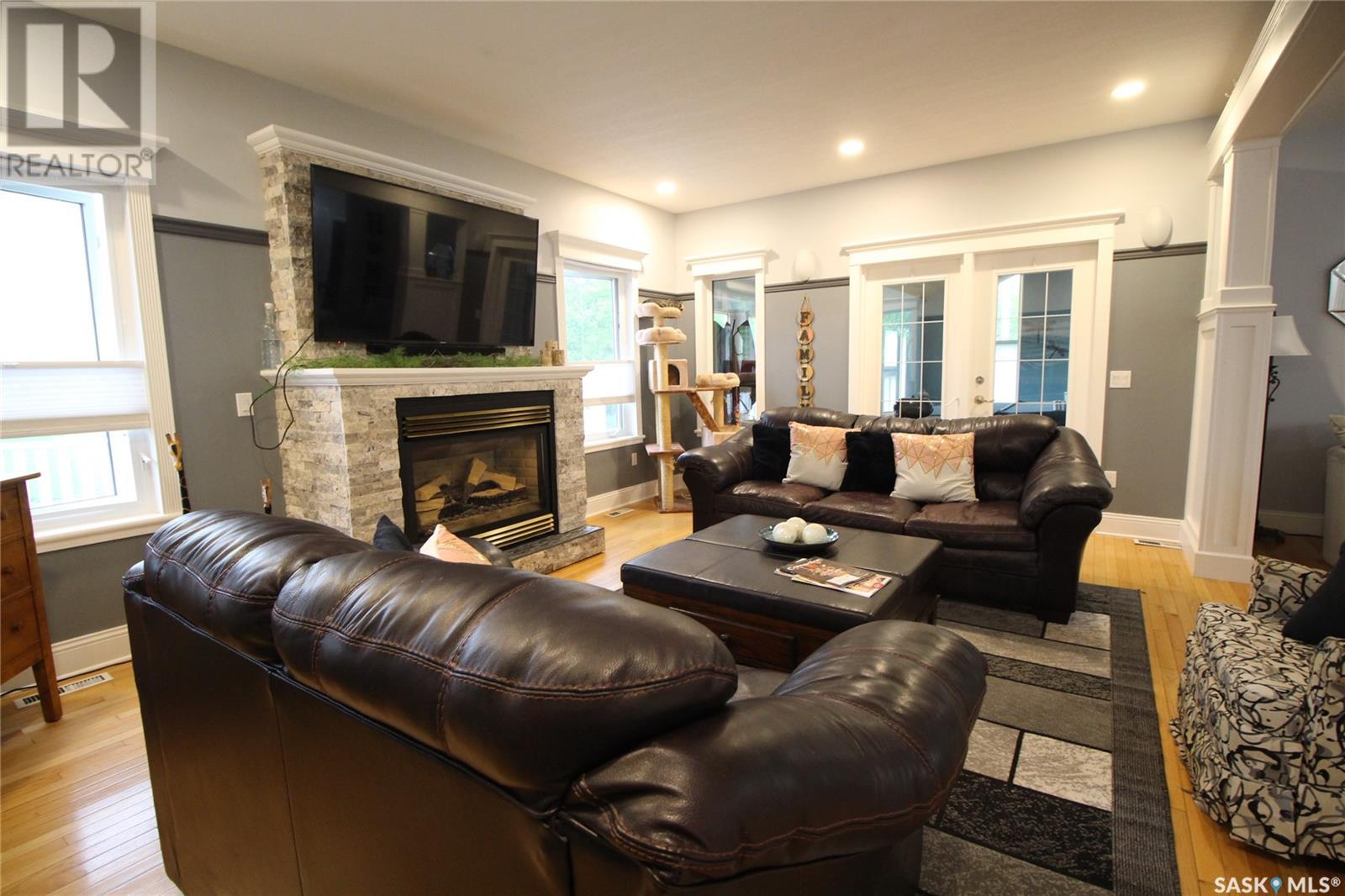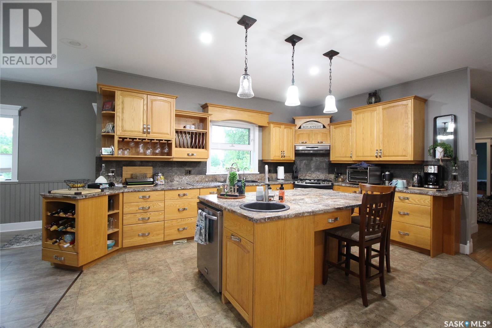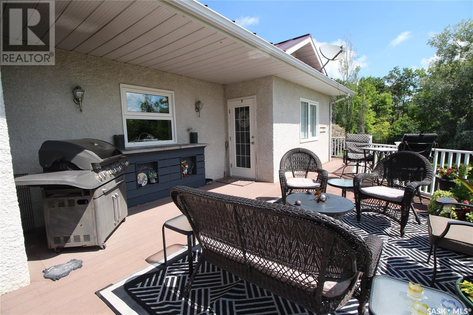 This remarkable property has it all including a location that's perfect; less than 1 km outside of Moosomin! As you pull up to this private oasis you’re greeted by a 3978 sqft home w/double attached garage and a detached garage/shop all of which is surrounded by mature trees and shrubs and located on 3.95 acres. You'll find a large entrance, w/lots of closet space, that leads into the beautiful and bright kitchen! The kitchen features immaculate oak cabinetry, lots of cupboard/counter space, a large pantry, island w/prep sink, and 2 built in ovens. In this well-kept home, you get 2 beautiful dining rooms; one situated off of the kitchen w/access onto the deck and one close to the front entrance w/a more formal vibe. Off of the entrance you’ll also find a 2pc bathroom and an incredible laundry/mud room that every parent dreams of! The spacious living room is a comfortable setting w/the gas fireplace as the focal point and access into the hot tub room. With french doors leading to the deck, this private area is so peaceful and great for entertaining! Vaulted ceilings with the abundance of windows makes this space feel huge! Down the hall you’ll find the huge master bedroom featuring his/her closets and a 5pc ensuite w/new tile flooring and a large corner jet tub, 2 additional bedrooms, 3pc bathroom, and a large office. The basement boasts a huge rec room/family room w/ pool table, 2 additional bedrooms, a 3pc bathroom, and utility room which offers lots of storage space! BONUSES INCLUDE: 2 natural gas furnaces, on demand water heater, RO system, air exchanger, central vac, sump pump, water softener, intercom, 220 hook up, and RF now. You’ll also find heated floor in the basement, hot tub room, and garage! The detached garage/shop is heated with an electric furnace and has a toy area and workshop. And let’s not forget about the yard… this yard is absolutely perfect! Full of mature tress including apple, plum, and cherry trees! Call today to view this property! (id:44393)