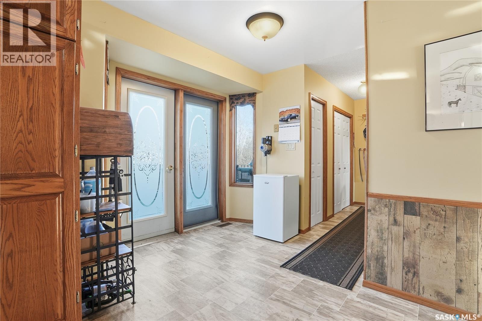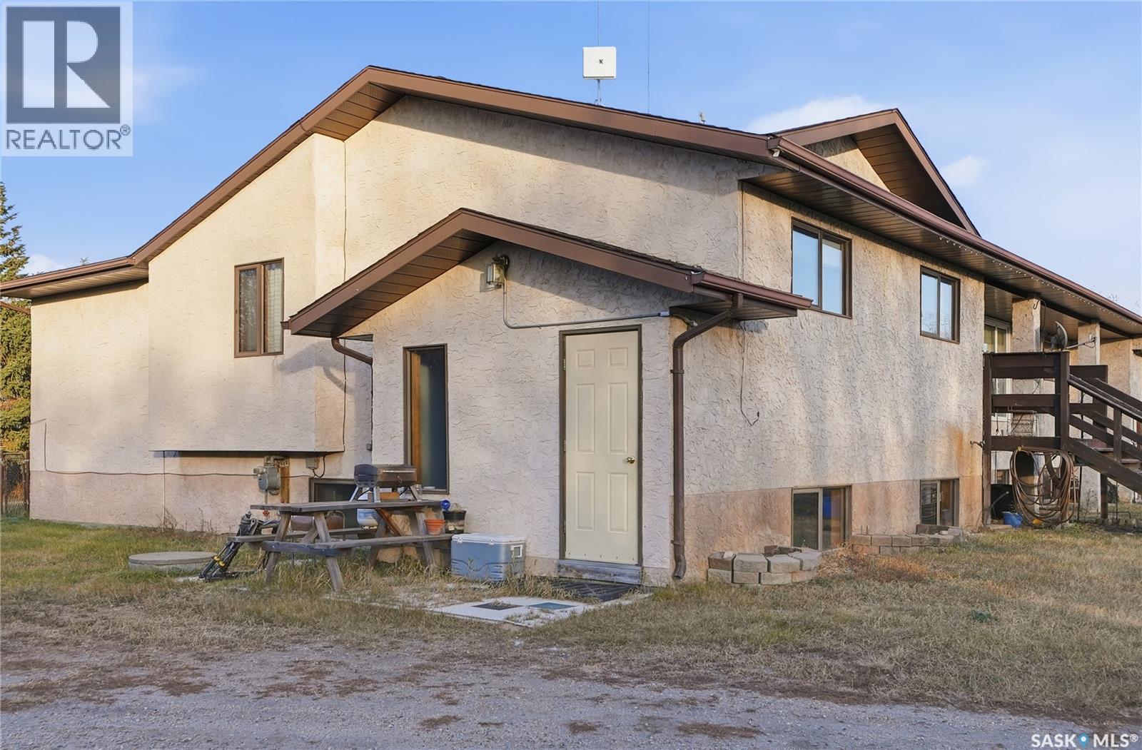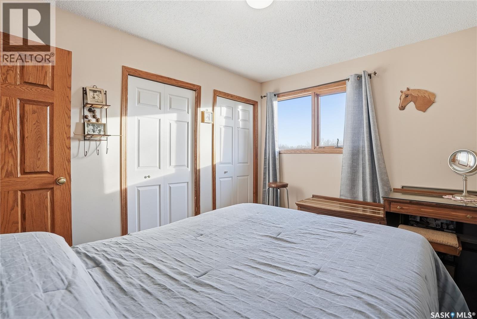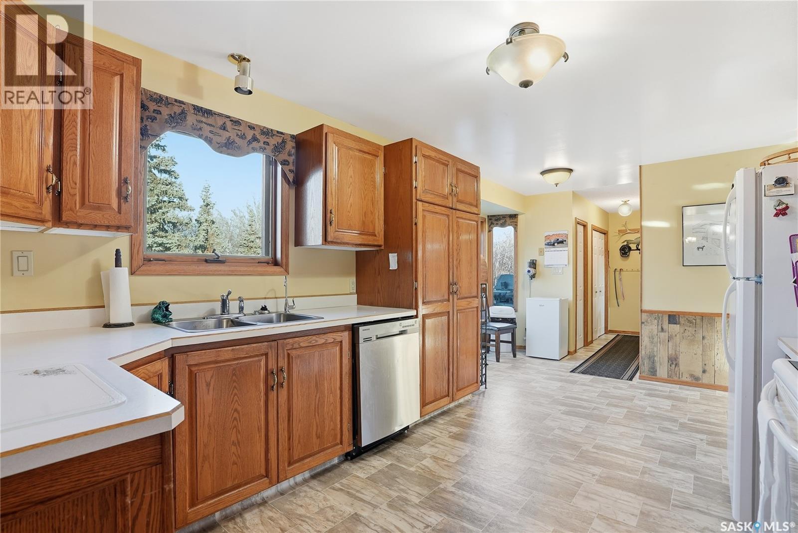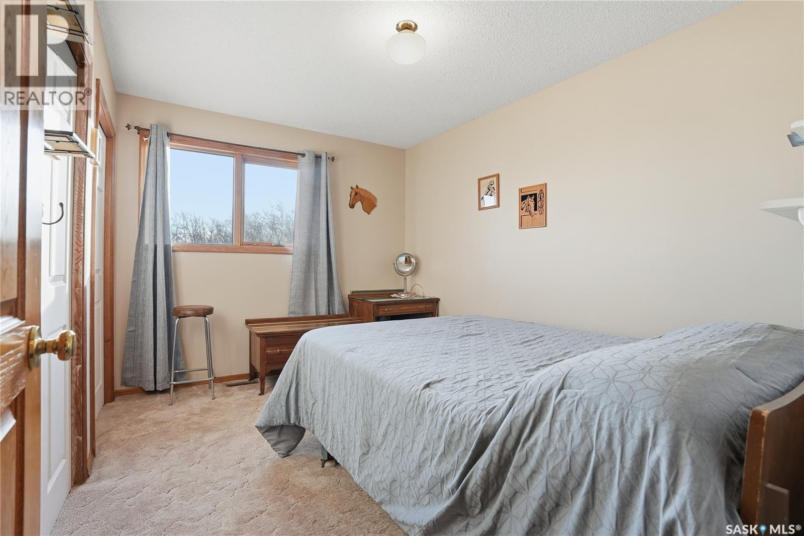 Only 6 km from Saskatoon’s city limits and a short 7 km bus ride to Montgomery School, the Merrill School Road Acreage blends wide-open country freedom with city convenience. Spanning 70 beautifully treed acres—with an additional 80 acres available directly behind for a full 150-acre package—this rare property is a private sanctuary surrounded by pasture, mature shelterbelts, and abundant wildlife. Ideal for horses, a hobby farm, or long-term investment, the back 80 acres are fully fenced and ready for hay or livestock, while the front features towering trees, a fenced garden, and pastures once home to sheep, pigs, horses, and cattle. Nestled among the trees, the 1838 sq ft raised bungalow exudes warmth and craftsmanship, with pristine oak cabinetry, vaulted ceilings, and maple hardwood floors. The bright country kitchen opens to a formal dining room with newer windows, creating an inviting family gathering space. The main floor offers three bedrooms—including a vaulted master with ensuite potential—a four-piece bath, and a second bath off the mudroom. The lower level adds more bedrooms and a non-conforming suite with its own kitchen, bath, laundry, and separate entrance—perfect for extended family or rental income (currently $1,000/month). The heated triple garage, with 11-foot walls, provides excellent space for vehicles or a workshop. Comforts include natural gas, central air, high-efficiency furnace (8 years old), backup generator, soft water from a reliable well, large hot water tank, and septic pump-out system. Outside, enjoy the sturdy deck, fenced backyard, corrals, and open space to roam. Power is underground to the front parcel, and the sandy, well-draining soil with its mix of pasture and trees makes this land ideal for countless uses. Properties of this size and seclusion, yet so close to the city, are seldom found—Merrill School Road Acreage offers the space to grow, breathe, and live your country dream. (id:44393)