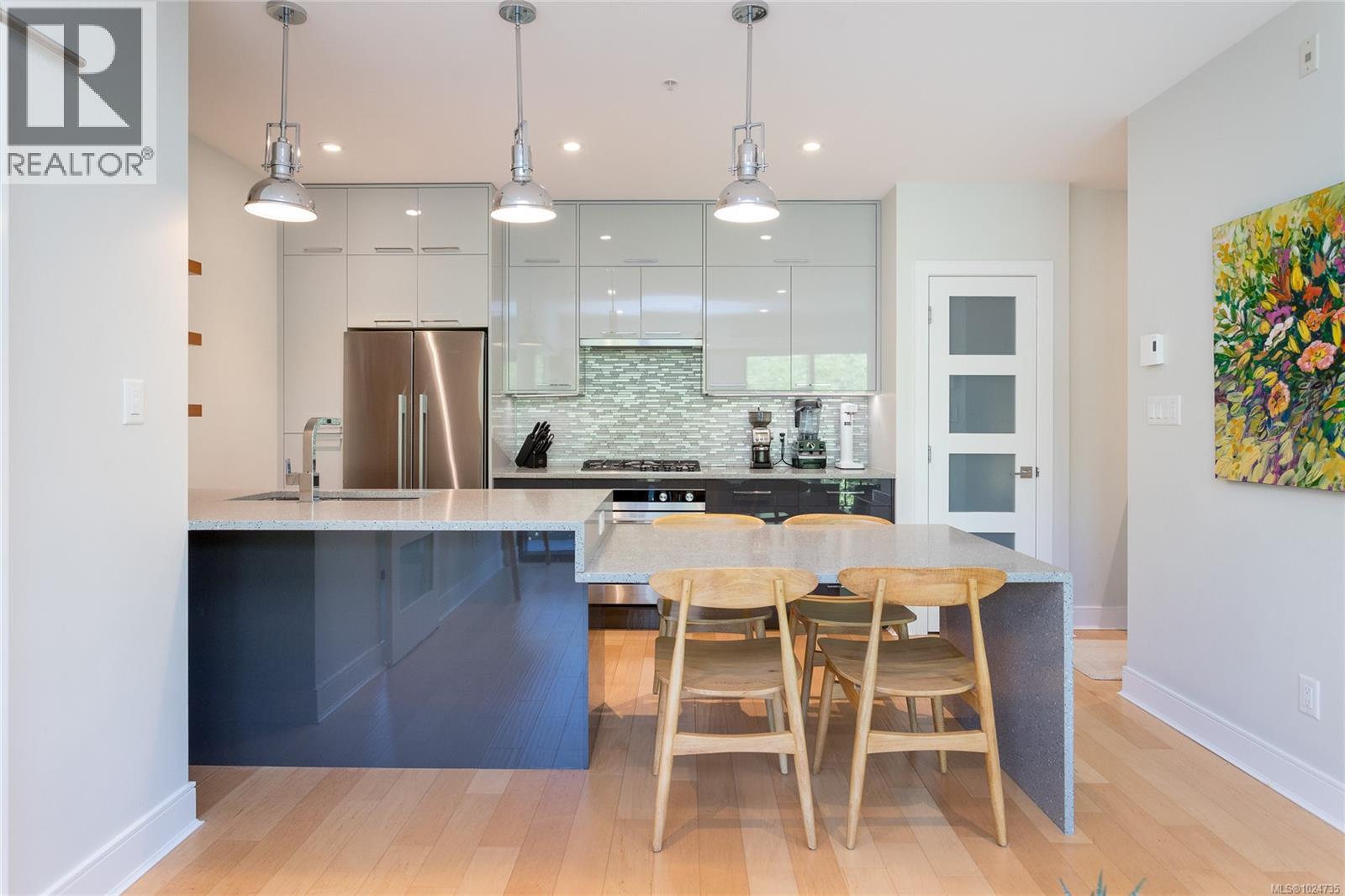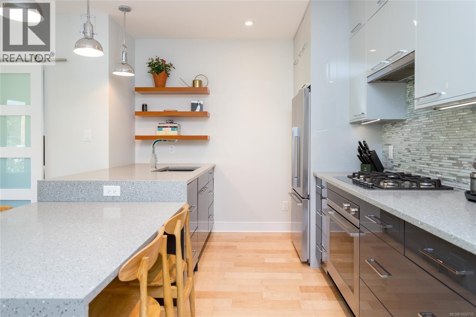 $501 MonthlyWelcome to The Wade—a sophisticated, 2021-built low-rise steel and concrete building that combines modern design with lasting quality. This top-floor corner unit offers over 750 sq. ft. of bright, thoughtfully designed living space with large windows & serene park views. Open-concept layout features a gourmet kitchen with quartz countertops, stainless steel appliances including a gas cooktop, two toned full-height modern cabinetry & large island with an eating bar—perfect for entertaining. Primary bedroom includes walk-in closet and ensuite with heated tile floor. Additional highlights include in-suite laundry, second full bathroom with heated tile floors, private balcony with a gas BBQ hookup and abundant natural light throughout. Enjoy access to a stunning rooftop terrace with sweeping city views plus your own garden plot and private peaceful courtyard. Well run strata welcomes 2 dogs (any size) with access to secure underground parking, separate storage locker & bike room. Ideally located close to downtown, with easy access to shopping, dining, and transit— urban living at its best. (id:44393)